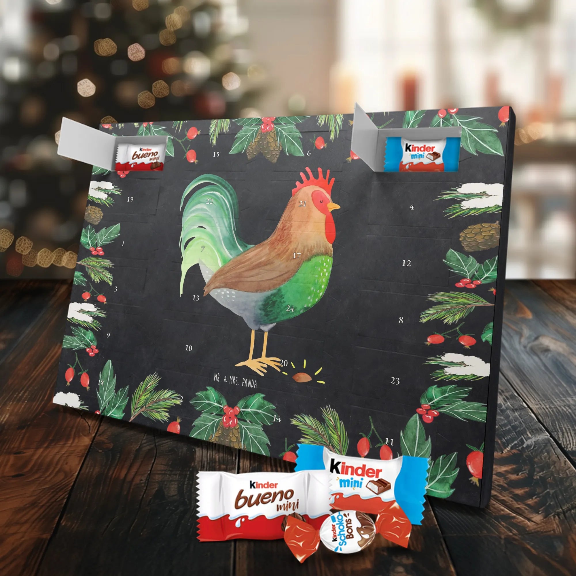 Wunderschöner Schoko Adventskalender von Mr. & Mrs. Panda – perfekt, wenn du die Vorweihnachtszeit mit einem liebevoll gestalteten Kalender versüßen möchtest. Unser Kalender ist bedruckt mit wunderschönen Motiven & Sprüchen von Mr. & Mrs. Panda und eignet sich hervorragend als Geschenk für Freunde, Familie oder einfach für dich selbst. Er ist nicht personalisierbar, dafür aber mit viel Liebe zum Detail gestaltet. Die brillante Druckqualität mit seidenmatter Oberflächenveredelung sorgt für edles Aussehen, und die bedruckten Seitenflächen geben dem Kalender einen wertigen Gesamteindruck. Maße: 355 mm x 245 mm x 11 mm. Besonderheit: kann aufgehängt oder aufgestellt werden – so findest du immer den perfekten Platz bei dir zuhause. Gefüllt mit Markenname Schokolade: Adventskalender gefüllt mit kinder® Schokolade. Inhalt: kinder® Schoko-Bons, kinder® Bueno mini und kinder® Schokolade mini. Der Kalender bietet 24 Türchen mit kleinen Überraschungen, die Kinderherzen höherschlagen lassen und Erwachsene schmunzeln. Er ist robust verarbeitet und ideal für den täglichen Genuss in der Adventszeit. Ob dekorativ auf der Kommode oder an der Wand aufgehängt – er bringt Freude und süße Momente in die Vorweihnachtszeit. Bestelle jetzt und mach dir oder deinen Lieben die Adventszeit ein bisschen süßer!