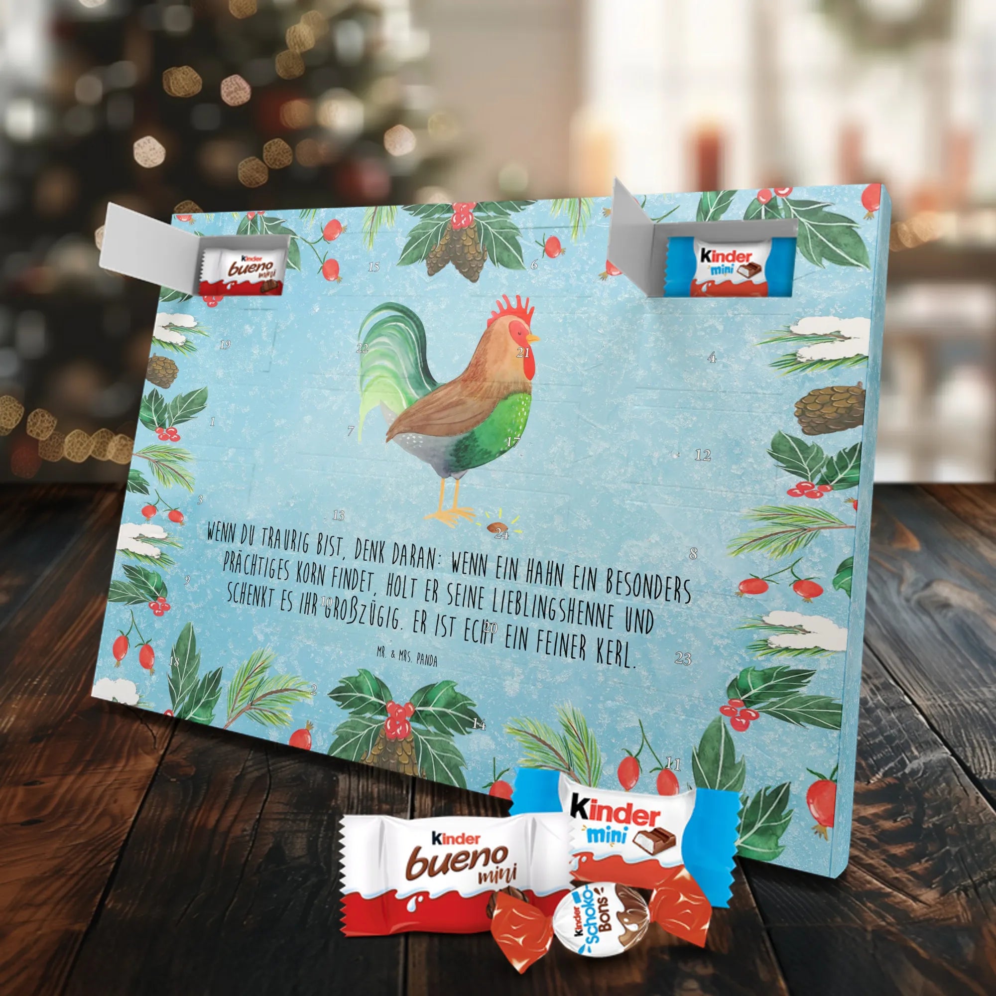 Unser Schokoladen Adventskalender von Mr. & Mrs. Panda bringt Charme und süße Überraschungen in deine Adventszeit. Liebevoll bedruckt mit wunderschönen Motiven & Sprüchen von Mr. & Mrs. Panda, ist dieser Kalender nicht personalisierbar, dafür aber mit hochwertiger Verarbeitung und stimmigem Design. Die brillante Druckqualität mit seidenmatter Oberflächenveredelung verleiht jedem Motiv eine edle Optik, und die bedruckten Seitenflächen runden das Gesamtbild ab. Maße: 355 mm x 245 mm x 11 mm. Eine praktische Besonderheit: kann aufgehängt oder aufgestellt werden – so passt er perfekt in jede Deko. Gefüllt mit Markenname Schokolade: Adventskalender gefüllt mit kinder® Schokolade. Inhalt: kinder® Schoko-Bons, kinder® Bueno mini und kinder® Schokolade mini. Mit 24 kleinen Leckereien hinter den Türchen ist dieser Kalender ideal für Kinder und alle Naschkatzen. Er eignet sich wunderbar als Adventsgeschenk oder als liebevolle Aufmerksamkeit für Kollegen und Freunde. Gönn dir oder anderen eine süße Adventszeit mit diesem bezaubernden Schokoladen Adventskalender!
