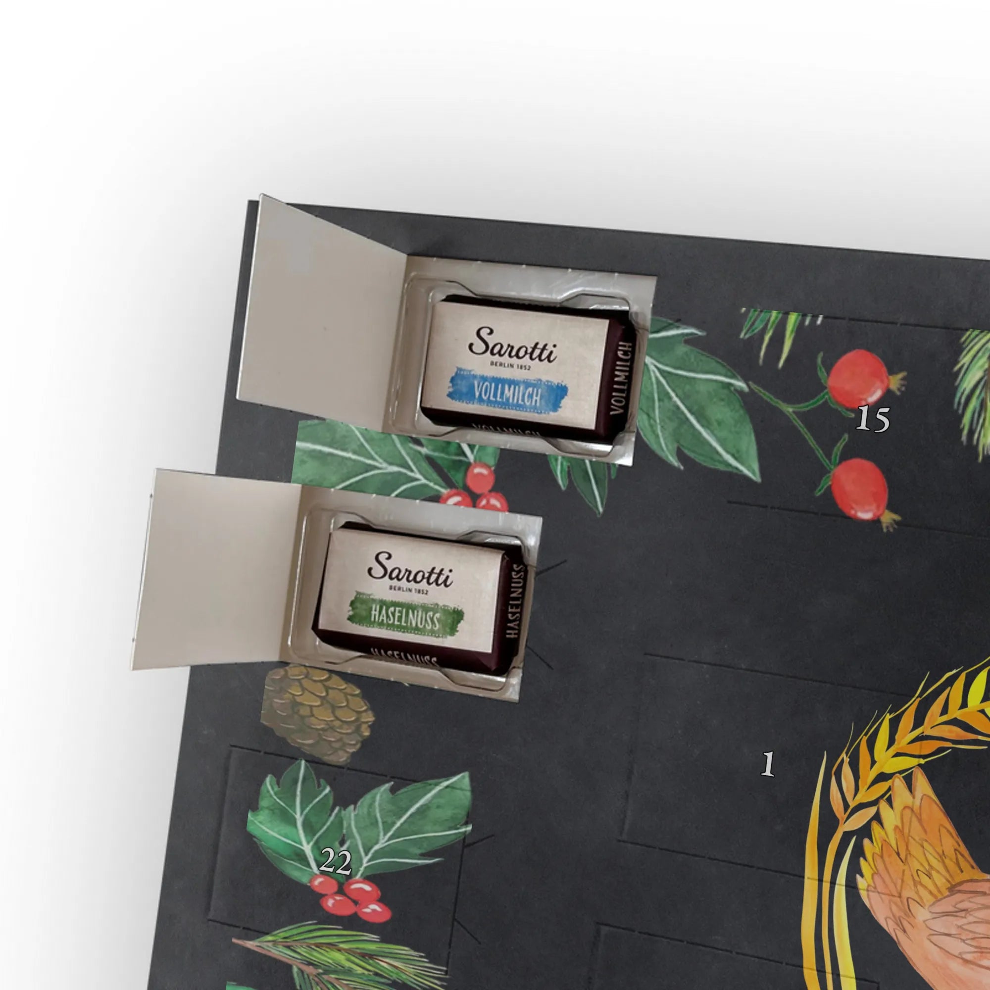 Mach die Vorweihnachtszeit besonders süß mit unserem Schoko-Adventskalender von Mr. & Mrs. Panda. Fröhliche Illustrationen und liebe Sprüche schmücken Vorder- und Seitenflächen, gedruckt in brillanter Qualität und veredelt mit einer seidenmatten Oberfläche für ein warmes, elegantes Finish. Der Kalender ist nicht personalisierbar, überzeugt dafür durch praktische Nutzung: zum Aufhängen oder Aufstellen geeignet. Hinter den 24 Türchen verbergen sich einzeln verpackte Schokoladentäfelchen in vier köstlichen Geschmacksrichtungen – Vollmilch, Nougat, Zartbitter und Haselnuss – von Sarotti® und Confiserie Heidel®. Insgesamt liefert der Kalender 107 g Markenschokolade. Maße: 355 mm x 245 mm x 11 mm – ideal, um Adventsfreude dekorativ zu präsentieren. Verschenke Liebe und Genuss in einem schönen Design, das sich wunderbar in jede Weihnachtsecke einfügt. Mr. & Mrs. Panda wünscht dir eine gemütliche Adventszeit voller kleiner, süßer Überraschungen.
