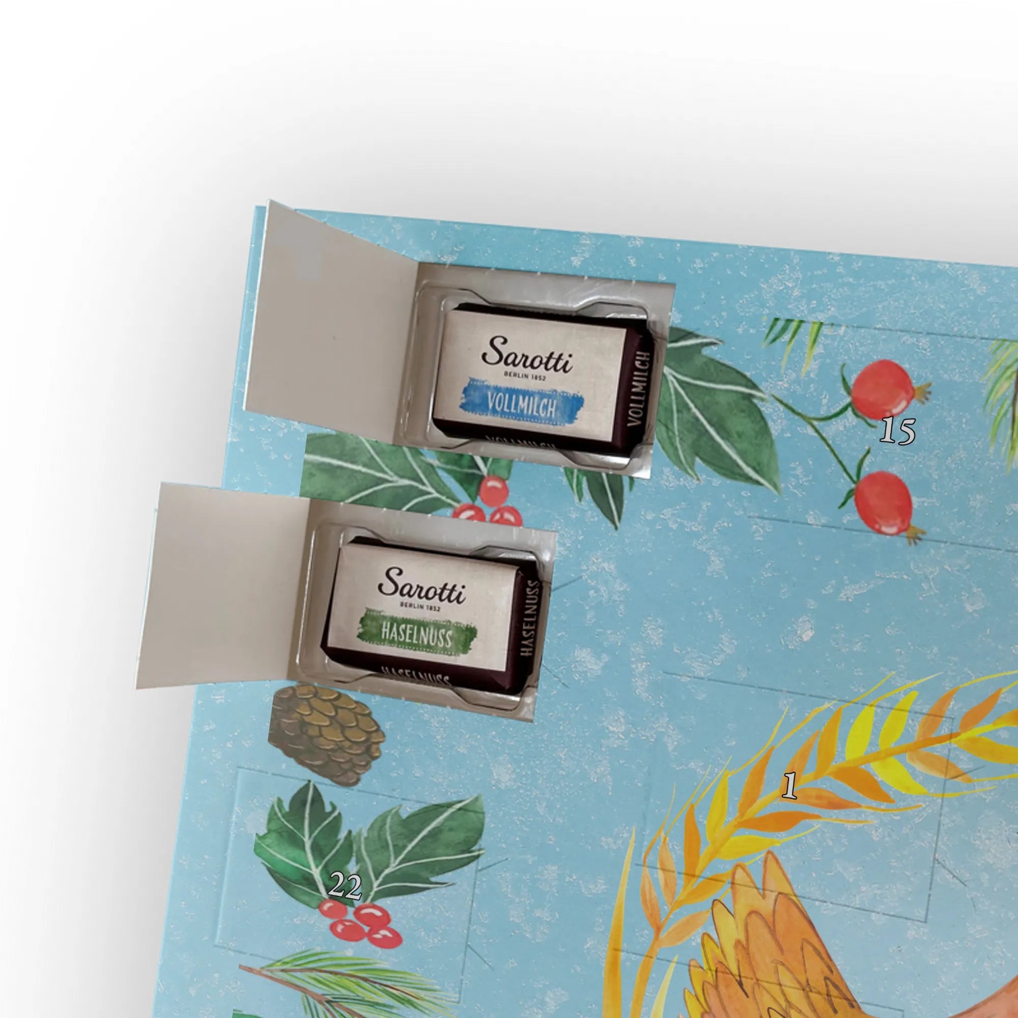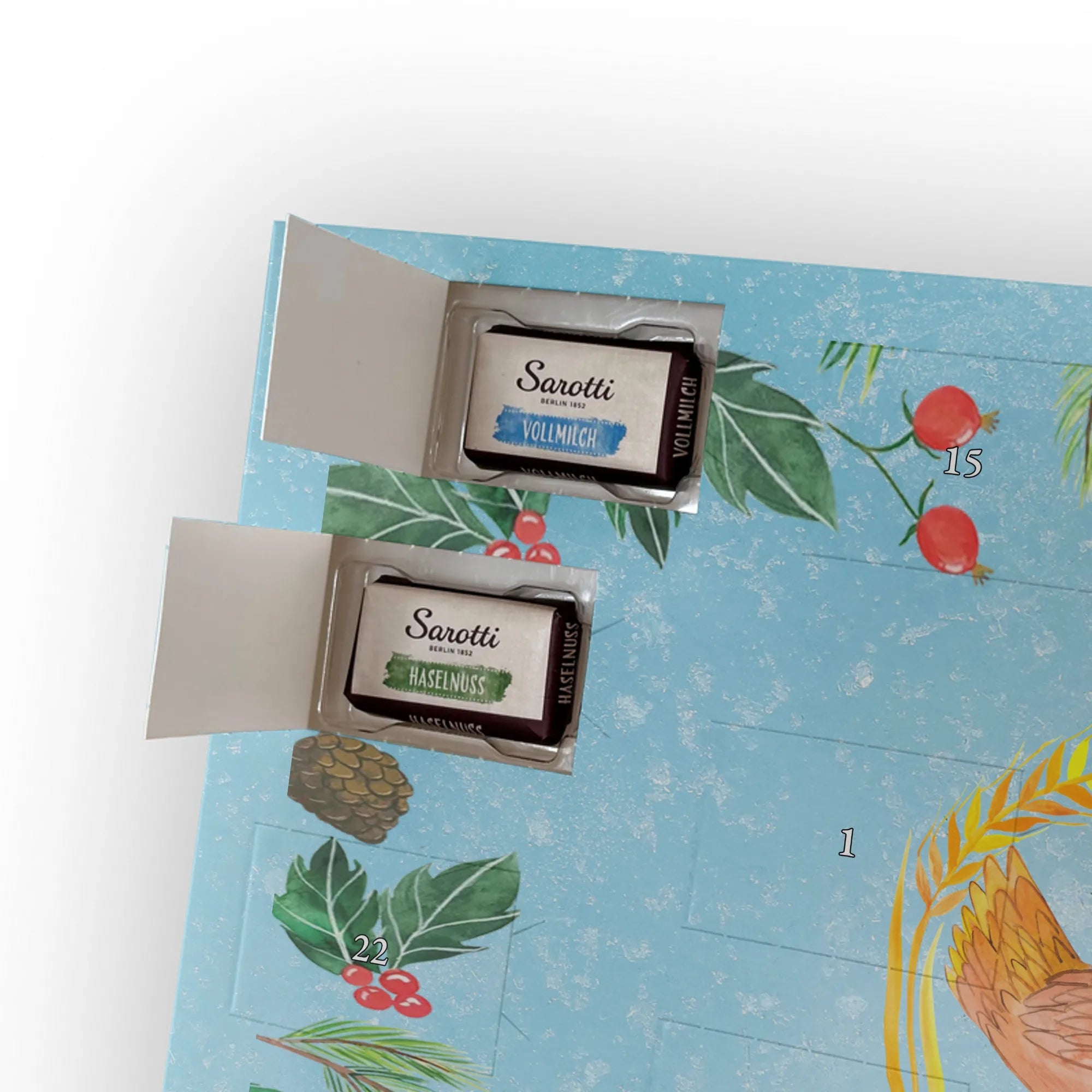 🐼 Schoko-Adventskalender: Liebevolles Design, seidenmatt, brillanter Druck – ein Hingucker.