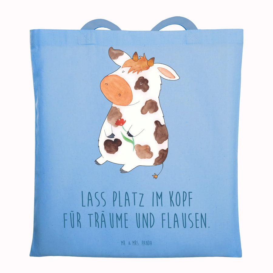 Himmelblau, eine verträumte Kuh mit Blume und der liebevolle Spruch „Lass Platz im Kopf für Träume und Flausen.“ – diese Tragetasche vereint Nostalgie, Landgefühl und verspielte Leichtigkeit. Das Motiv wurde von Mrs. Panda per Hand aquarelliert und bringt eine warme, persönliche Note in deinen Alltag. 🌼🐄
