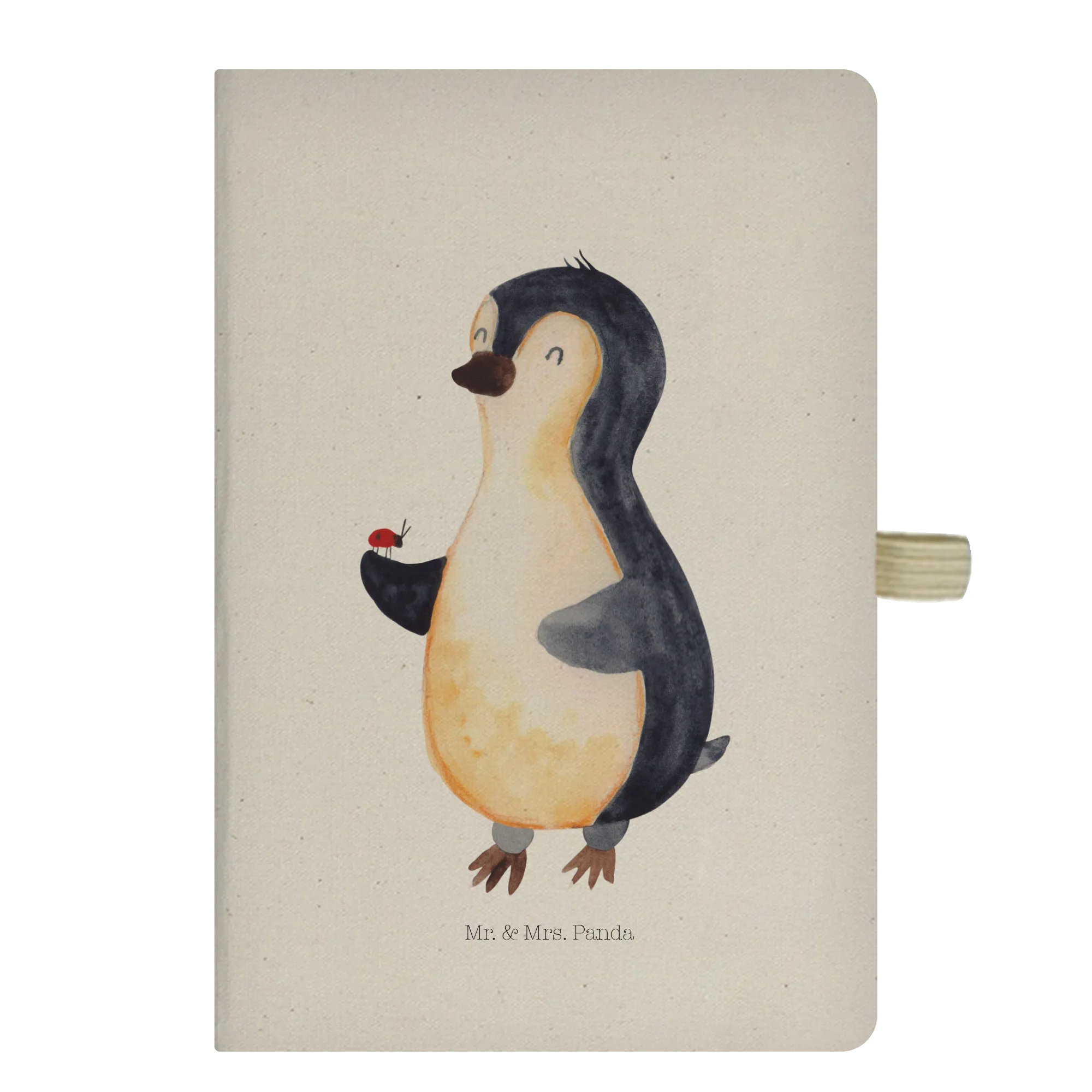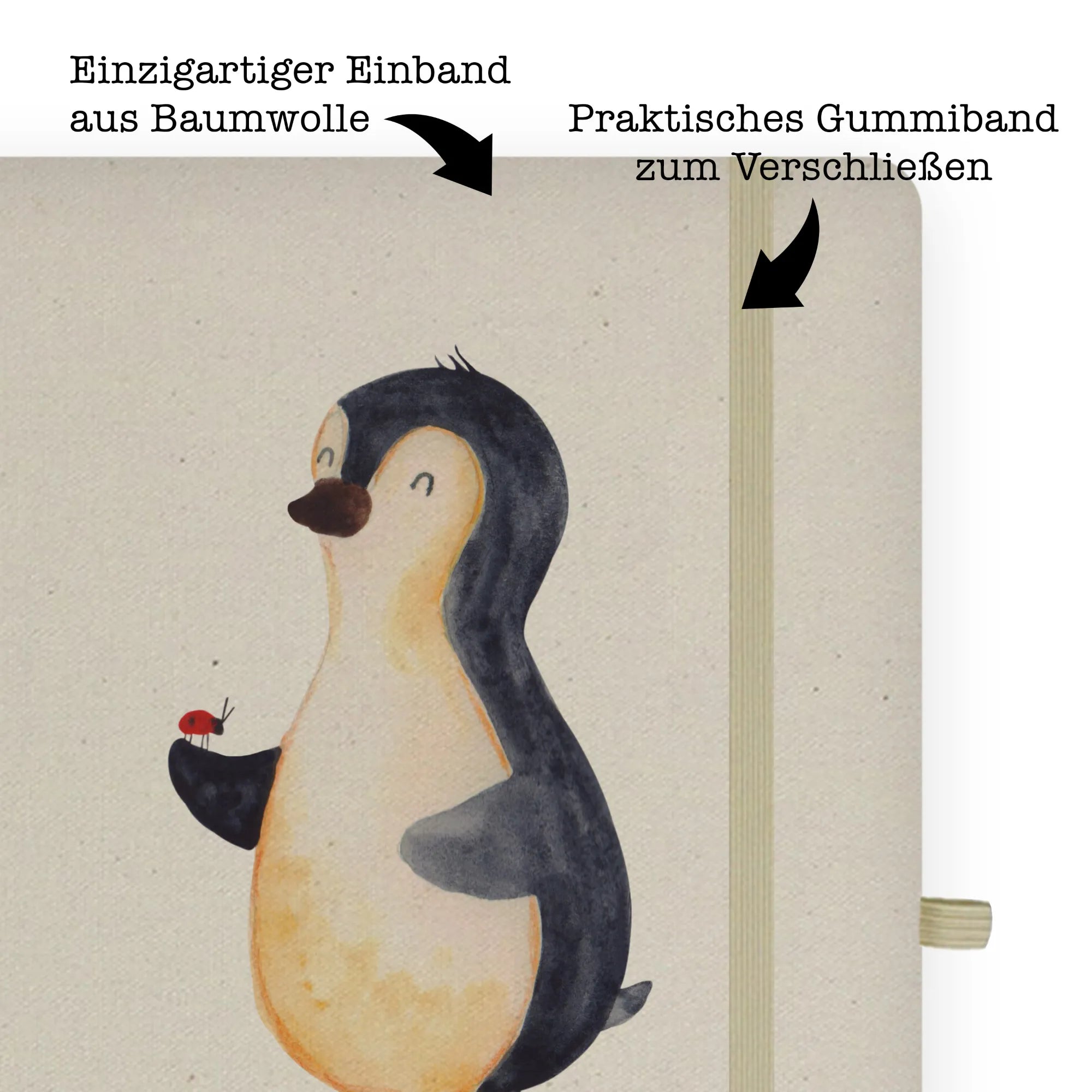 Entdecke das charmante DIN A5 Baumwoll Notizbuch mit dem fröhlichen Pinguin und dem süßen Marienkäfer aus der Pinguin-Kollektion von Mr. & Mrs. Panda! Dieses wunderschöne und edle Baumwollnotizbuch ist mehr als nur ein einfaches Schreibbuch; es ist der perfekte Begleiter für alle kreativen Köpfe und Nachwuchsautoren!