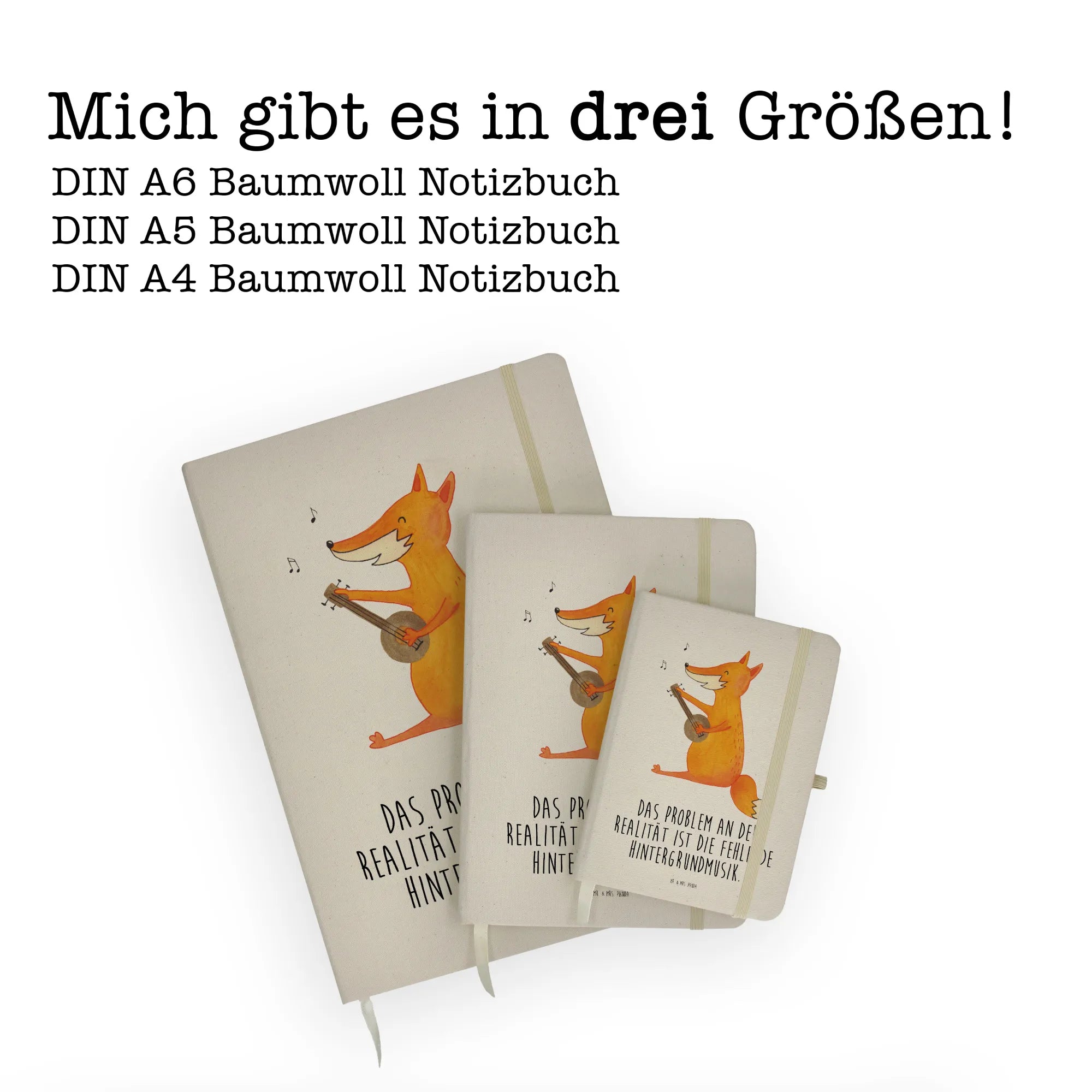 Die Fuchs Kollektion von Mr. & Mrs. Panda bringt die schlauen und geselligen Eigenschaften dieser wunderschönen Waldtiere zum Leben. Mit dem inspirierenden Spruch "Das Problem an der Realität ist die fehlende Hintergrundmusik" wird jede Seite deines Notizbuchs zum Platz für Musikalität und Kreativität. Das Hardcover ist aus hochwertiger Baumwolle gefertigt und schützt deine Notizen, sodass du sie überallhin mitnehmen kannst.