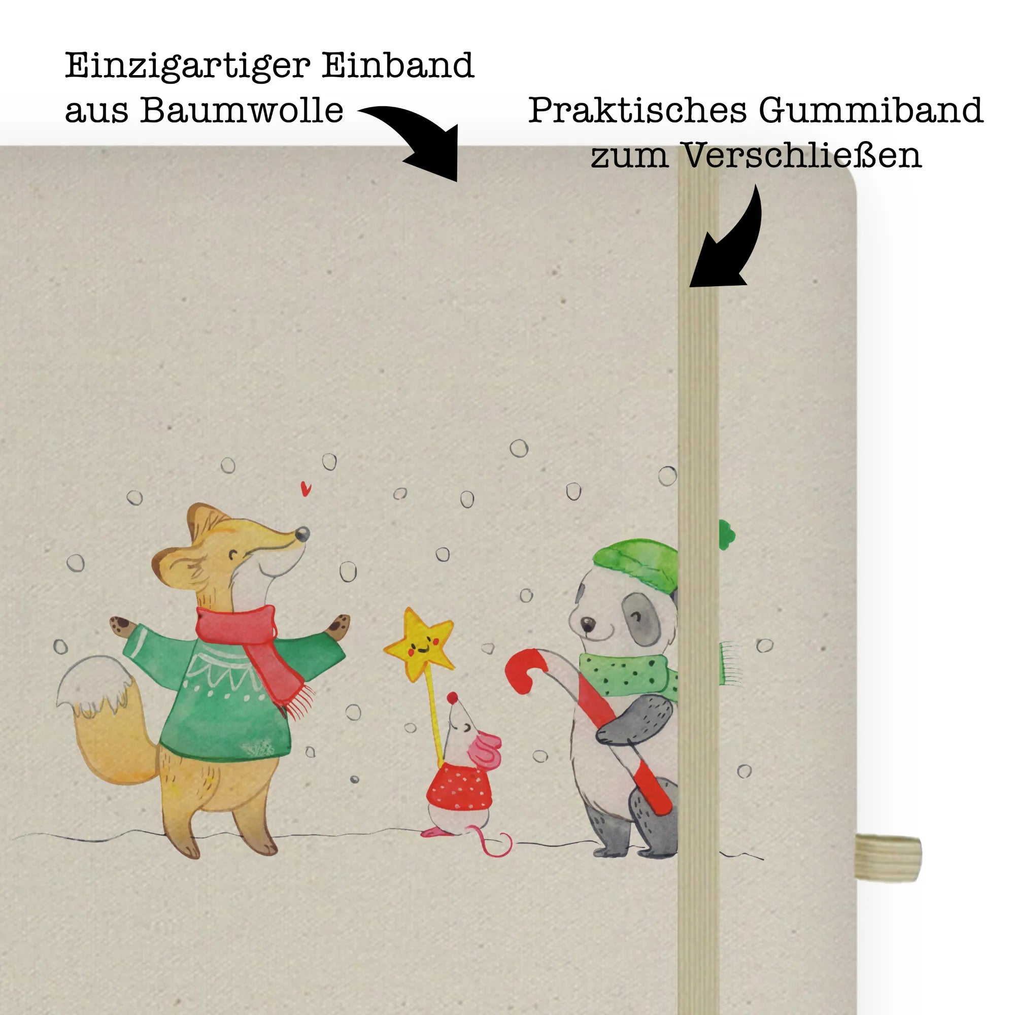 Juhuuu, es ist Weihnachten! Unser DIN A4 Baumwoll Notizbuch „Winter Weihnachtsfreude“ aus der Winter Kollektion von Mr. & Mrs. Panda bringt Weihnachtszauber in deinen Alltag. Auf dem liebevoll bedruckten Stoffeinband stehen ein Fuchs, eine Maus und ein Panda mit Schal und Mütze im Schnee und lächeln der Adventszeit entgegen. Der fröhliche Spruch „Juhuuu, es ist Weihnachten! Ich wünsche dir und deiner Familie ein wundervolles Fest und eine Keksdose, die nie leer geht.“ macht dieses Notizbuch zum perfekten Weihnachtsgeschenk.