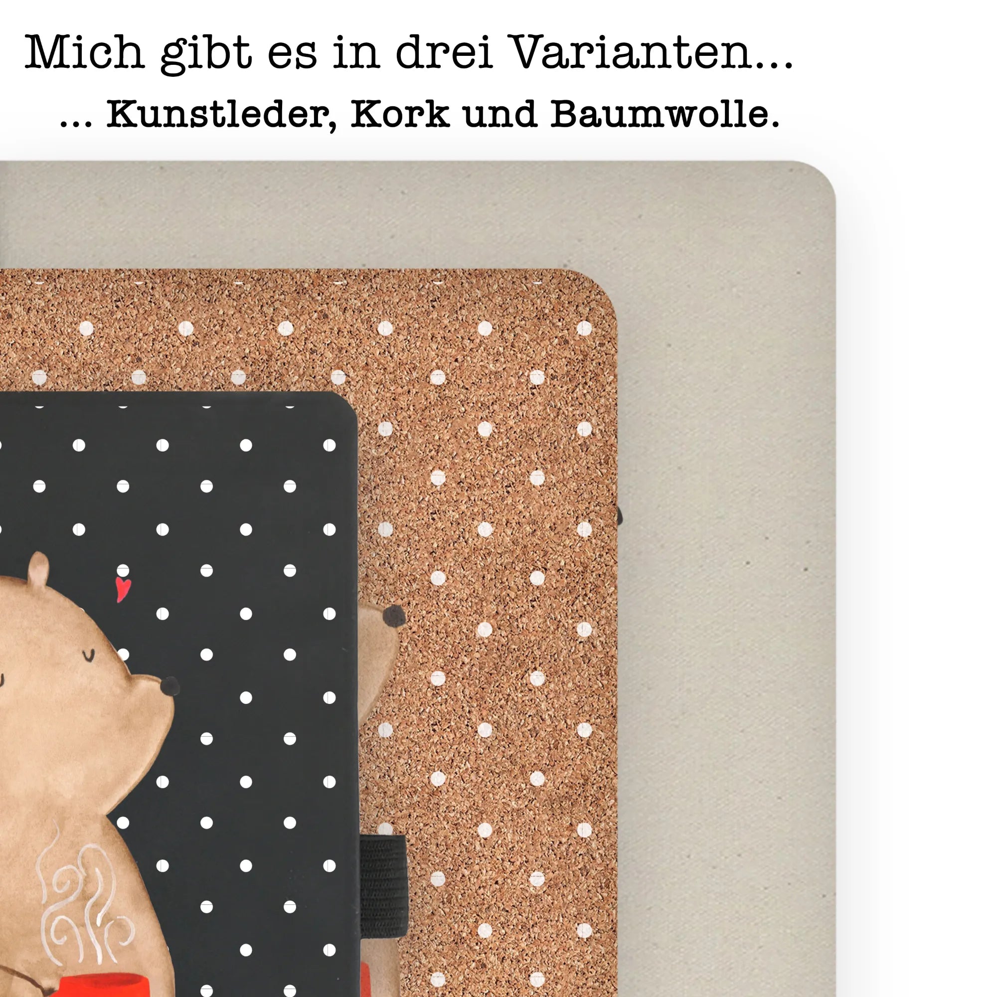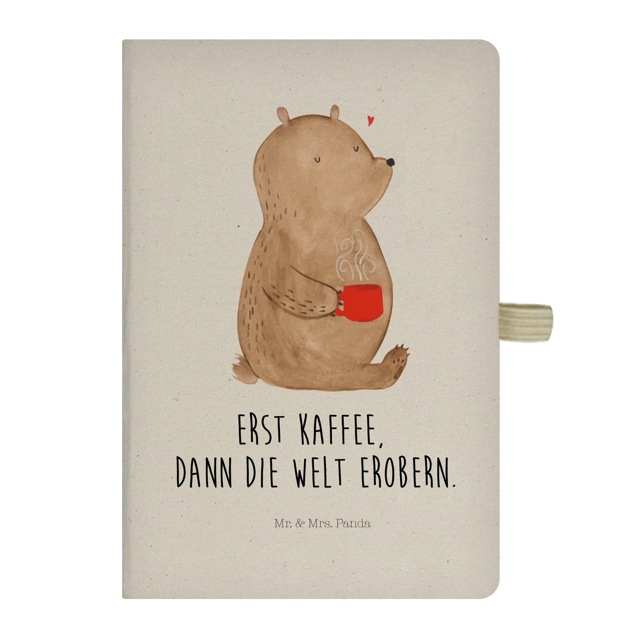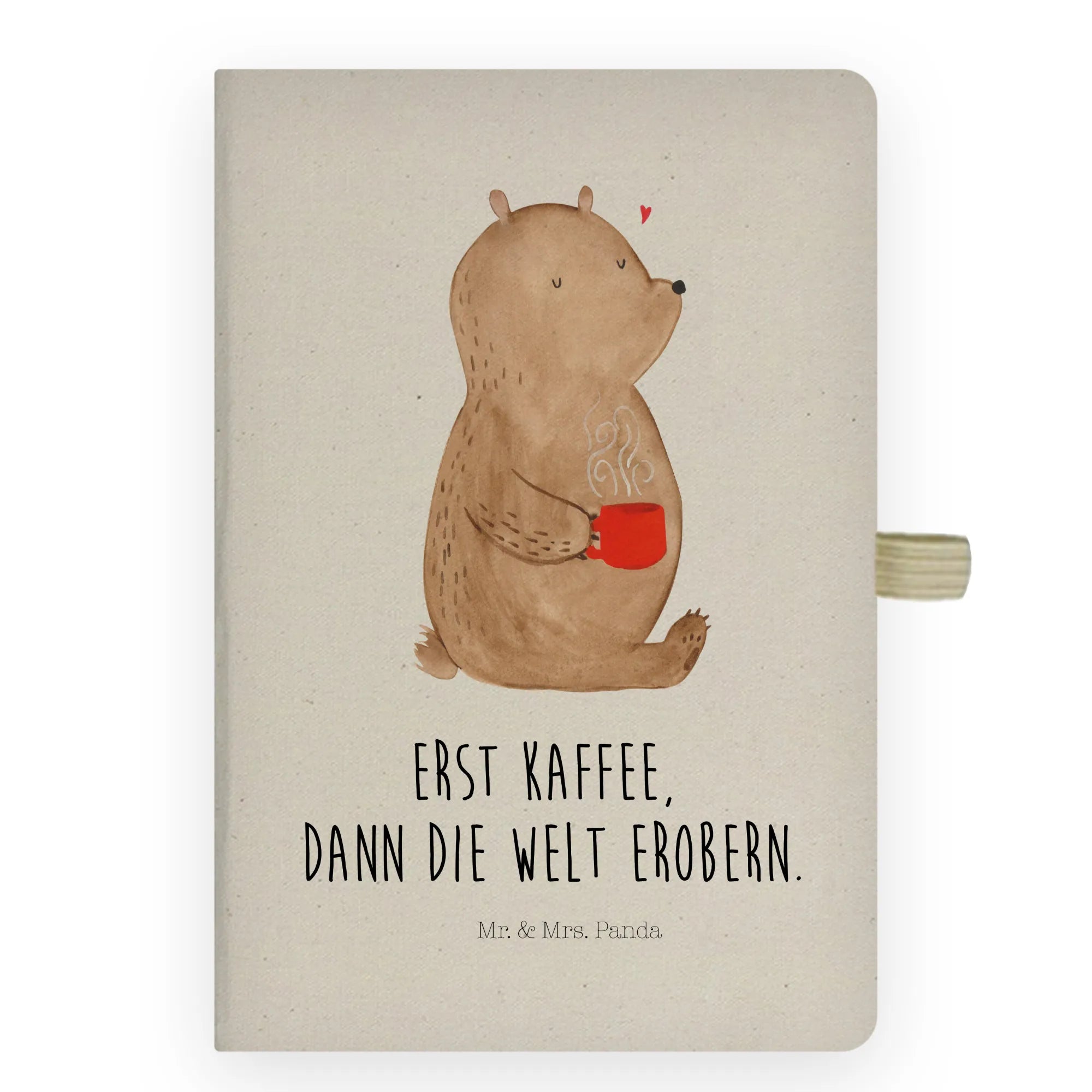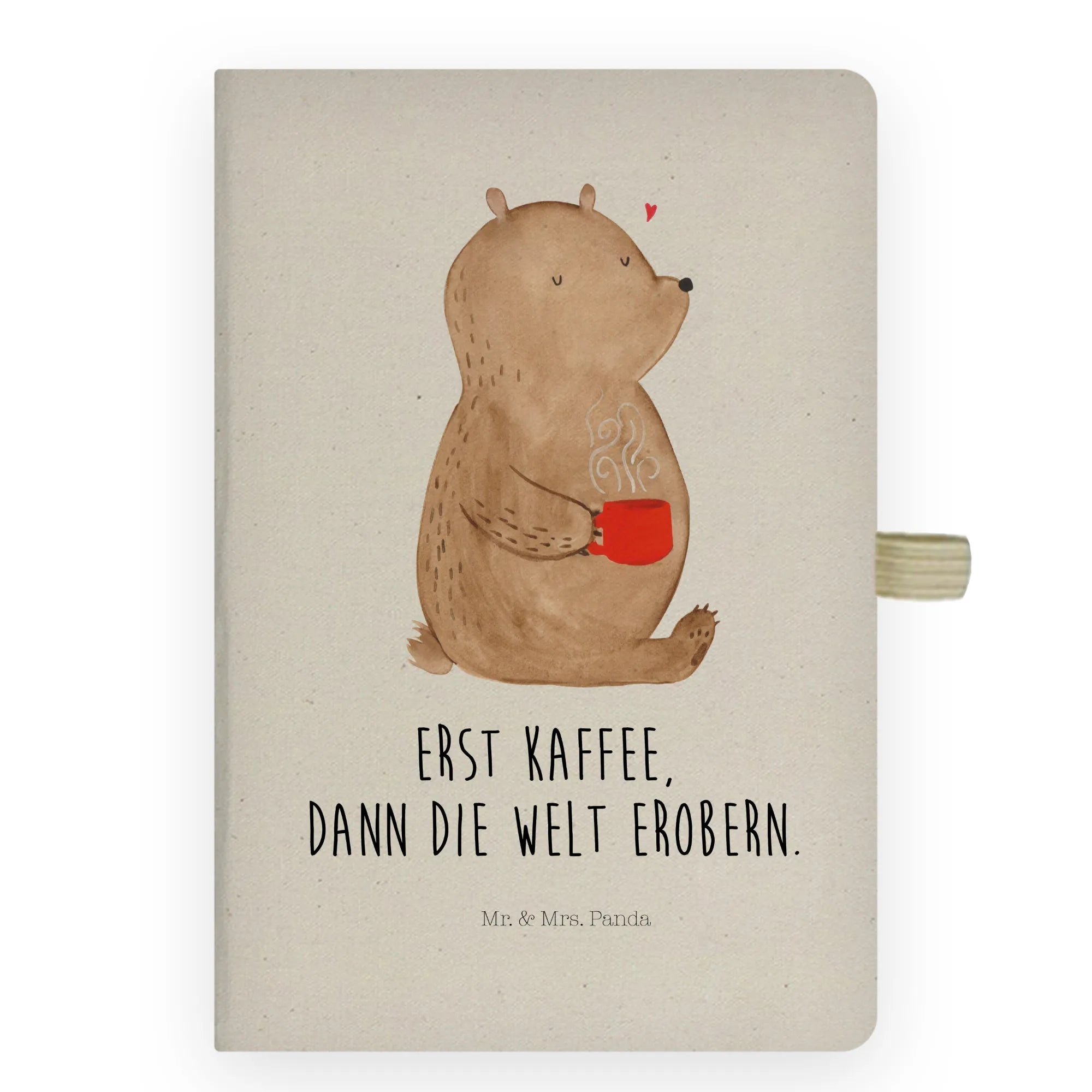 Das DIN A4 Baumwoll Notizbuch mit dem süßen Bärenmotiv "Kaffee" von Mr. & Mrs. Panda ist das perfekte Geschenk für all diejenigen, die den Magischen Moment von frisch gebrühtem Kaffee lieben und Inspiration in ihren alltäglichen Gedanken festhalten möchten. Stell dir vor: Morgens sitzt du an deinem Tisch, nippst an deinem Lieblingskaffee und betrachtest diesen entzückenden Bären, der genüsslich eine Tasse Kaffee genießt sowie mit dem Spruch "Erst Kaffee, dann die Welt erobern" deinen Tag bereits bei jedem Blick bereichert.
