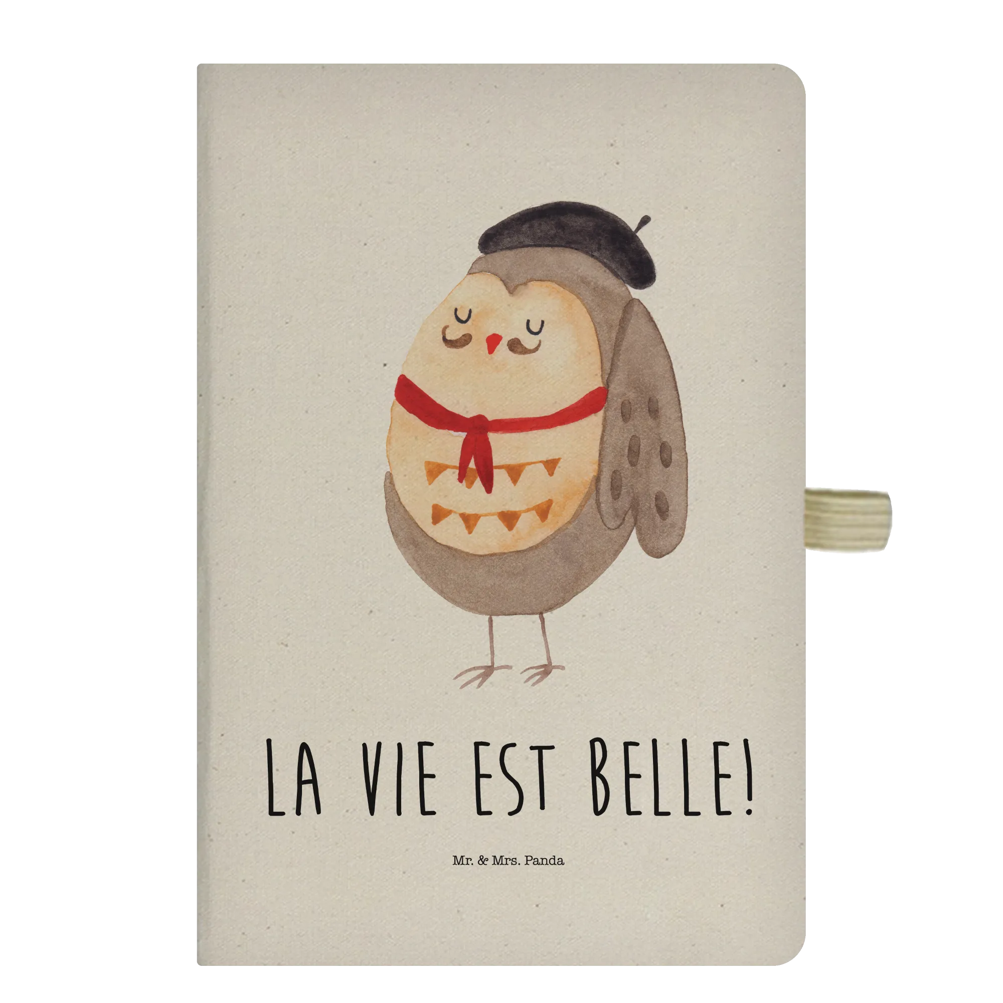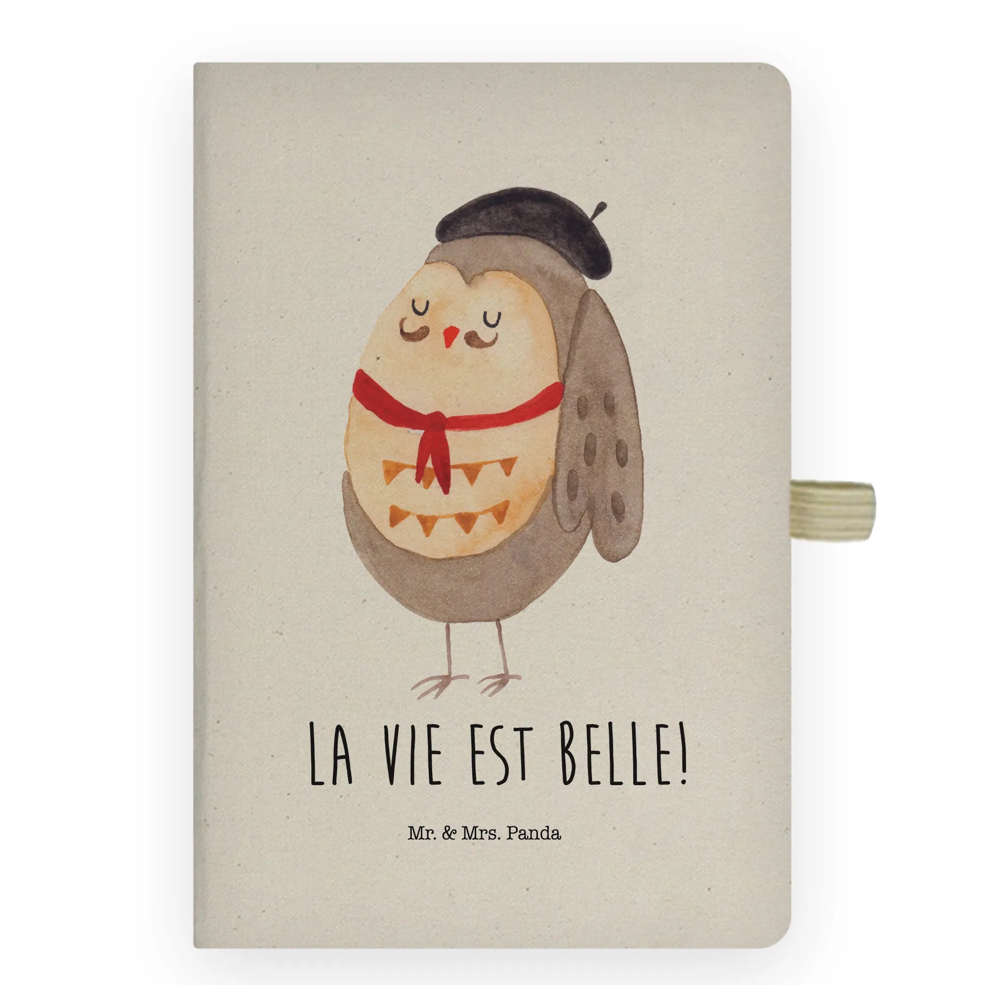 Das DIN A6 Baumwoll Notizbuch Eule Französisch von Mr. & Mrs. Panda ist nicht nur ein praktischer Begleiter, sondern auch ein wunderschönes Geschenk für Eulen-Liebhaber und kreative Köpfe. Mit einem süßen Eulen-Motiv, das im französischen Stil gestaltet ist, bringt dieses Notizbuch einen Hauch von charmantem französischem Flair in dein Zuhause oder Büro. Die Eule präsentiert sich mit Hut, Fliege und Schnurrbart und verkörpert den sprichwörtlichen Lebensspruch 'La vie est belle!' – das Leben ist schön!