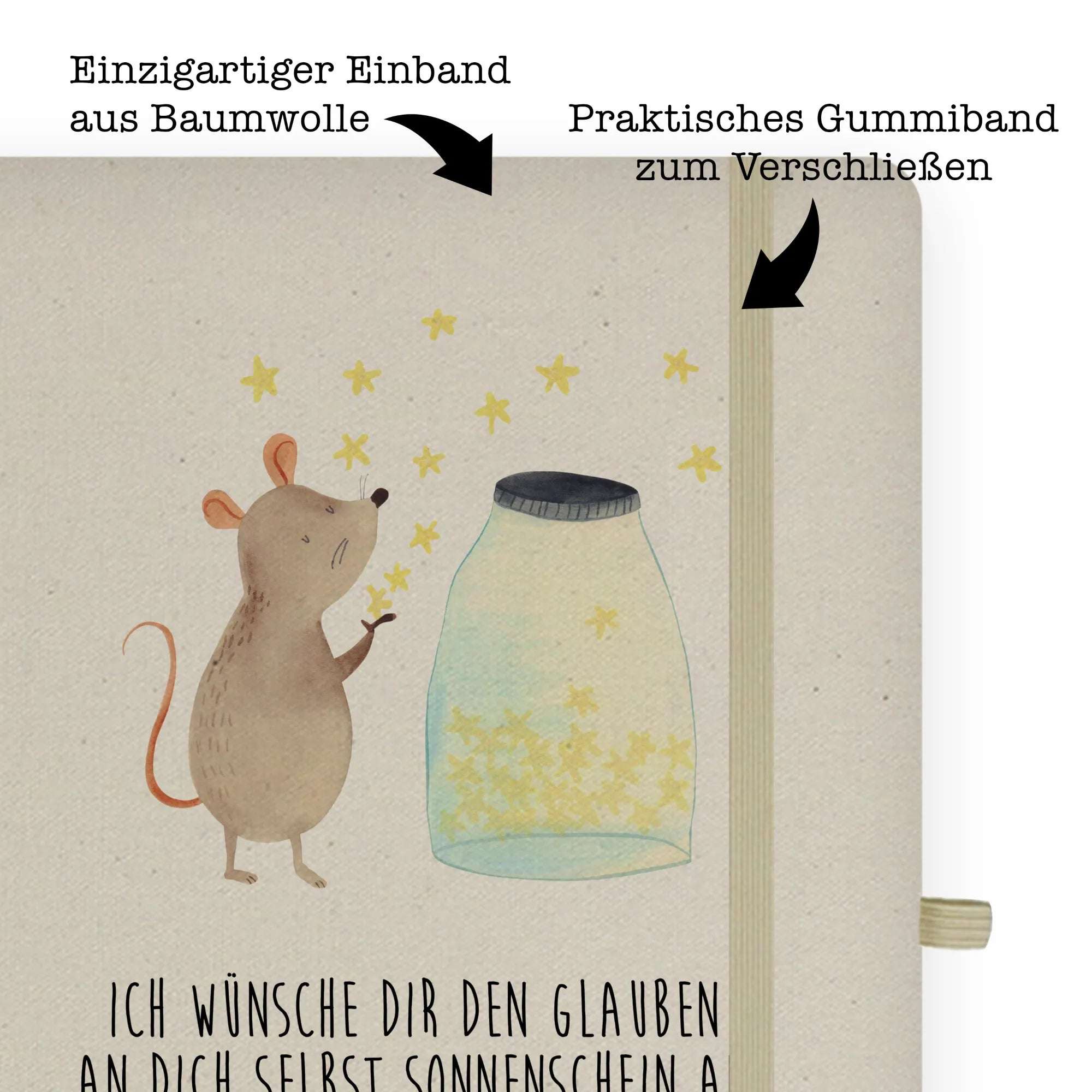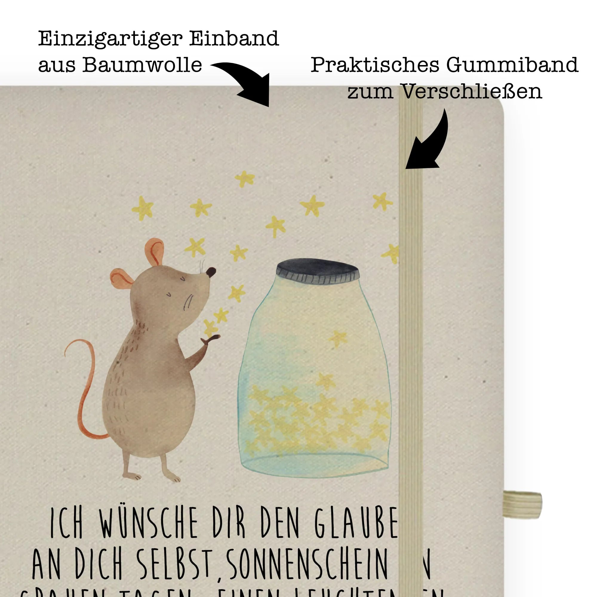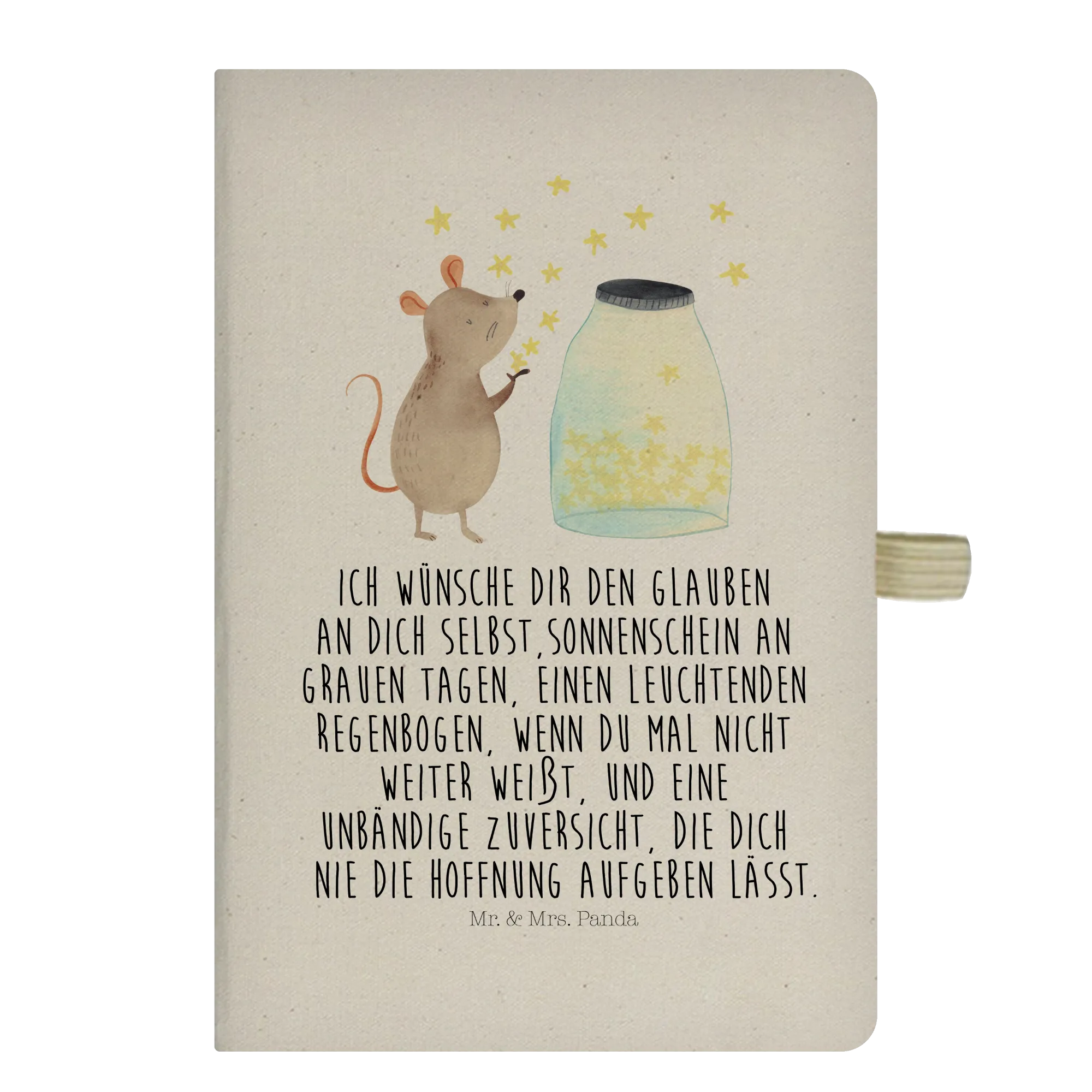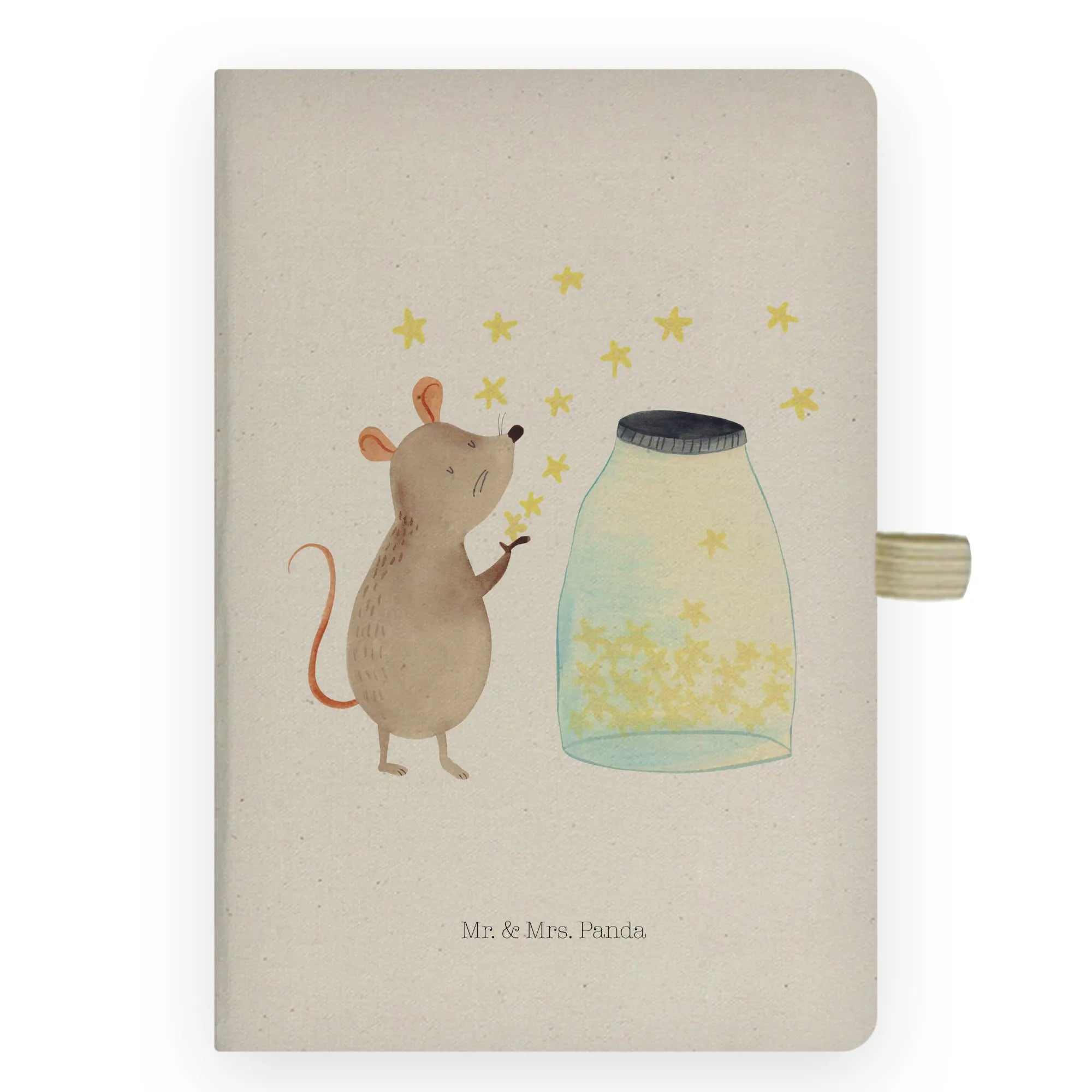 Das DIN A4 Baumwoll Notizbuch von Mr. & Mrs. Panda mit dem süßen Motiv Maus Sterne ist das perfekte Geschenk für kleine Träumer und große Abenteurer. Die niedliche Maus, die vor einem Glas voller funkelnder Sterne sitzt, inspiriert dazu, die eigenen Ideen und Träume festzuhalten.