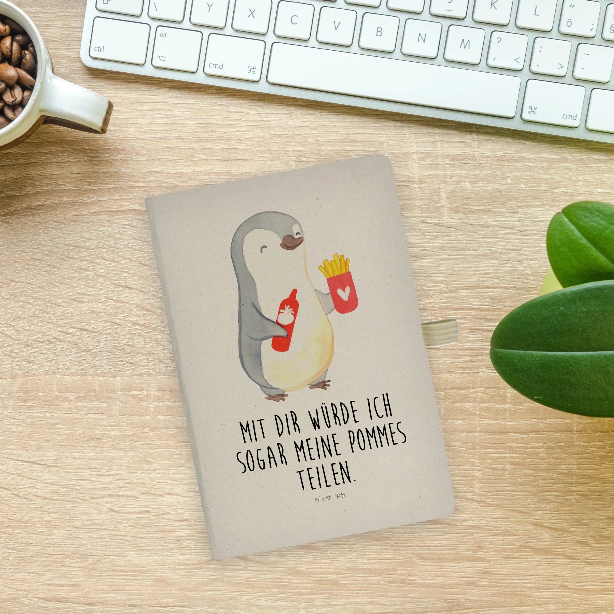 Das DIN A6 Baumwoll Notizbuch mit dem bezaubernden Pinguin Pommes Motiv aus der liebevollen Kollektion Liebe von Mr. & Mrs. Panda ist das perfekte Geschenk für jede Gelegenheit. Mit seinem einzigartigen Spruch "Mit dir würde ich sogar meine Pommes teilen" bringt es nicht nur ein Lächeln auf die Gesichter deiner Liebsten, sondern ist auch praktisch für all deine Gedanken, Notizen und Skizzen.
