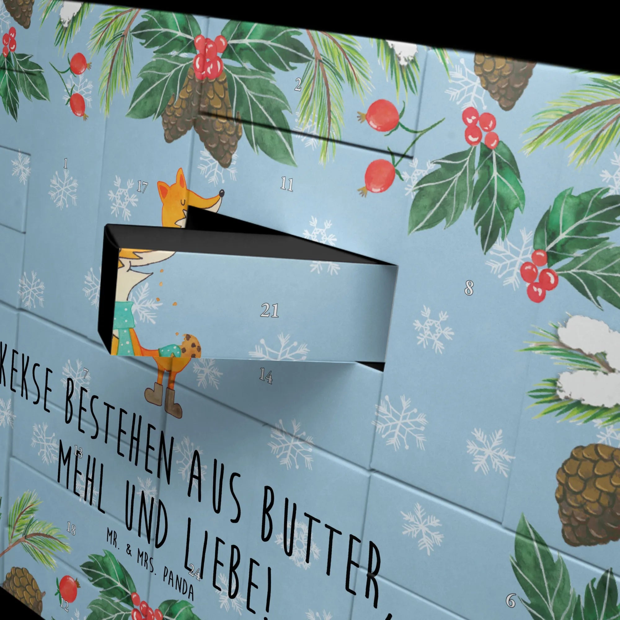 Jeder der 24 Fächer ist bereit, mit deinen Lieblingsleckereien gefüllt zu werden. Die süße Zeichnung eines kleinen, fröhlichen Fuchses auf der Frontseite zaubert dir und deinen Liebsten ein Lächeln ins Gesicht. Der Spruch 'Kekse bestehen aus Butter, Mehl und Liebe!' sorgt dafür, dass dieser Kalender nicht nur ein Dekorationselement, sondern auch eine Quelle der Freude und Wärme wird.