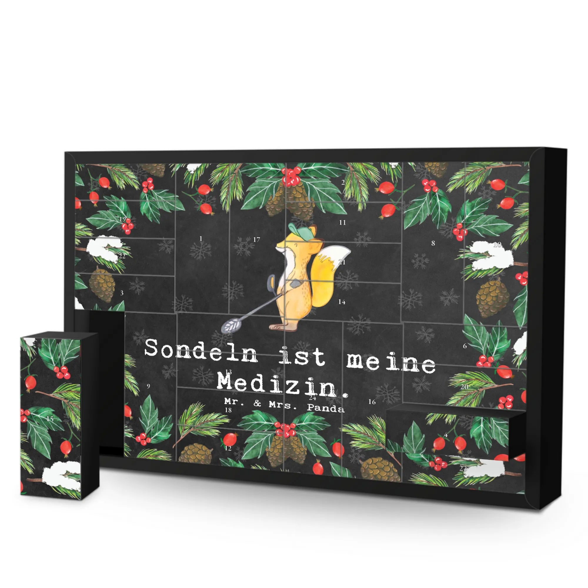 Der liebevoll gestaltete, befüllbare Adventskalender von Mr. & Mrs. Panda mit einem ganz besonderen Fuchs-Motiv, das den Slogan "Sondeln ist meine Medizin" trägt, ist das ideale Geschenk für alle Schatzsucher und Sondengänger da draußen! Ob du selbst ein leidenschaftlicher Münzensucher bist oder jemandem eine Freude machen möchtest, dieser Adventskalender bringt jeden Tag ein Stückchen Vorfreude und Freude in die Vorweihnachtszeit. Die Vorderseite ziert eine bezaubernde Zeichnung von Mrs. Panda, die dem Kalender einen unglaublichen Charme verleiht.
