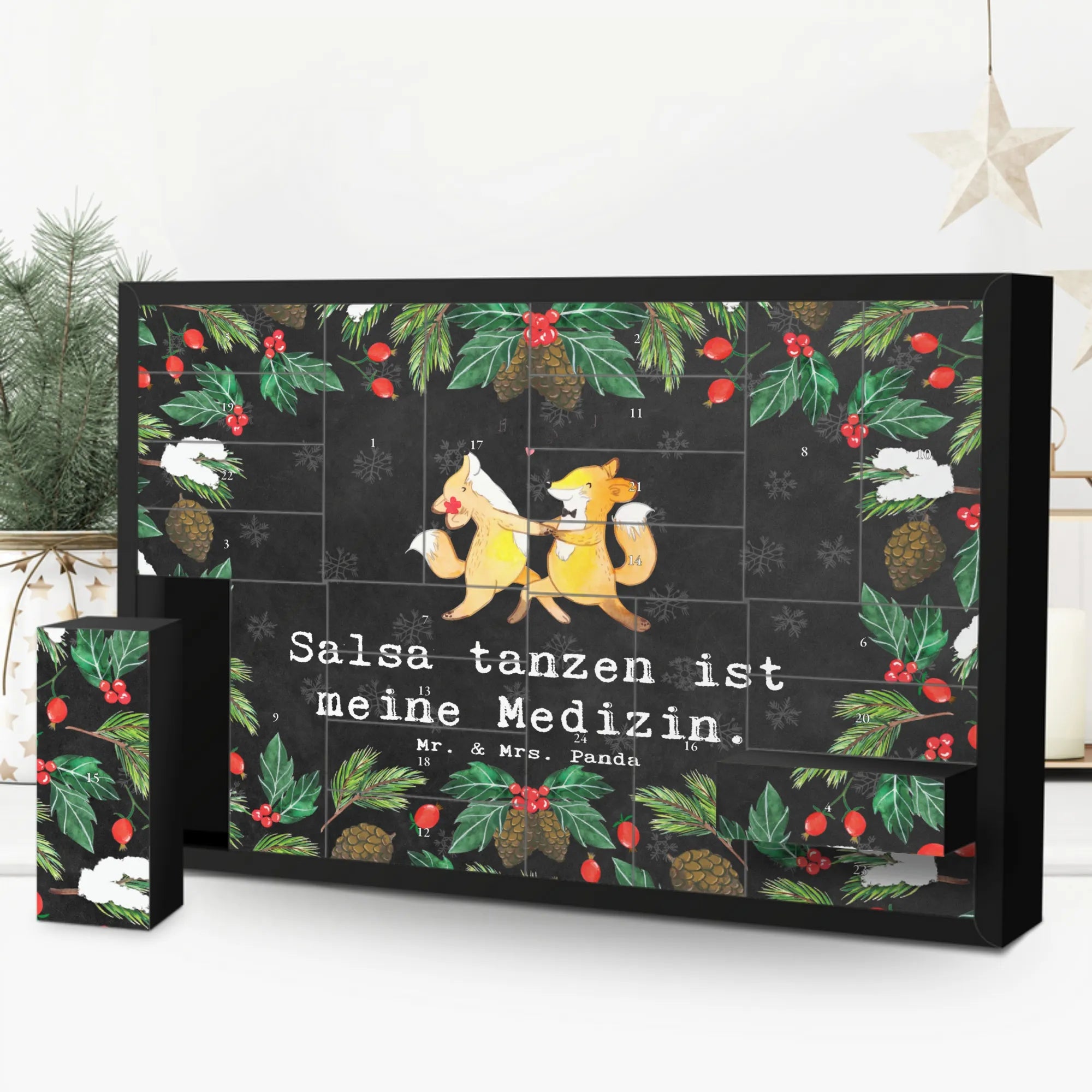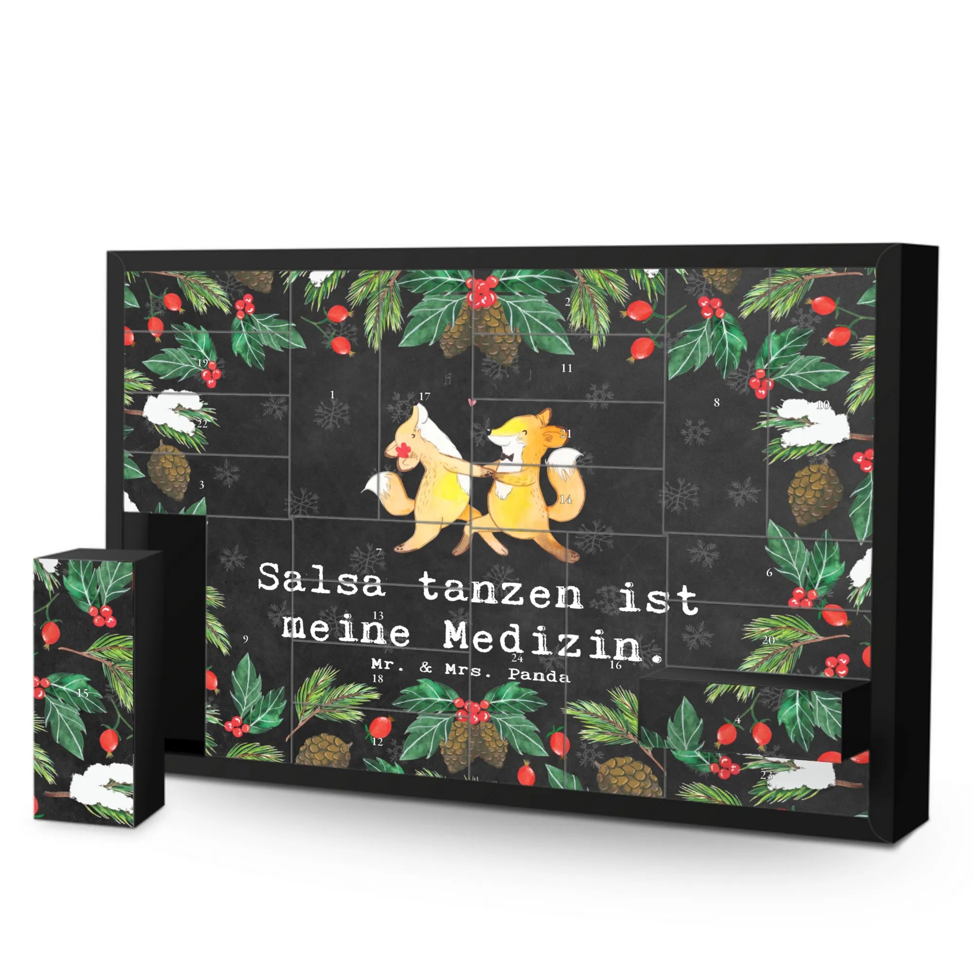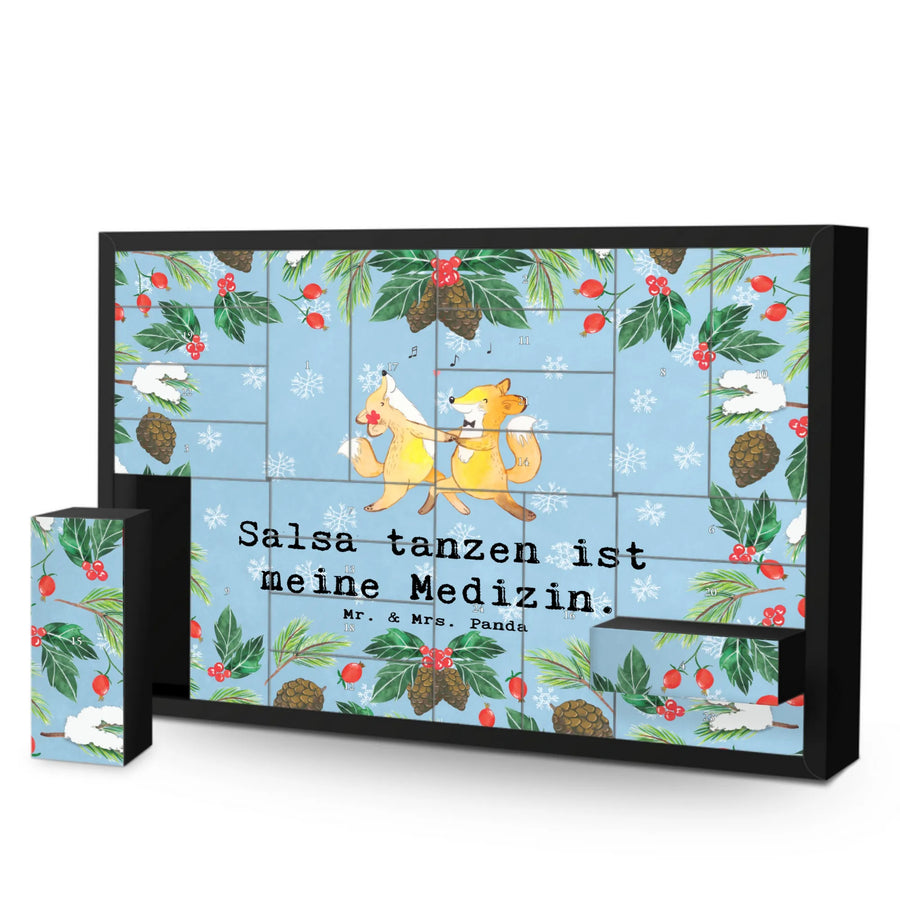Suchst du ein besonderes Geschenk für einen Tanzliebhaber? Unser befüllbarer Adventskalender mit dem liebevollen Motiv "Füchse Salsa tanzen Medizin" von Mr. & Mrs. Panda ist die perfekte Wahl!