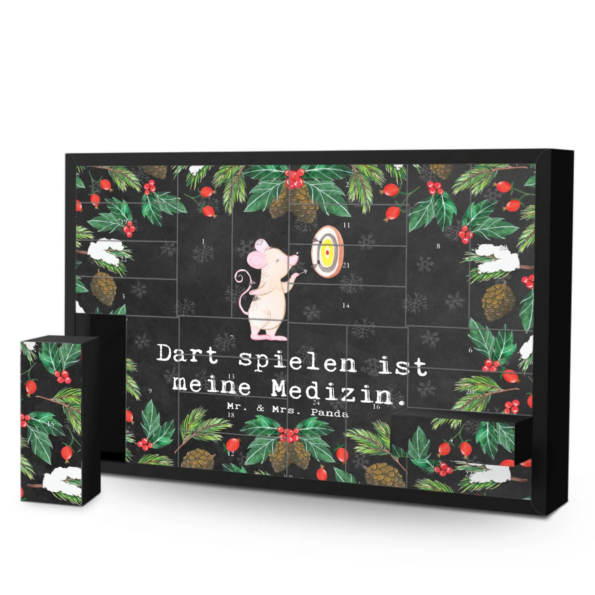 Der befüllbare Adventskalender "Dart spielen ist meine Medizin" von Mr. & Mrs. Panda ist das perfekte Geschenk für alle Sport- und Darts-Enthusiasten. In der aufregenden Vorweihnachtszeit bringt dieser Adventskalender Freude und Spannung in die täglichen Überraschungen. Mit einer liebevollen Zeichnung von Mrs. Panda zeigt er eine niedliche Maus, die mit einem Pfeil auf eine Dartscheibe zielt.