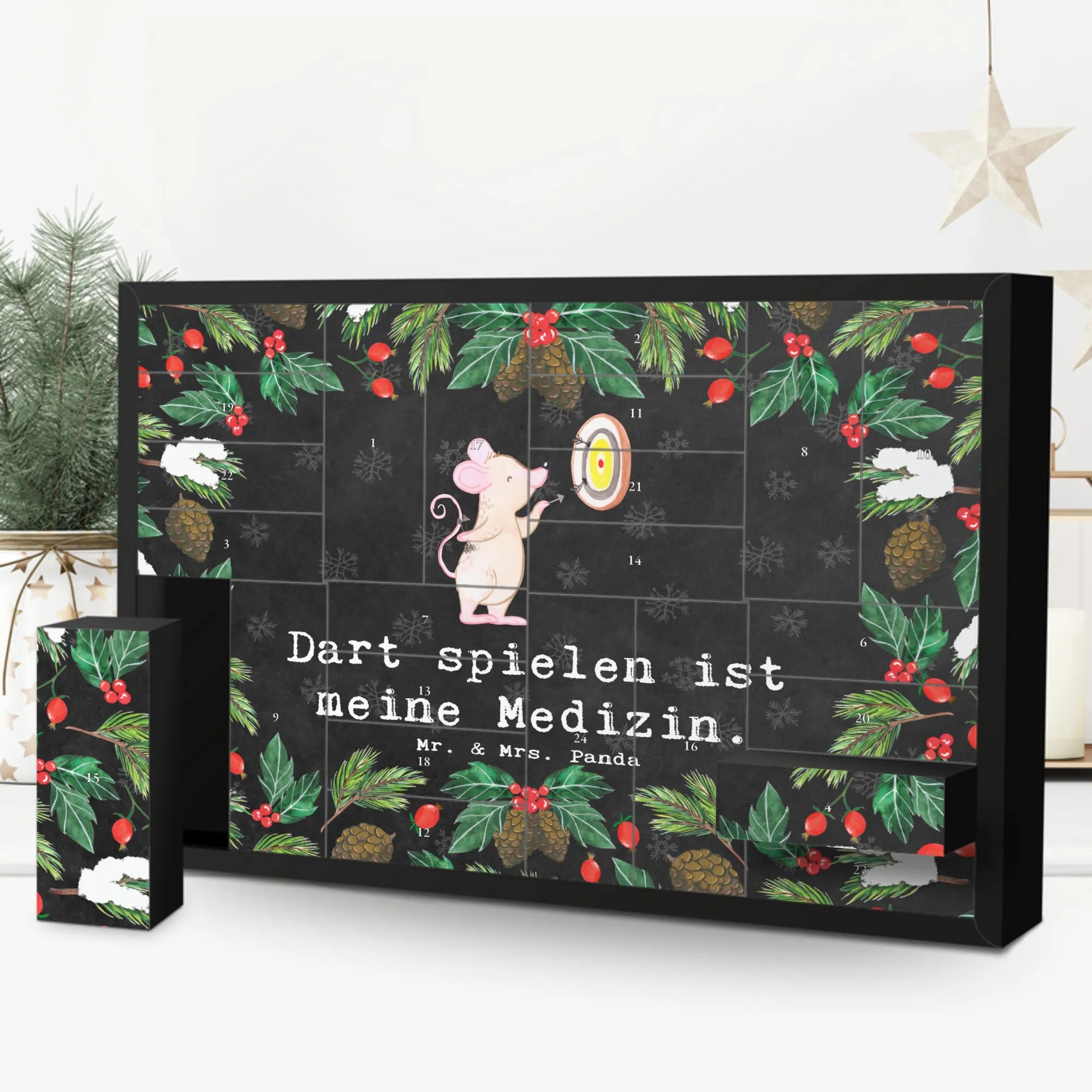 Der bezaubernde bef fillbare Adventskalender Maus Dart spielen Medizin von Mr. & Mrs. Panda ist das perfekte Geschenk für alle Dart-Fans und Sportliebhaber in der Vorweihnachtszeit. Mit einem liebevollen Design, das eine niedliche Maus zeigt, die mit einem Pfeil zielt, verkörpert dieser Kalender die Leidenschaft für das Darten und bringt jeden Abend eine neue Überraschung.