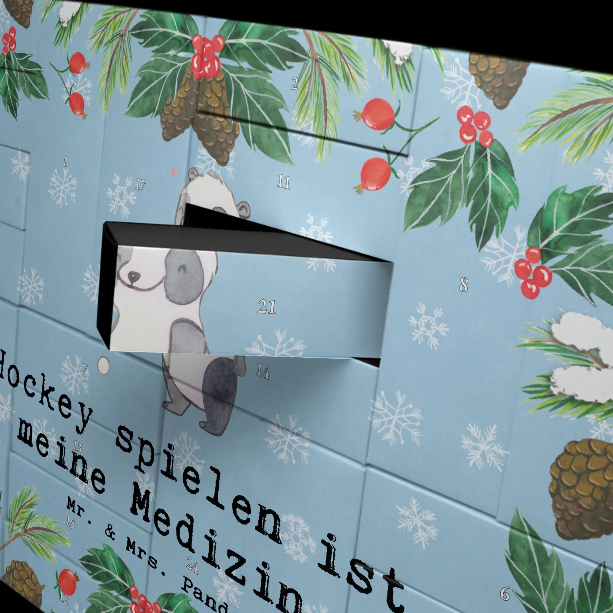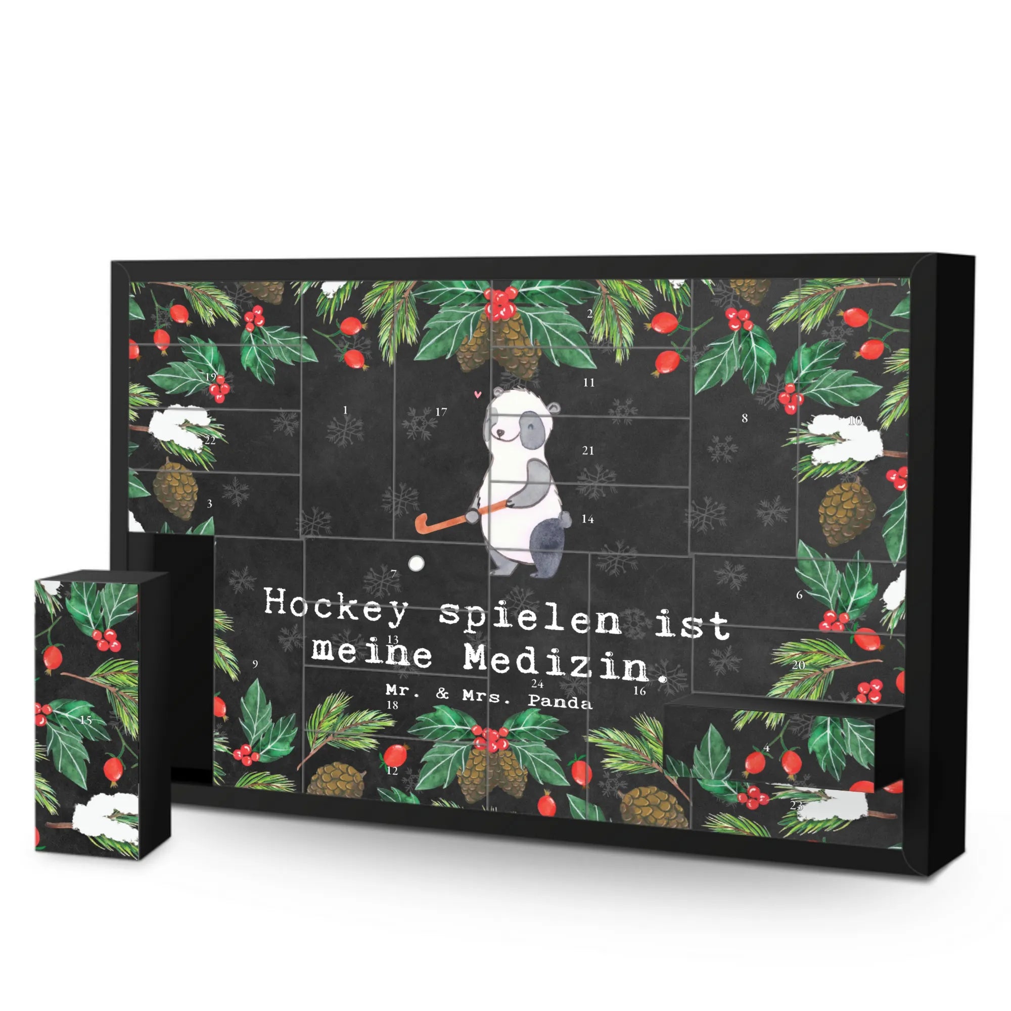 Der befüllbare Adventskalender von Mr. & Mrs. Panda mit dem Motiv "Hockey spielen ist meine Medizin" ist das perfekte Geschenk für alle Sportbegeisterten und Hockey-Spieler! Mit einer liebevollen Zeichnung von Mrs. Panda, die einen süßen Panda zeigt, der begeistert mit seinem Hockeyschläger spielt, bringt dieser Kalender nicht nur Vorfreude auf die besinnliche Zeit, sondern auch die Freude am Sport.