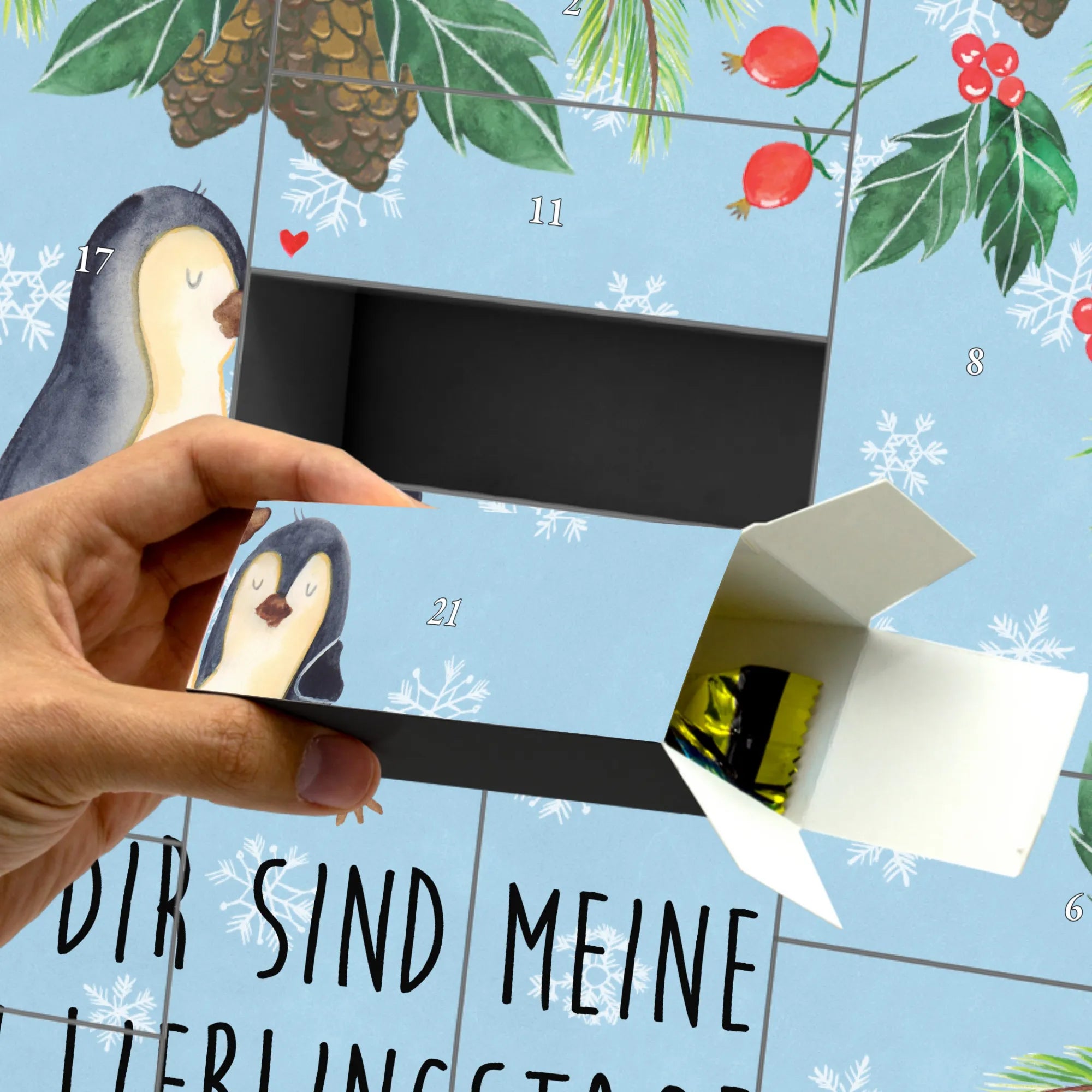 Egal ob zum Jahrestag, zur Verlobung oder einfach nur als Zeichen der Liebe – dieser Kalender ist äußerst vielseitig und wird von allen Liebhabern von Pinguinen geschätzt. Zudem ist der Adventskalender aus stabilem, 300 Gramm Karton gefertigt und hat eine seidenmatte Oberfläche, die seine Exklusivität unterstreicht. Dank der Aufstellvorrichtung kannst du ihn überall schön in Szene setzen.