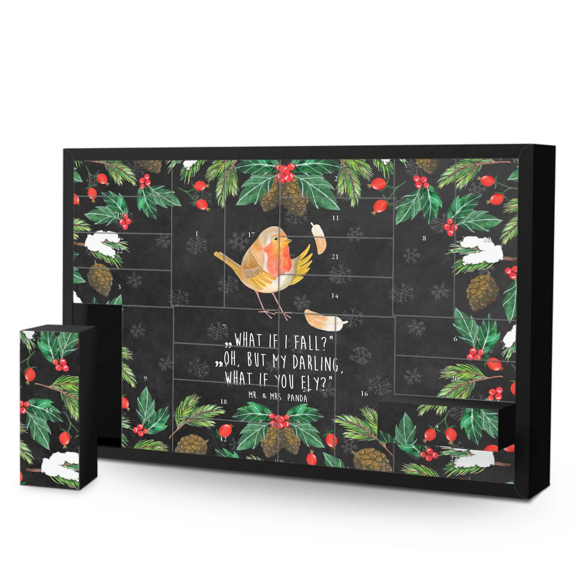 Wunderschöner Befüllbarer Adventskalender „Rotkehlchen mit Federn“ aus der Small World Kollektion von Mr. & Mrs. Panda – ein liebevolles Geschenk, das Herz und Seele wärmt. Auf der Vorderseite siehst du eine zarte Aquarellzeichnung von Mrs. Panda: ein süßes Rotkehlchen, umgeben von bunten Federn, vor einem Kreidetafel-Hintergrund. Der inspirierende Spruch lautet: „What if I fall?“ „Oh, but my darling, what if you fly?“ – ein echter Spruch Motivation und Spruch Mut, der zum Innehalten und Träumen einlädt.