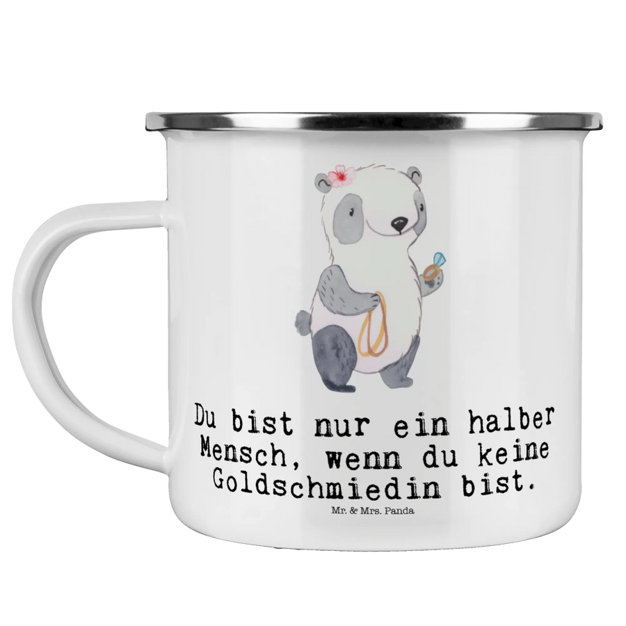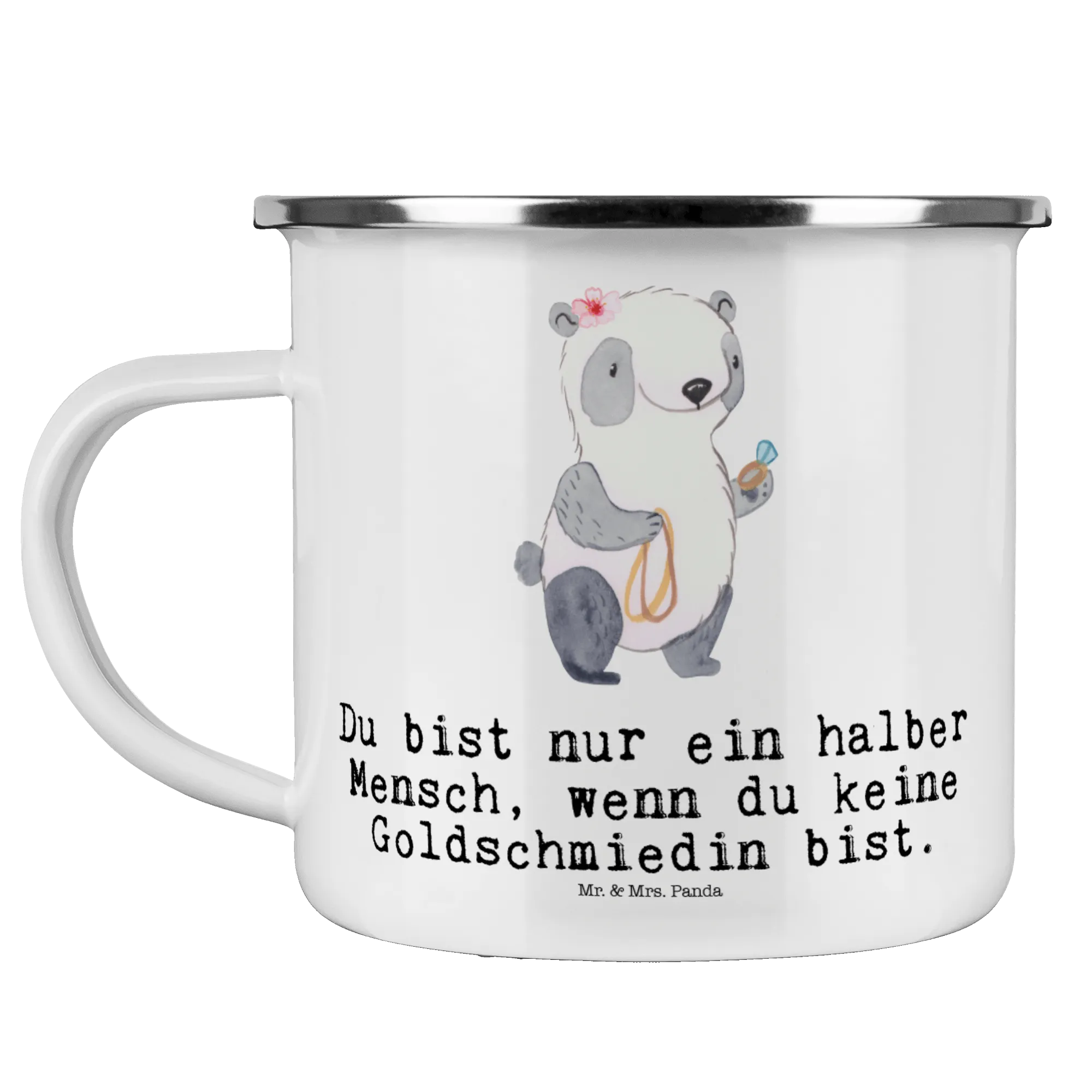 Die Camping Emaille Tasse 'Goldschmiedin mit Herz' von Mr. & Mrs. Panda ist das perfekte Geschenk für alle, die die Kunst des Schmuckhandwerks lieben oder selbst als Goldschmiedin aktiv sind. Stell dir vor, du bist draußen in der Natur, umgeben von malerischen Landschaften, und genießt einen warmen Kaffee oder Tee aus dieser bezaubernden Tasse.