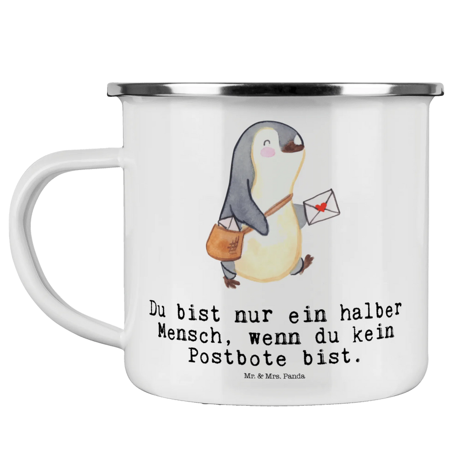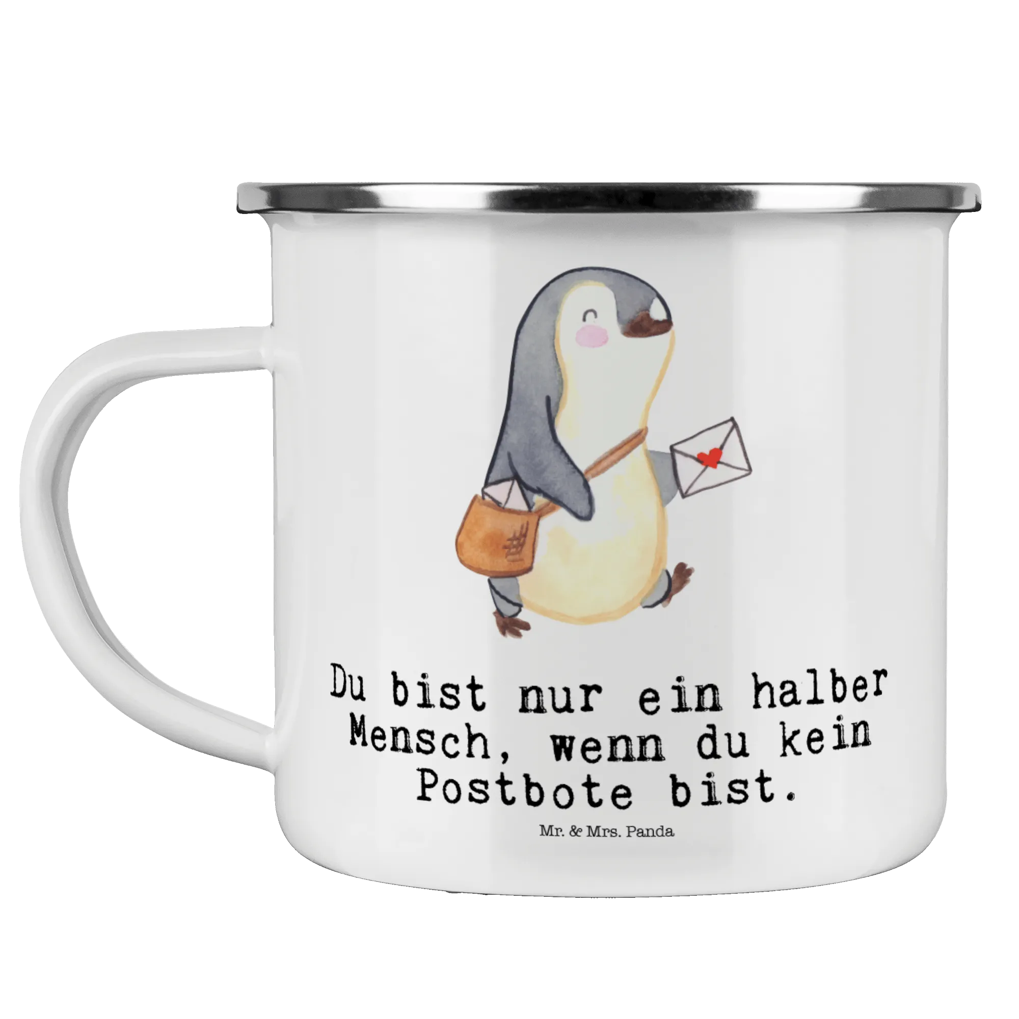 Die Camping Emaille Tasse "Postbote mit Herz" von Mr. & Mrs. Panda ist das perfekte Geschenk für alle, die dem Beruf des Postboten mit Herzblut nachgehen! Mit einem liebevollen Design, das einen süßen Pinguin zeigt, der eine Posttasche trägt und Briefe ausliefert, bringt diese Tasse nicht nur Freude, sondern feiert auch den wichtigen Job der Zustellerinnen und Zusteller.