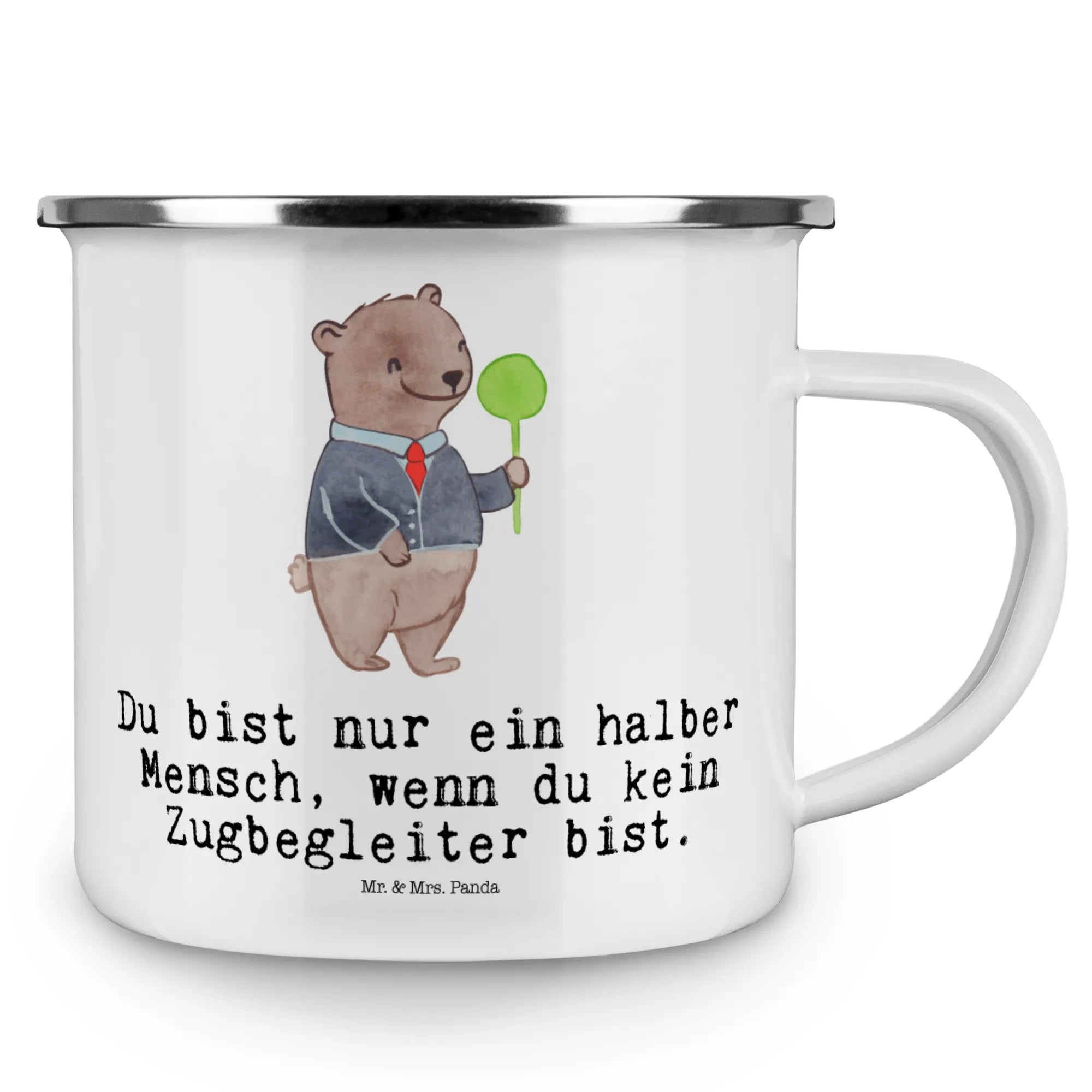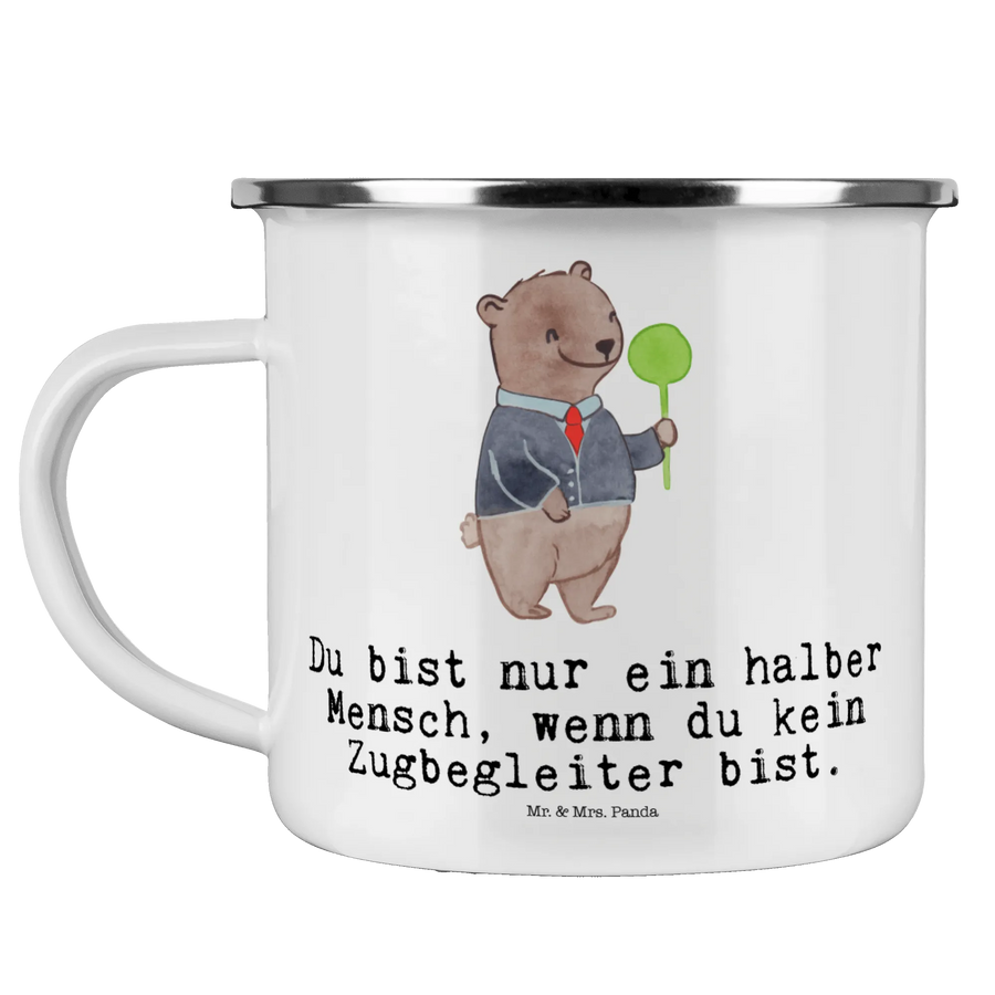 Die Camping Emaille Tasse "Zugbegleiter mit Herz" von Mr. & Mrs. Panda ist das ideale Geschenk für alle Zugbegleiter und Menschen, die gerne unterwegs sind. Sie vereint Funktionalität mit einem liebevollen Design. Diese robuste und kratzfeste Metalltasse ist perfekt für alle Deine Abenteuer, ob beim Campen, Wandern oder einfach nur beim Entspannen im Garten.