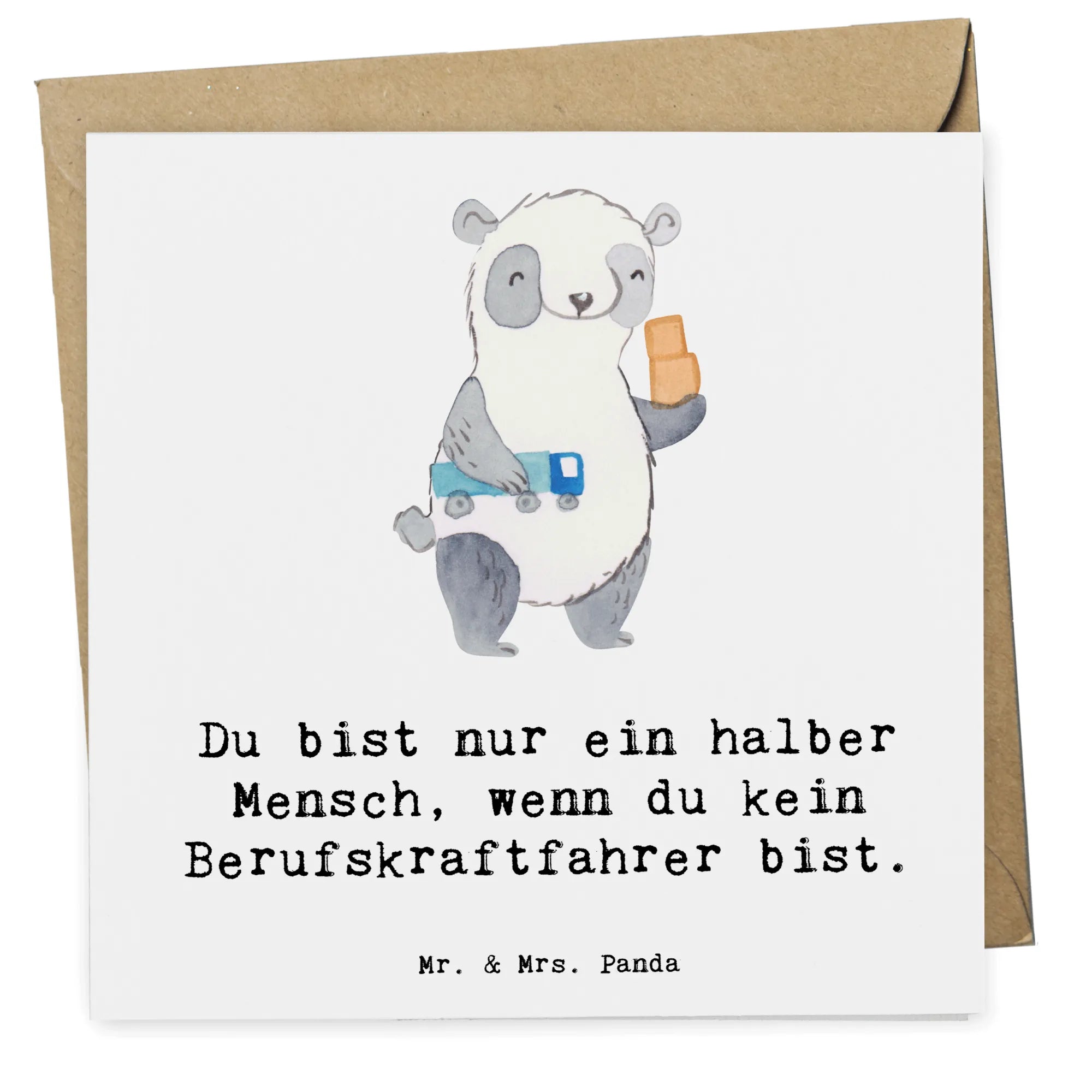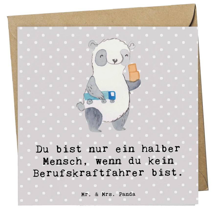 Mit einem liebevollen Motiv, das einen süßen Panda zeigt, der als Berufskraftfahrer arbeitet, und dem Spruch: "Du bist nur ein halber Mensch, wenn du kein Berufskraftfahrer bist!" ist sie ein echtes Highlight. Die Karte wird aus hochwertigem 300 Gramm Karton gefertigt und hat eine glänzend veredelte Vorderseite, die sie besonders edel macht. Die Rückseite und die Innenseite sind matt, um Dir das Beschriften zu erleichtern.