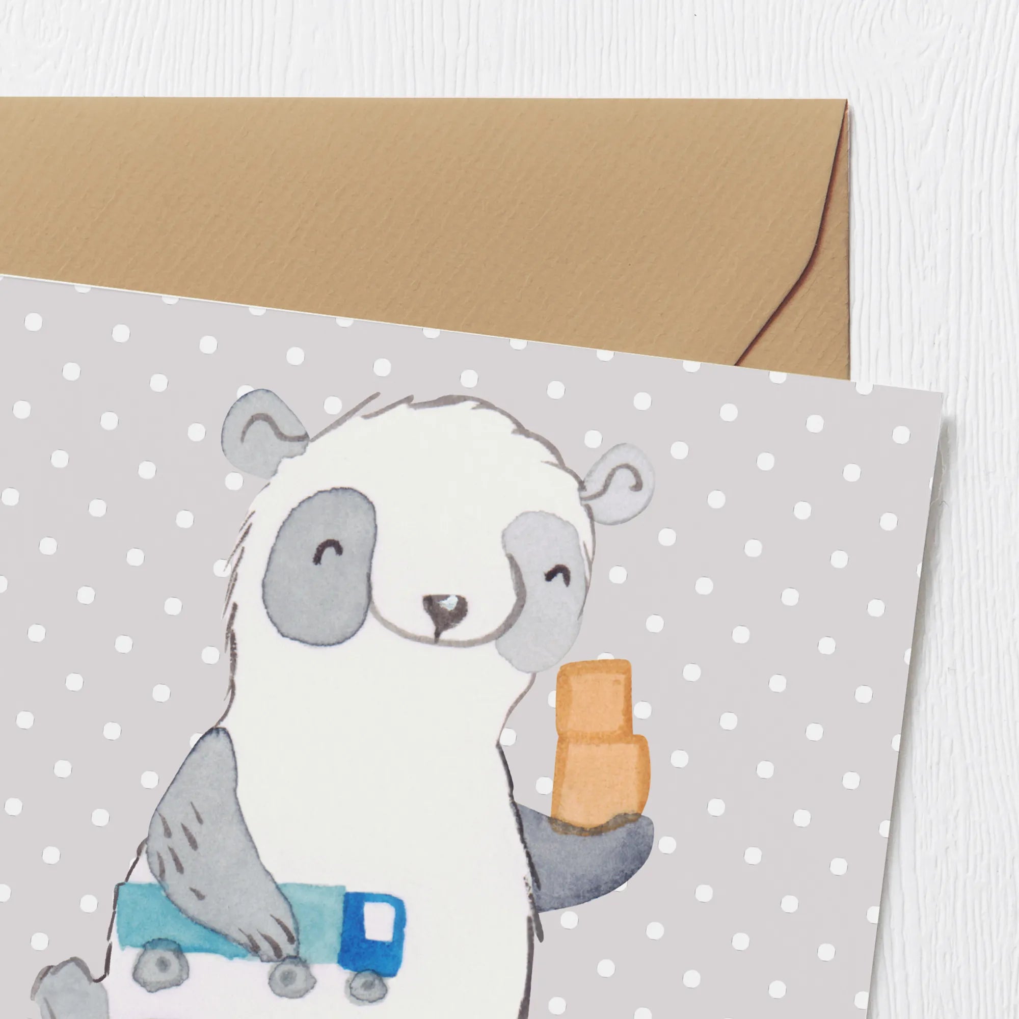 Das Design ist liebevoll von Mrs. Panda handgezeichnet und zeigt einen niedlichen Panda in einem Lkw, was garantiert für Lächeln bei jedem Beschenkten sorgt. Diese Karte eignet sich für zahlreiche Anlässe, sei es eine Hochzeit, ein Jubiläum oder sogar einfach als kleine Aufmerksamkeit für einen geschätzten Arbeitskollegen.