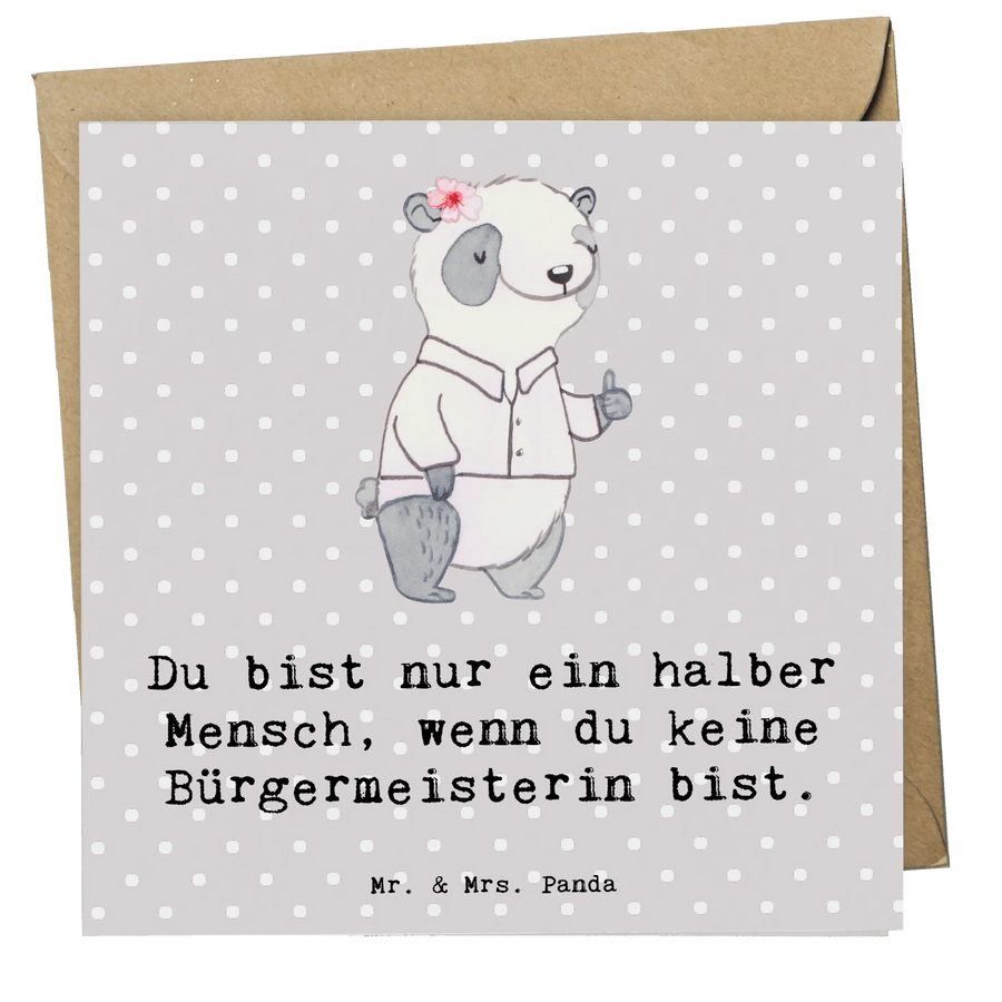 Die Vorderseite ziert ein liebevolles Motiv mit einem süßen Panda in einem Anzug, der den Daumen hoch hält. Die Botschaft ist klar: "Du bist nur ein halber Mensch, wenn du keine Bürgermeisterin bist." Diese Karte ist ideal für Amtsantritte, Bürgermeisterwahlen oder als herzliche Gratulation zur Wiederwahl. Die Innenseite ist blanko, somit kannst du deine persönlichen Wünsche und Glückwünsche ganz einfach hinzufügen.