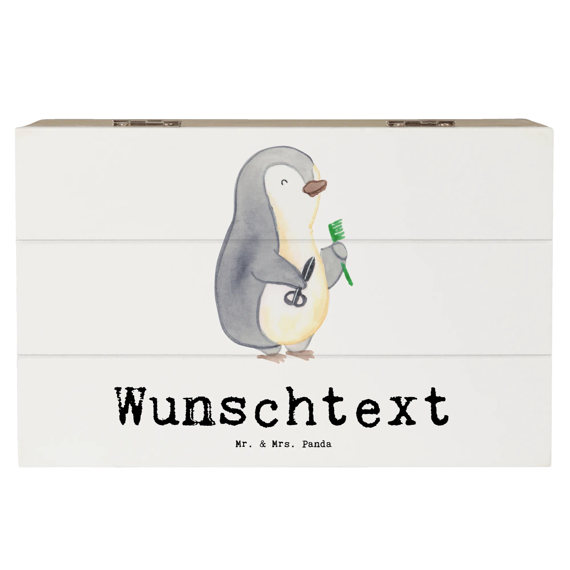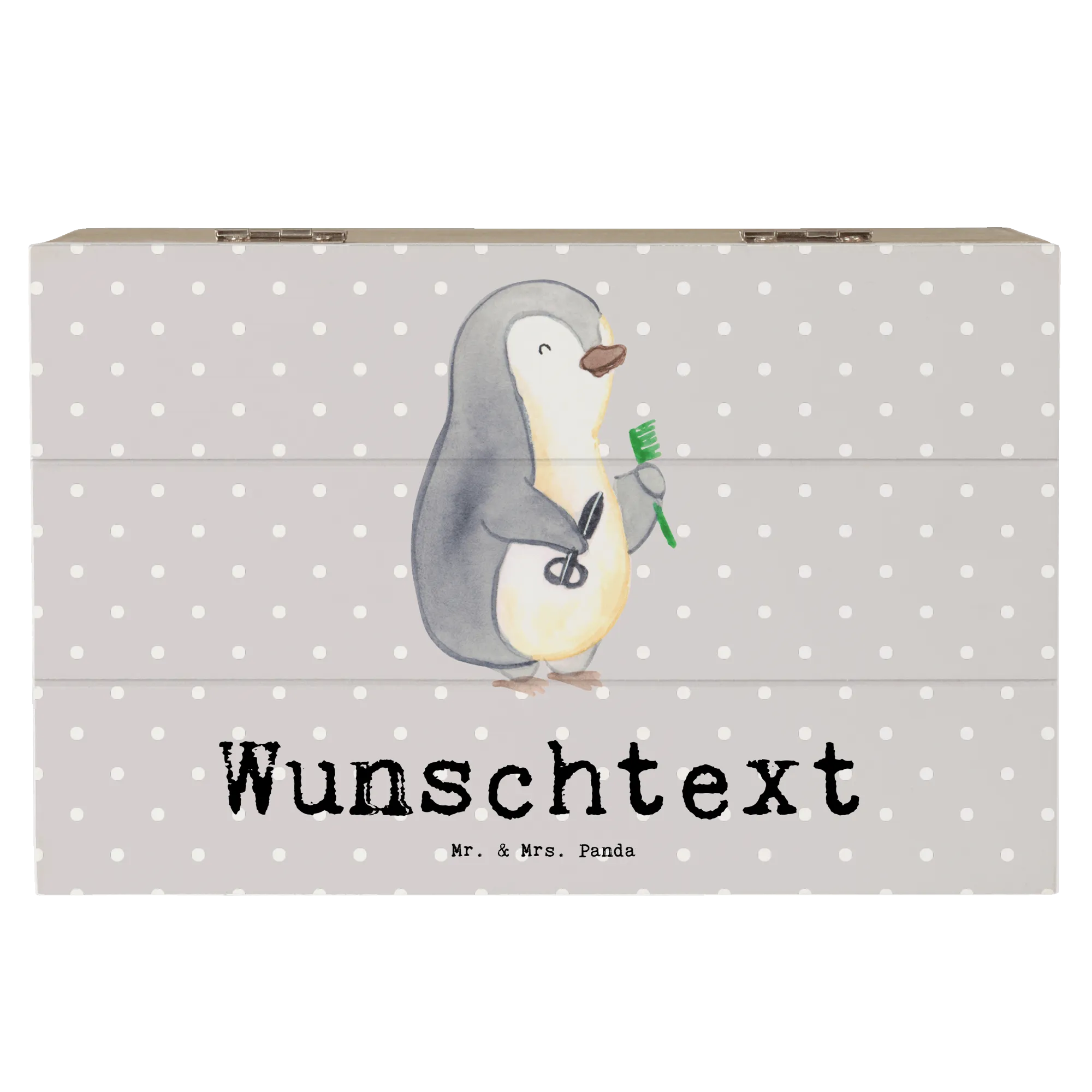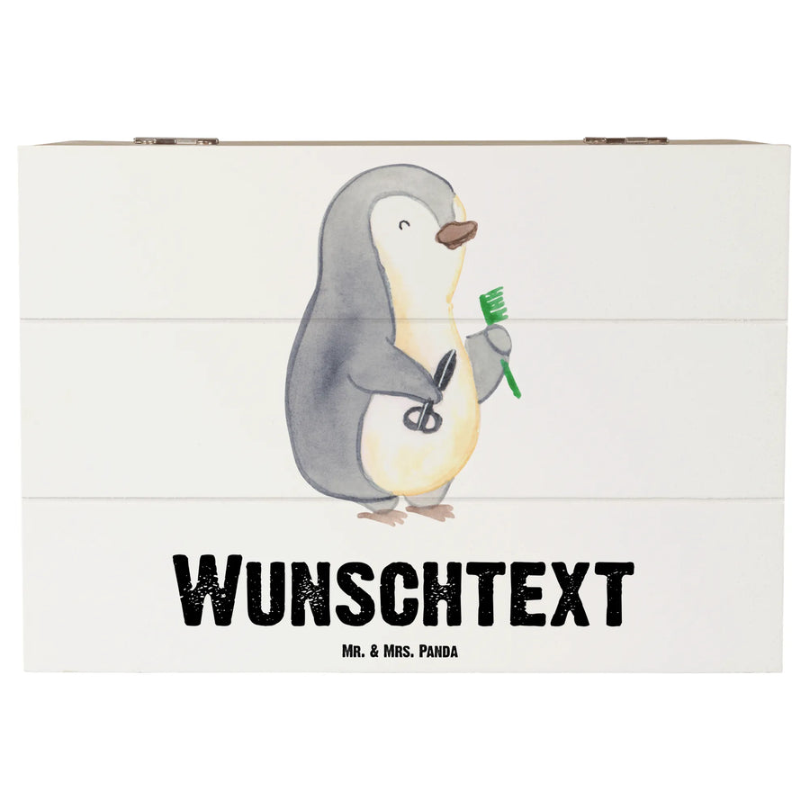 Die personalisierte Holzkiste "Hairstylist mit Herz" von Mr. & Mrs. Panda ist das perfekte Geschenk für Haarstylisten und alle Liebhaber des Friseurhandwerks. Mit einem niedlichen Motiv – einem fröhlichen Pinguin, der als Hairstylist mit einem Kamm in der Hand posiert – bringt diese Kiste eine liebevolle Note in jeden Friseursalon oder zu Hause.