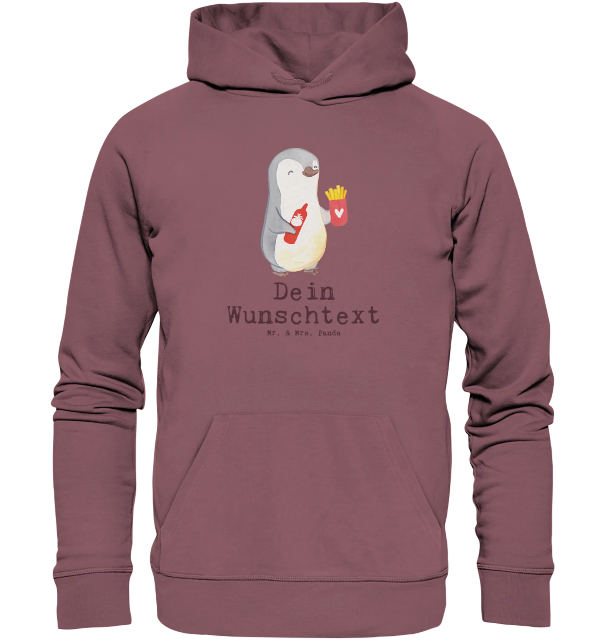Hergestellt aus 85 % Bio-Baumwolle und 15 % recyceltem Polyester, bietet er nicht nur hohen Tragekomfort, sondern trägt auch zur Nachhaltigkeit bei. Mit einem ansprechenden Design eines süßen Pinguins, der Pommes und Ketchup in den Händen hält, macht dieser Hoodie jeden Imbissverkäufer zum Hingucker.