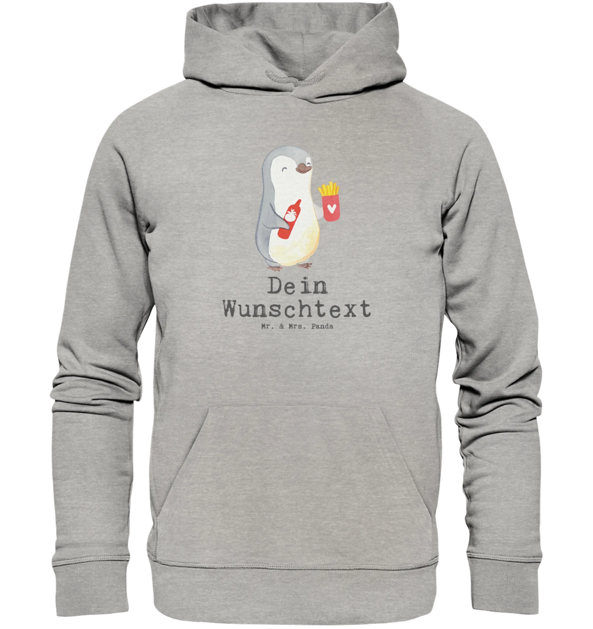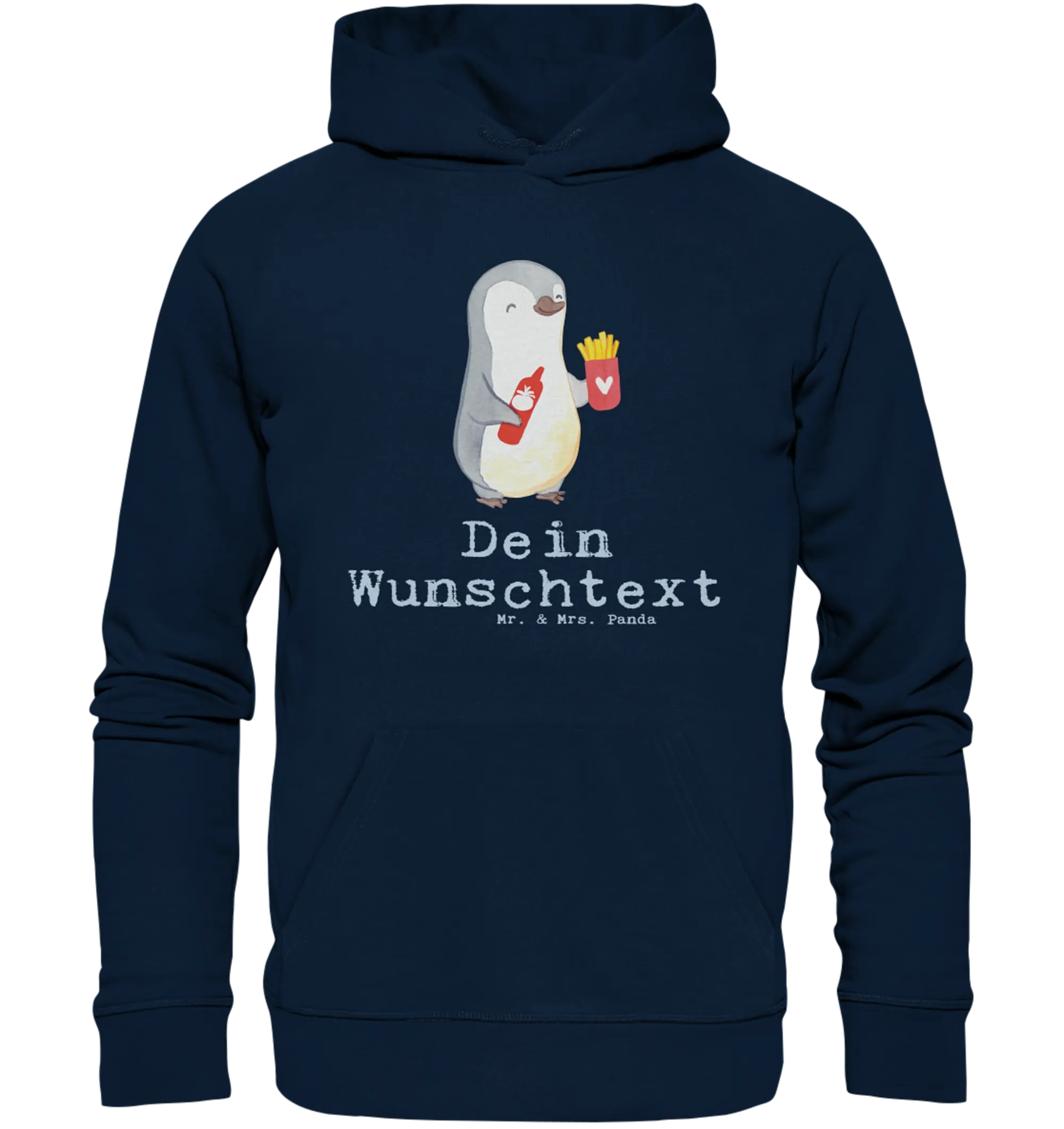 Das Design zeigt einen süßen Pinguin, der Pommes und Ketchup in seinen Händen hält – ein wahrer Imbissverkäufer! Dieser Hoodie kann mit deinem persönlichen Wunschtext oder Namen versehen werden, sodass du ihn ganz nach deinen Vorstellungen gestalten kannst.
