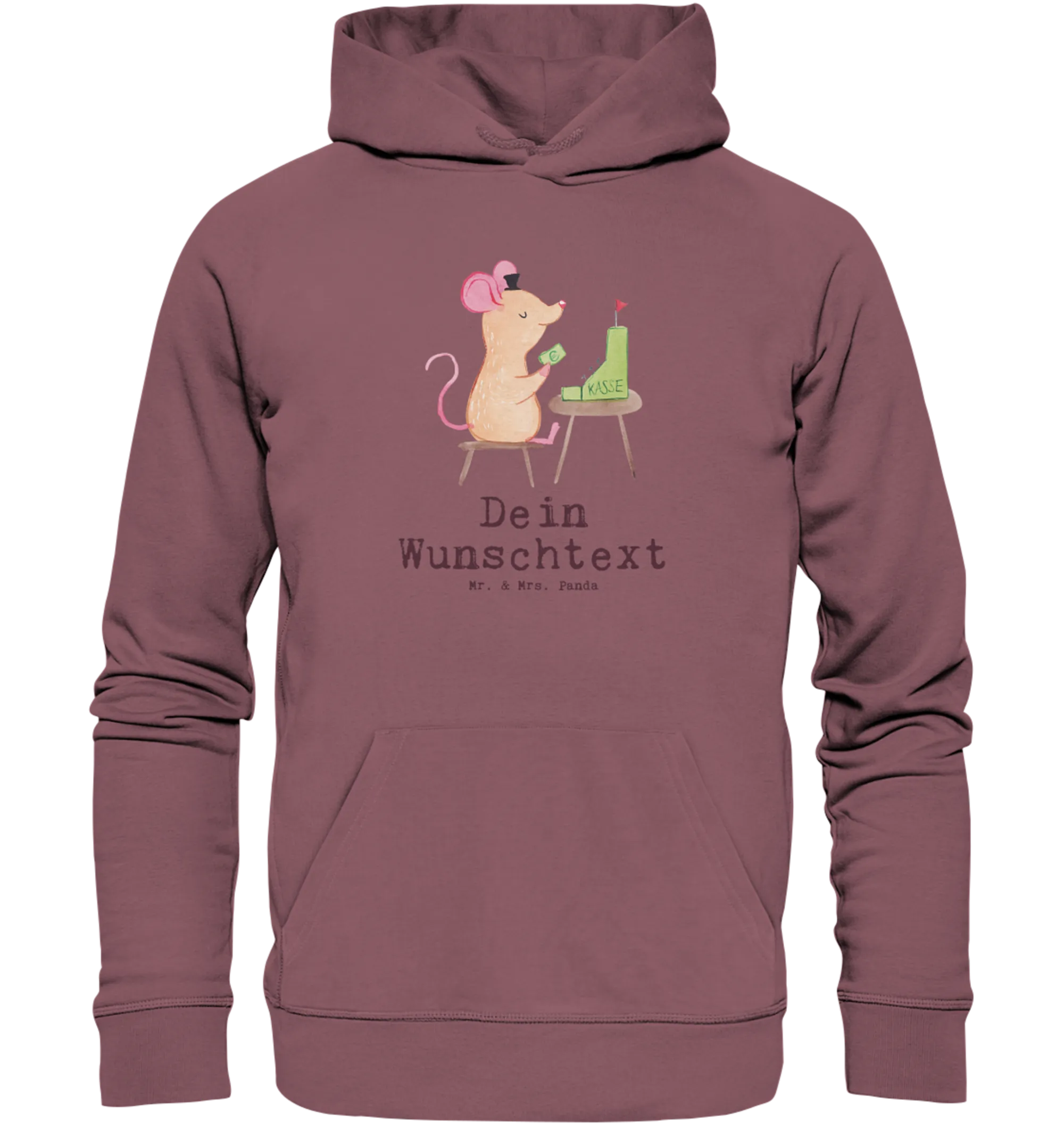 Dieser Kapuzenpullover kann ganz einfach mit deinem Wunschtext oder Namen personalisiert werden, um ihn noch individueller zu gestalten. So wird aus einem gewöhnlichen Sweatshirt ein ganz besonderes Geschenk! Die liebevoll handgemalte Maus, die freudig an der Kasse arbeitet, verleiht dem Hoodie das gewisse Etwas.