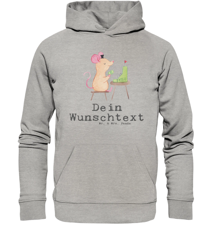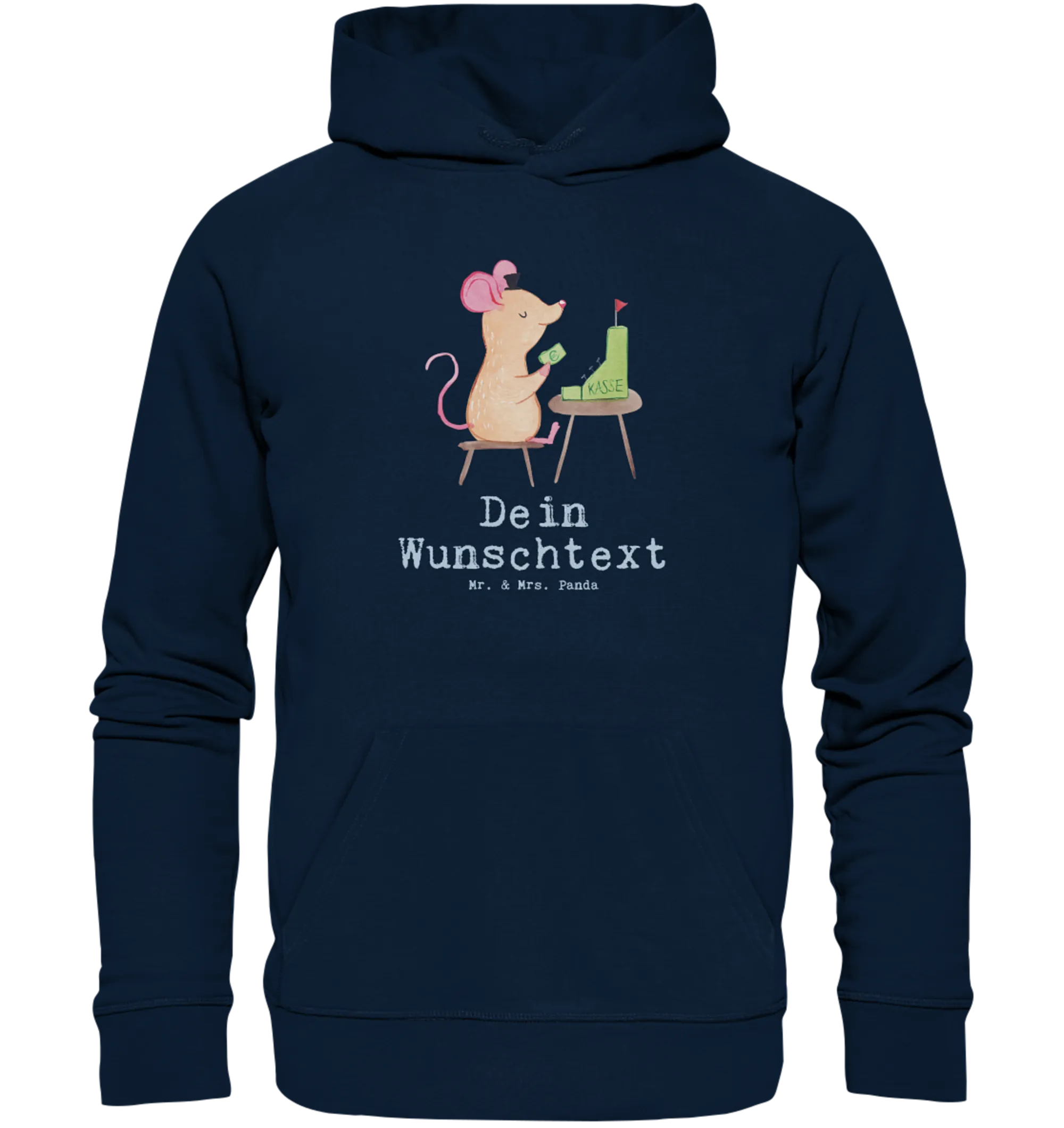 Der Kapuzenpullover kommt mit einem liebevoll designten Motiv, das eine putzige Maus an der Kasse zeigt und den Spruch: "Du bist nur ein halber Mensch, wenn du kein Kassierer bist." Natürlich kannst du auch deinen eigenen Wunschtext oder Namen hinzufügen, um das Geschenk noch persönlicher zu gestalten.