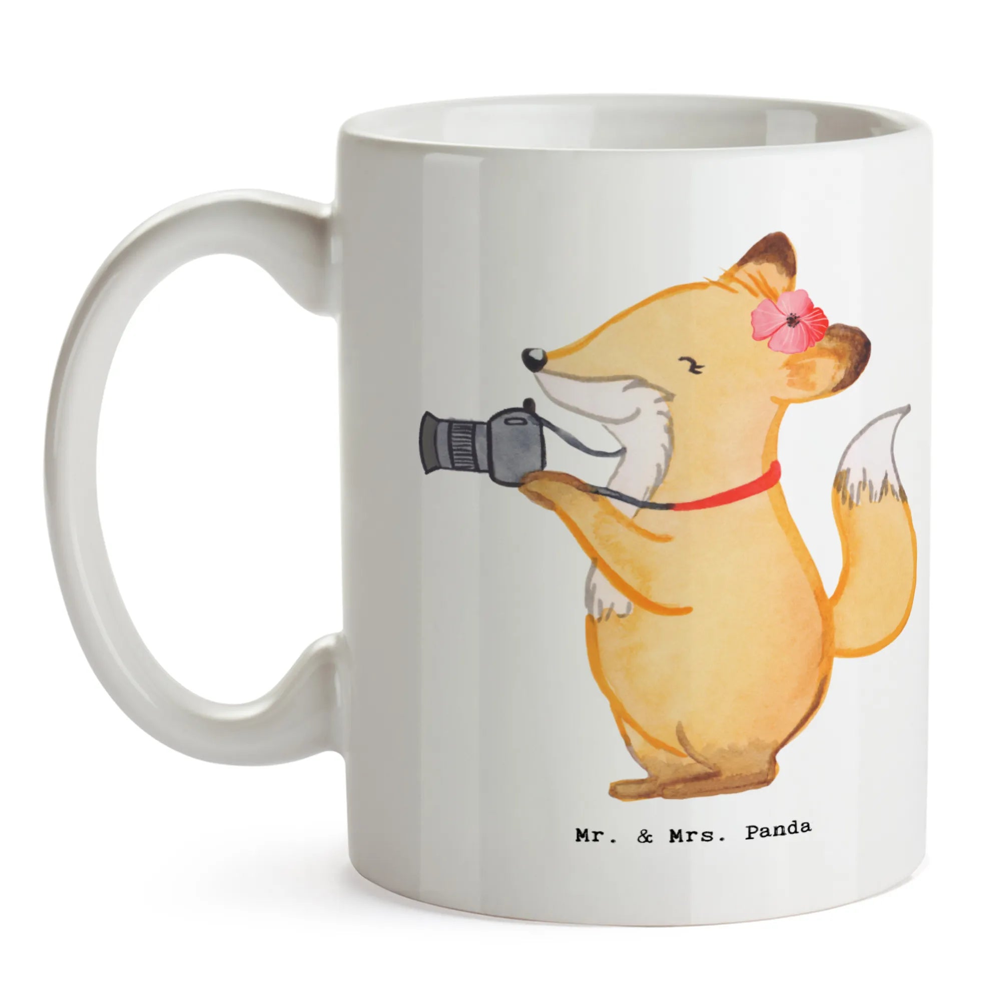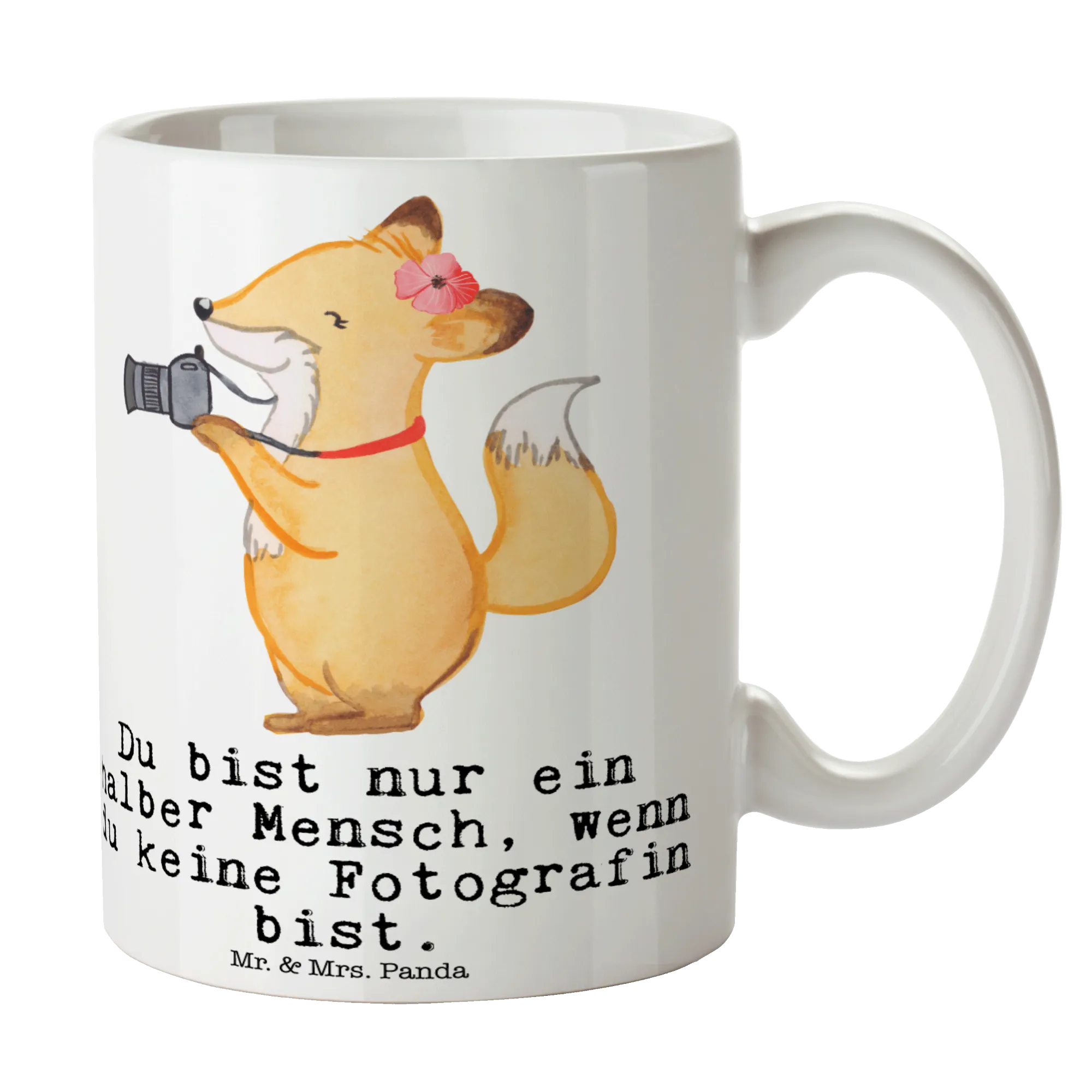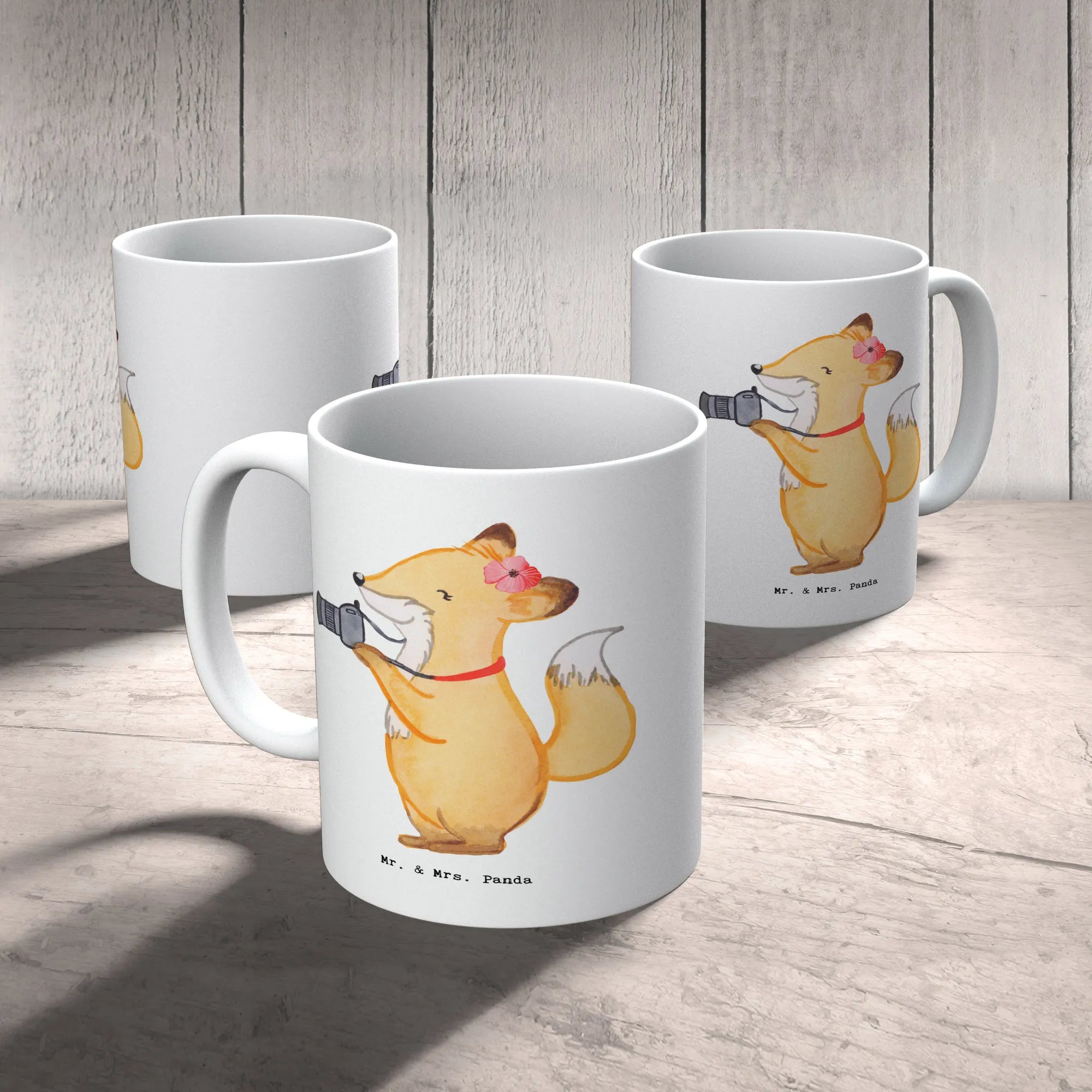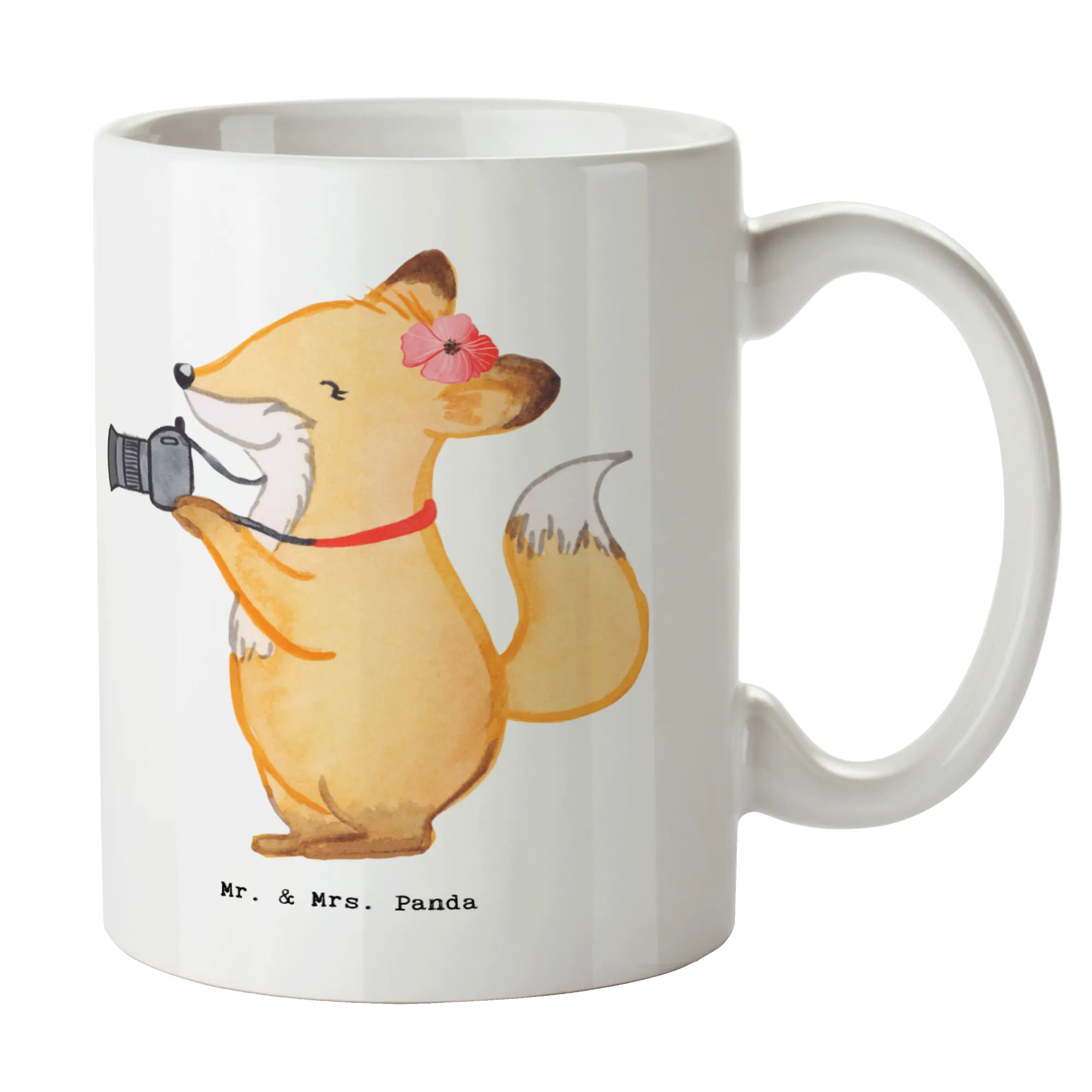 Die Tasse "Fotografin mit Herz" von Mr. & Mrs. Panda ist das perfekte Geschenk für jeden, der die Leidenschaft zur Fotografie teilt – ob Profi-Fotograf oder Hobbyfotografin. Mit ihrem charmanten Motiv, das einen süßen, weiblichen Fuchs mit einer Kamera zeigt, ist diese Tasse nicht nur ein praktisches Alltagsobjekt, sondern auch ein Ausdruck der Liebe zur Fotografie. Die hochwertige Keramik sorgt dafür, dass die Tasse lange schön bleibt – sie ist mikrowellengeeignet und spülmaschinenfest, sodass sie bis zu 2000 Waschgänge problemlos übersteht.