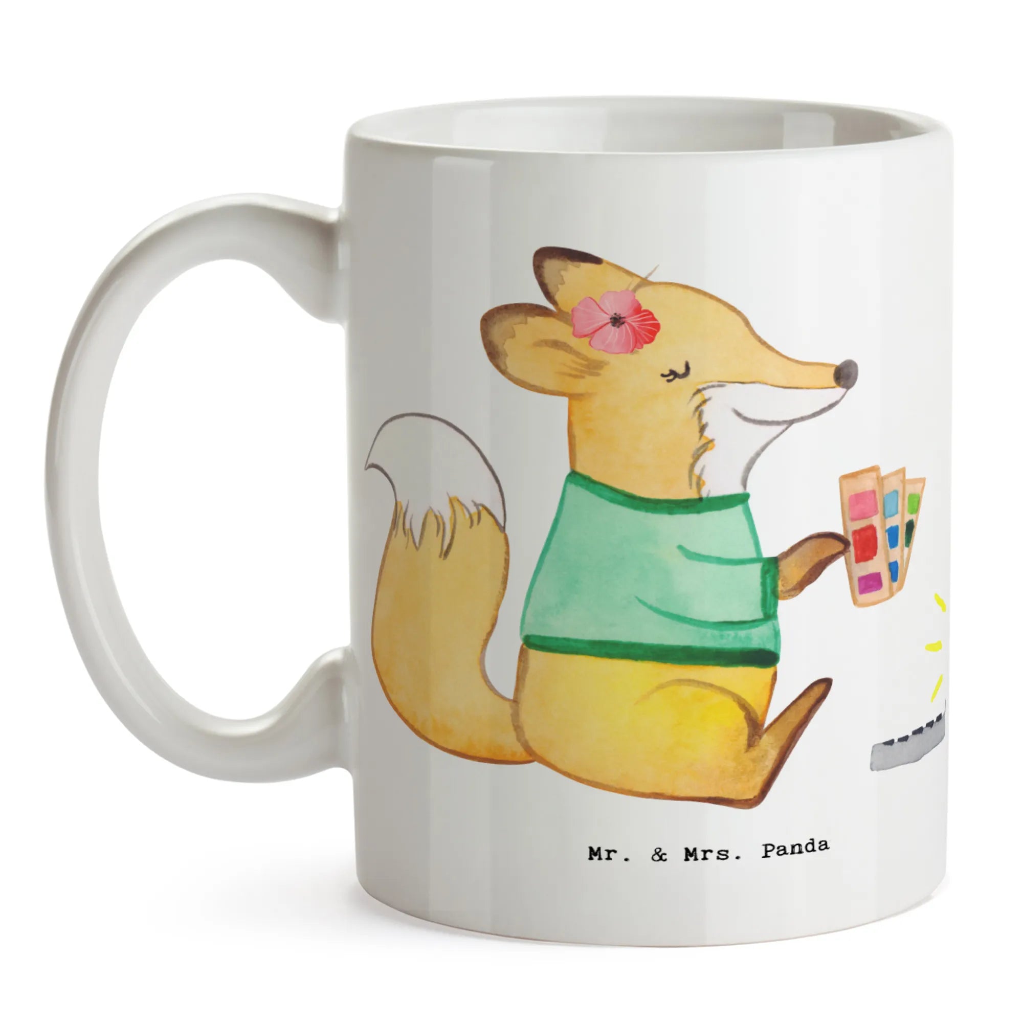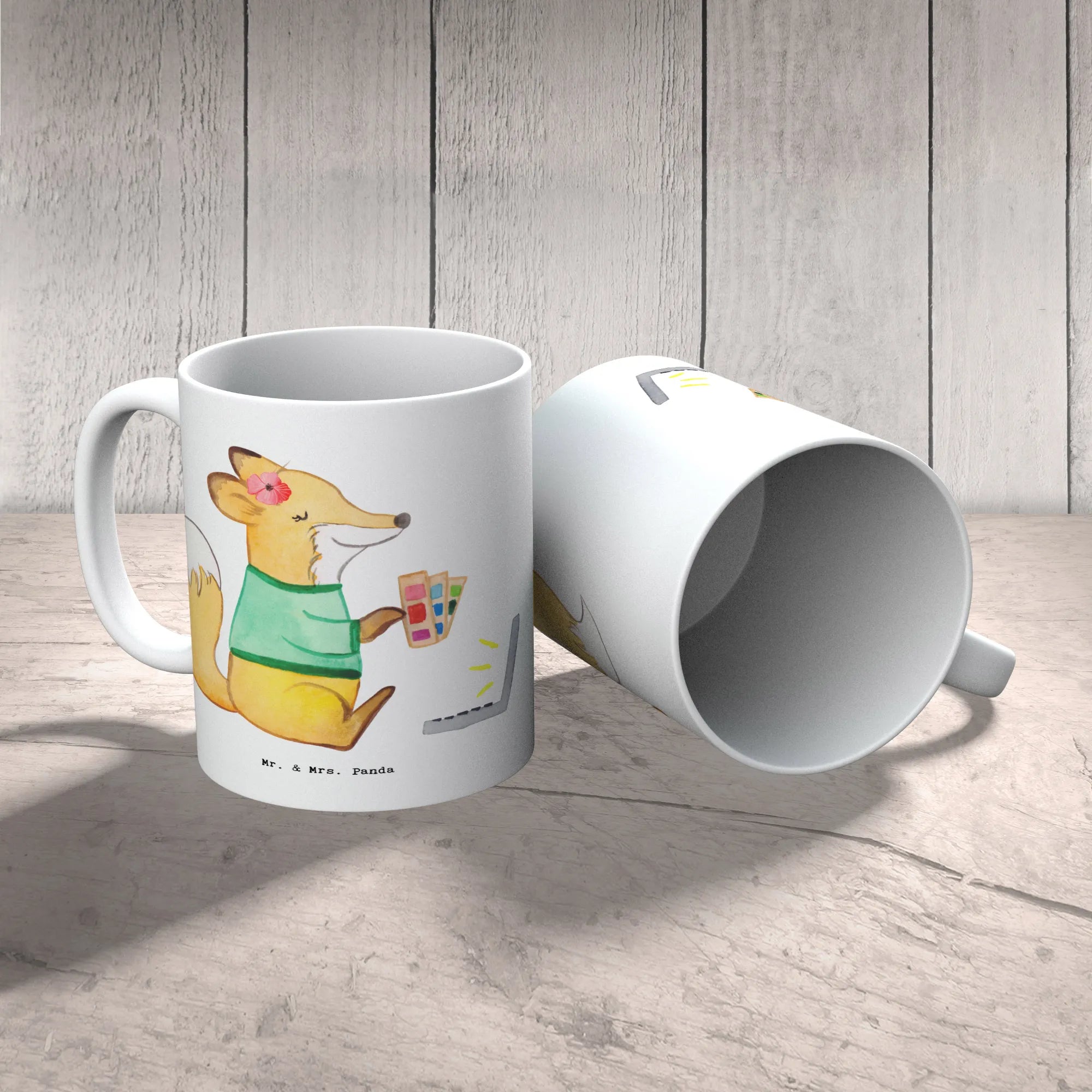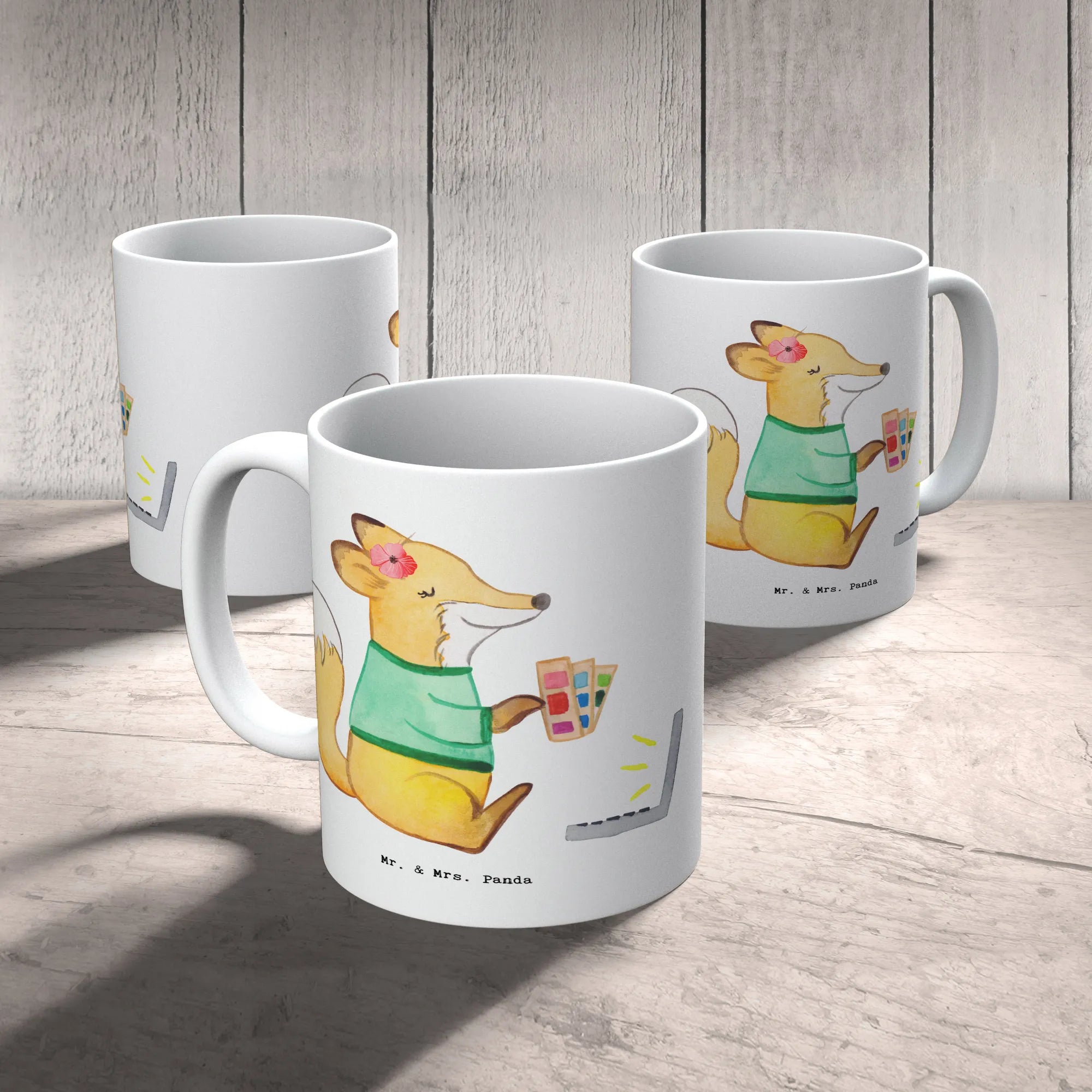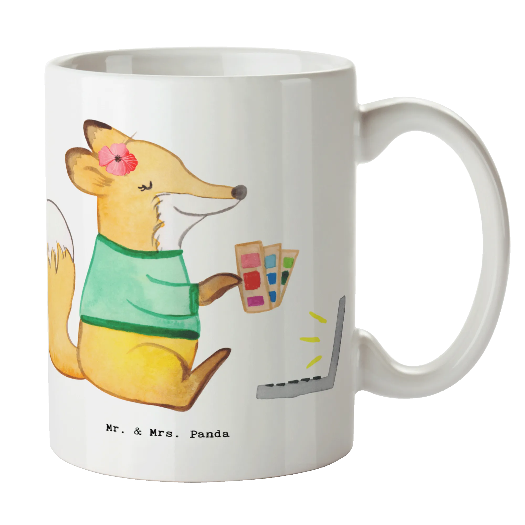 Jeder Schluck aus dieser Tasse wird zu einem kleinen Highlight des Tages, denn sie begleitet dich mit einem liebevoll gestalteten Motiv: Ein niedlicher Fuchs, der am Laptop arbeitet, und eine Farbpalette in der Hand hält – einfach perfekt für alle Grafikdesignerinnen!