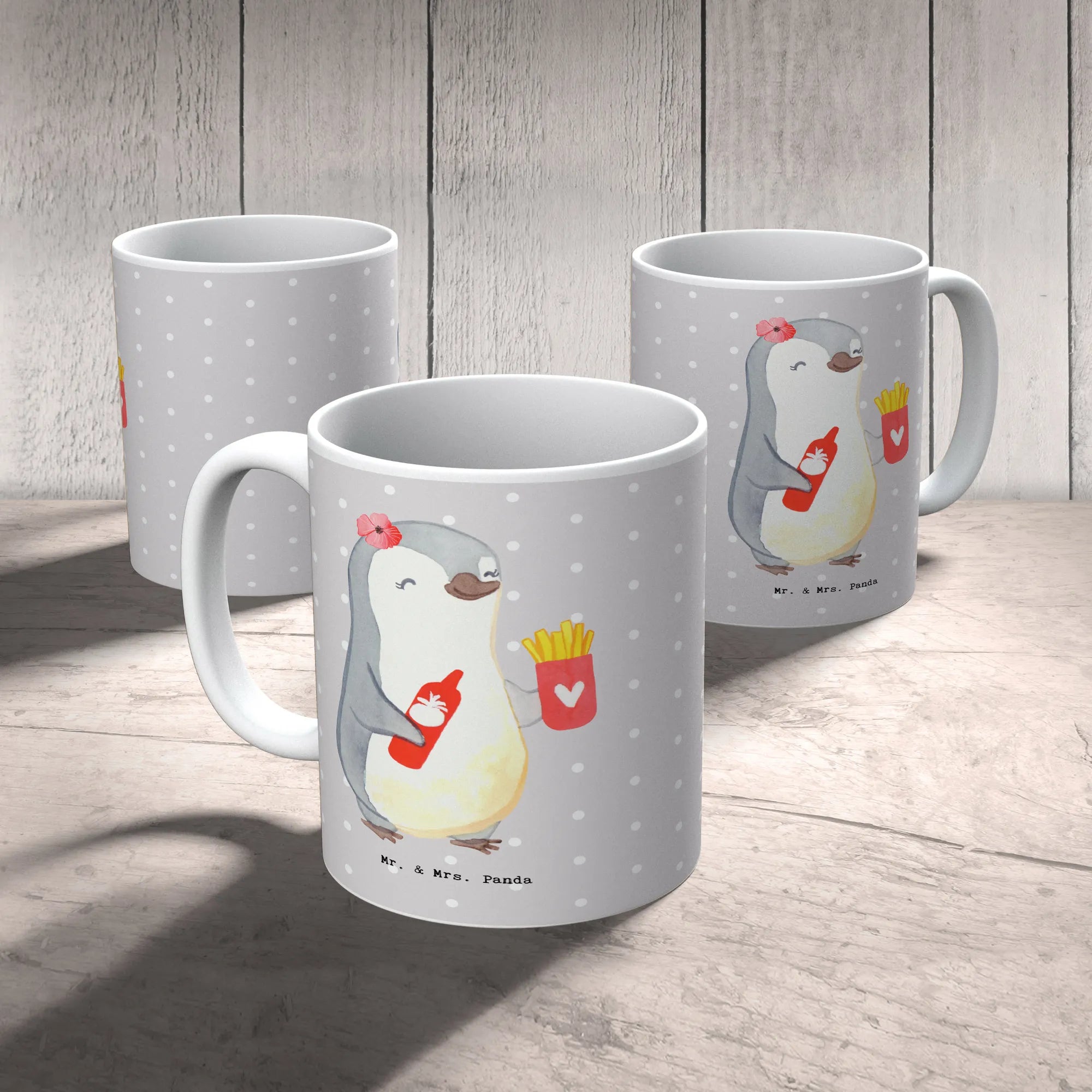 Die Tasse "Imbissbesitzerin mit Herz" aus der zauberhaften Berufe Kollektion von Mr. & Mrs. Panda ist das perfekte Geschenk für all diejenigen, die die Kunst des Snacking beherrschen! Egal ob du selbst eine Imbissbesitzerin bist oder jemandem eine Freude damit machen möchtest, diese Keramiktasse wird garantiert für gute Laune sorgen.