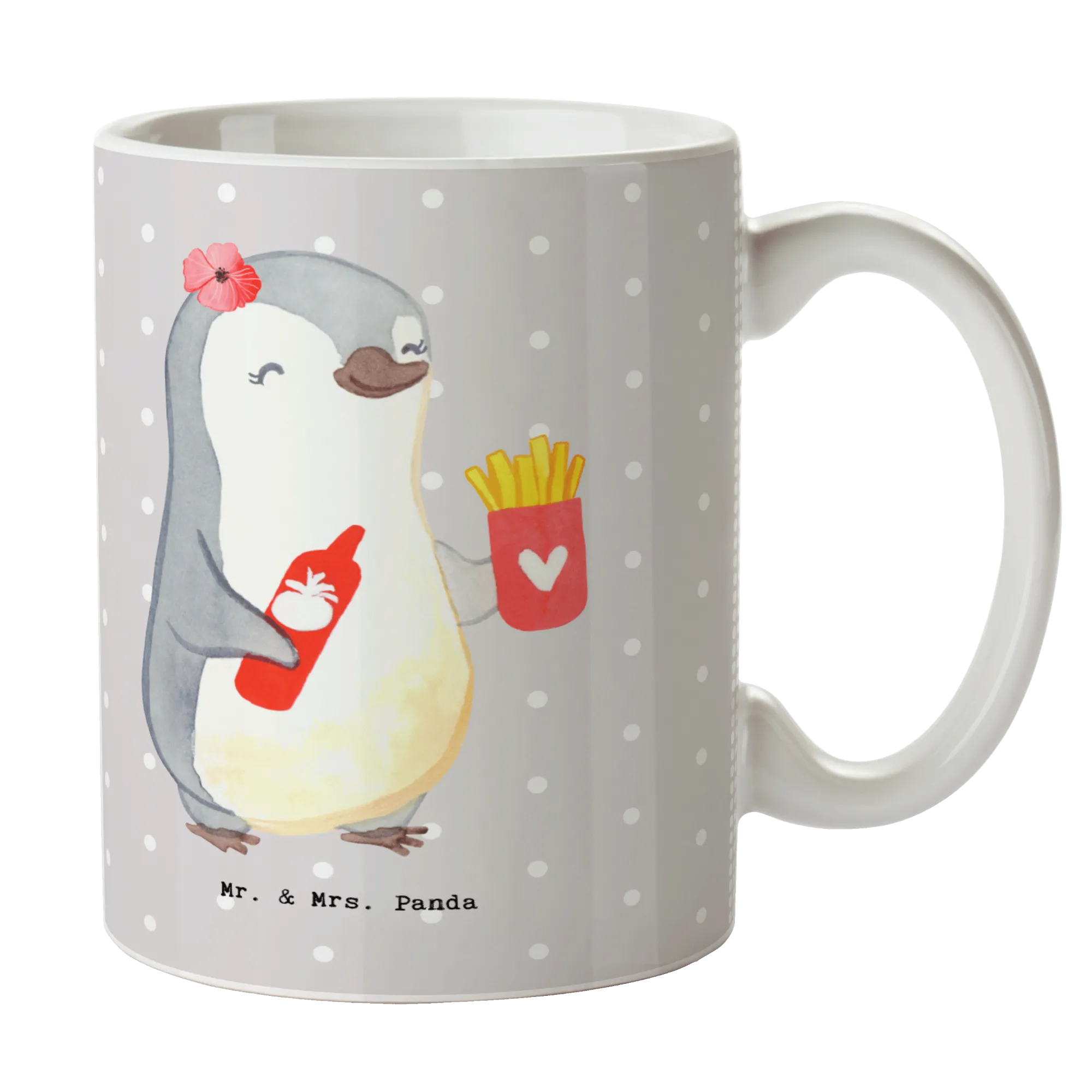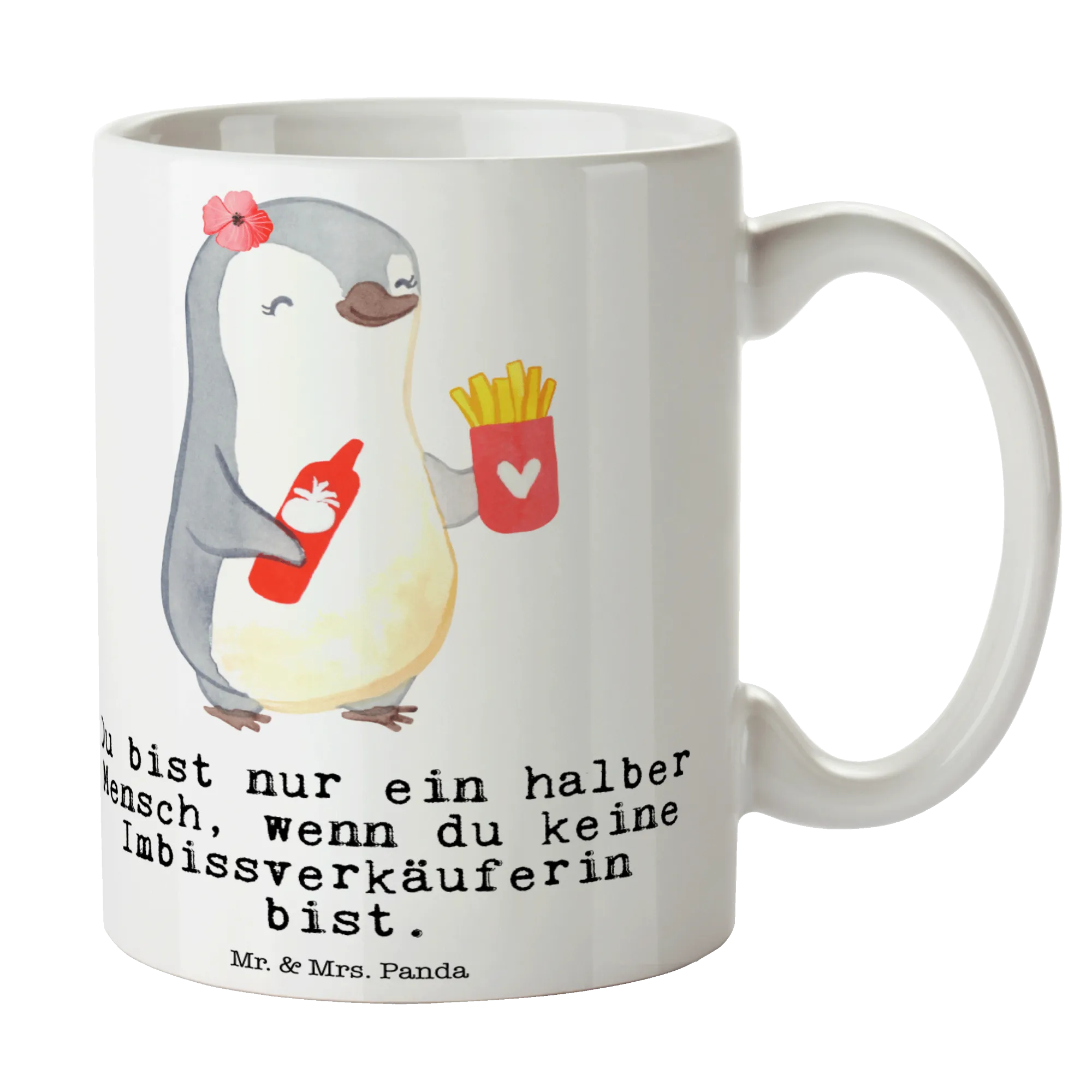Die bezaubernde Tasse "Imbissverkäuferin mit Herz" aus der kreativen Berufe Kollektion von Mr. & Mrs. Panda ist das perfekte Geschenk für alle Imbissbesitzerinnen und Imbissverkäuferinnen. Sie weiß, wie man mit einem Lächeln und den besten Pommes den Tag versüßt, und genau darum verdient sie eine ganz besondere Tasse, die ihre Leidenschaft für die Gastronomie widerspiegelt!
