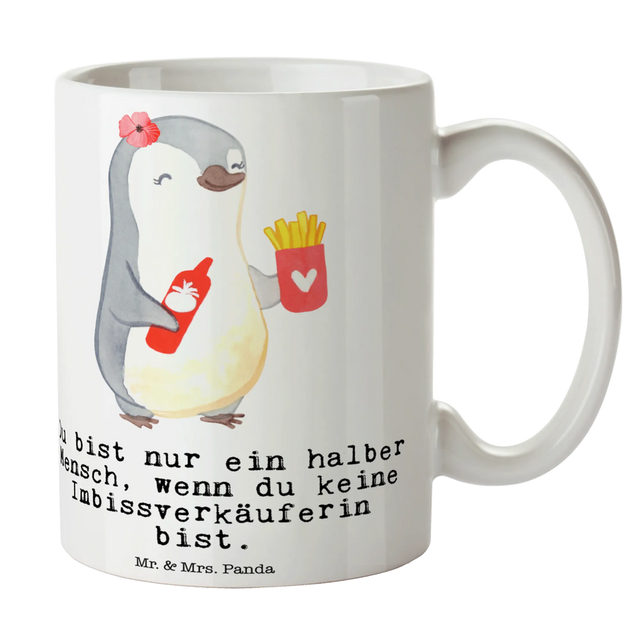 Die besondere Note dieser Tasse liegt nicht nur in ihrem hübschen Design, sondern auch in dem liebevoll gestalteten Slogan: "Du bist nur ein halber Mensch, wenn du keine Imbissverkäuferin bist." Dieser Spruch ist eine humorvolle Hommage an die grauenvollen Wartezeiten und die langen Schlangen in einem Imbiss – ganz ehrlich, wer kann schon ohne die besten Pommes der Stadt?