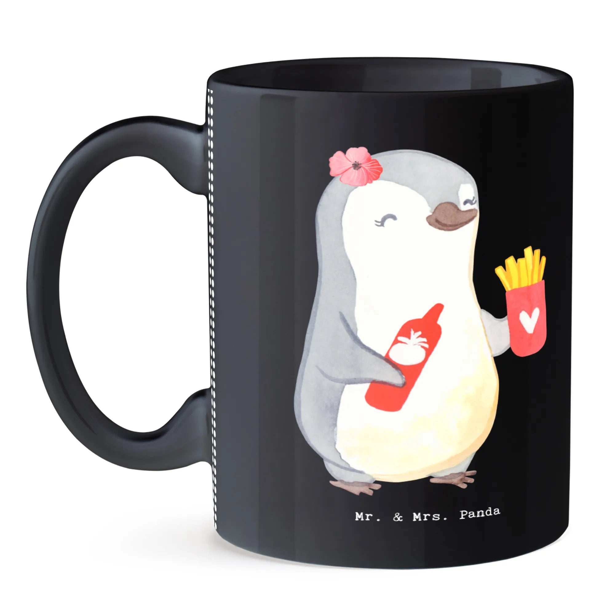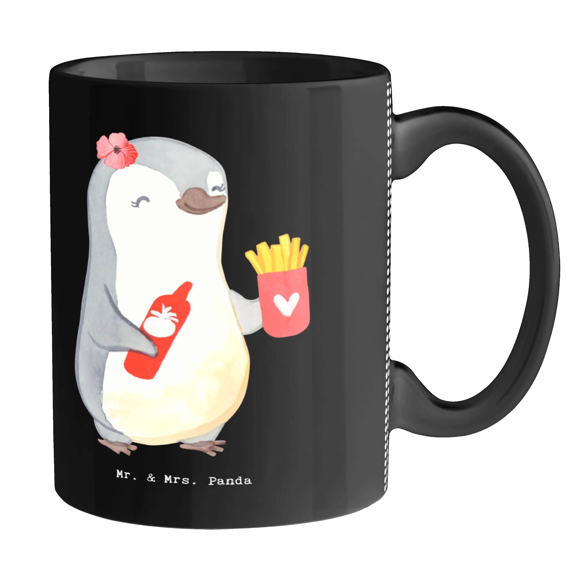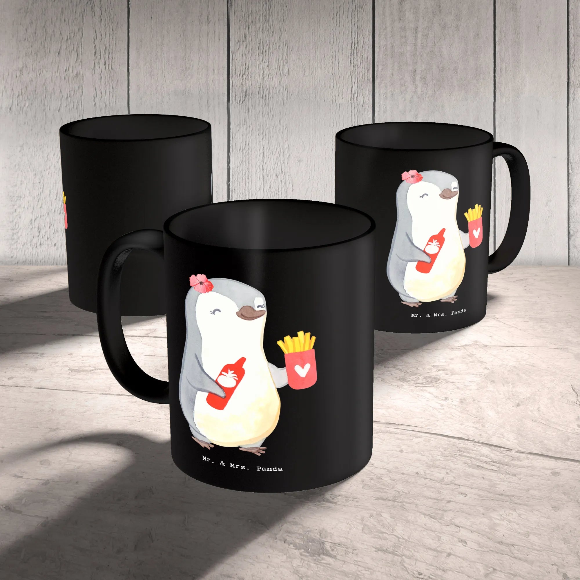 Pommesverkäuferin Pinguin Motiv – fröhliche Imbissverkäuferin mit Herz als Geschenk