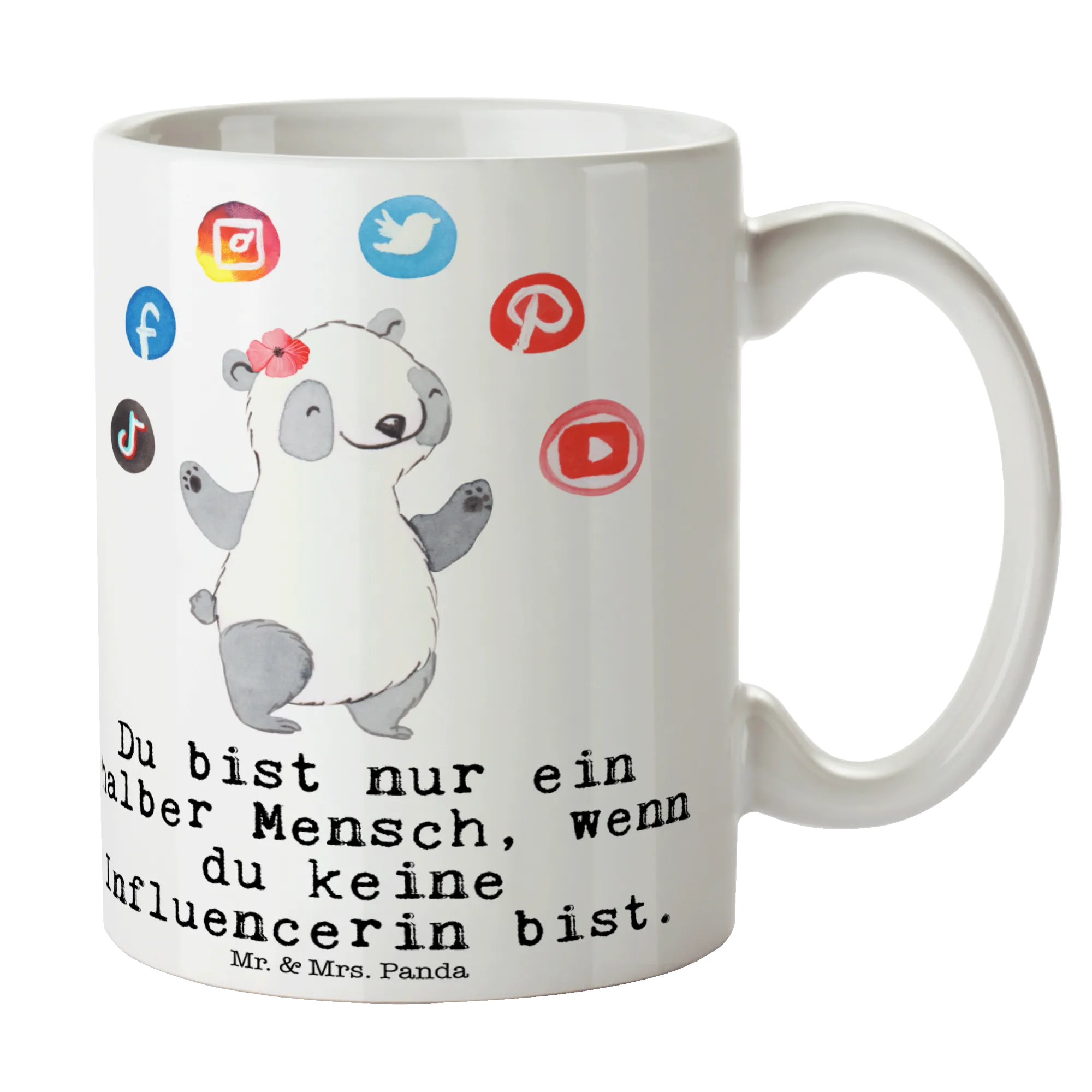 Hergestellt aus hochwertiger Keramik, zeigt die Tasse ein entzückendes Motiv: Ein süßer Panda, der vor einer Kamera sitzt und sich selbst filmt. Das Bild verkörpert das lebendige und kreative Leben eines Influencers und strahlt somit Freude und Lebensfreude aus. Der niedliche Slogan „Du bist nur ein halber Mensch, wenn du keine Influencerin bist“ rundet das Design ab und sorgt für ein Schmunzeln im Alltag.