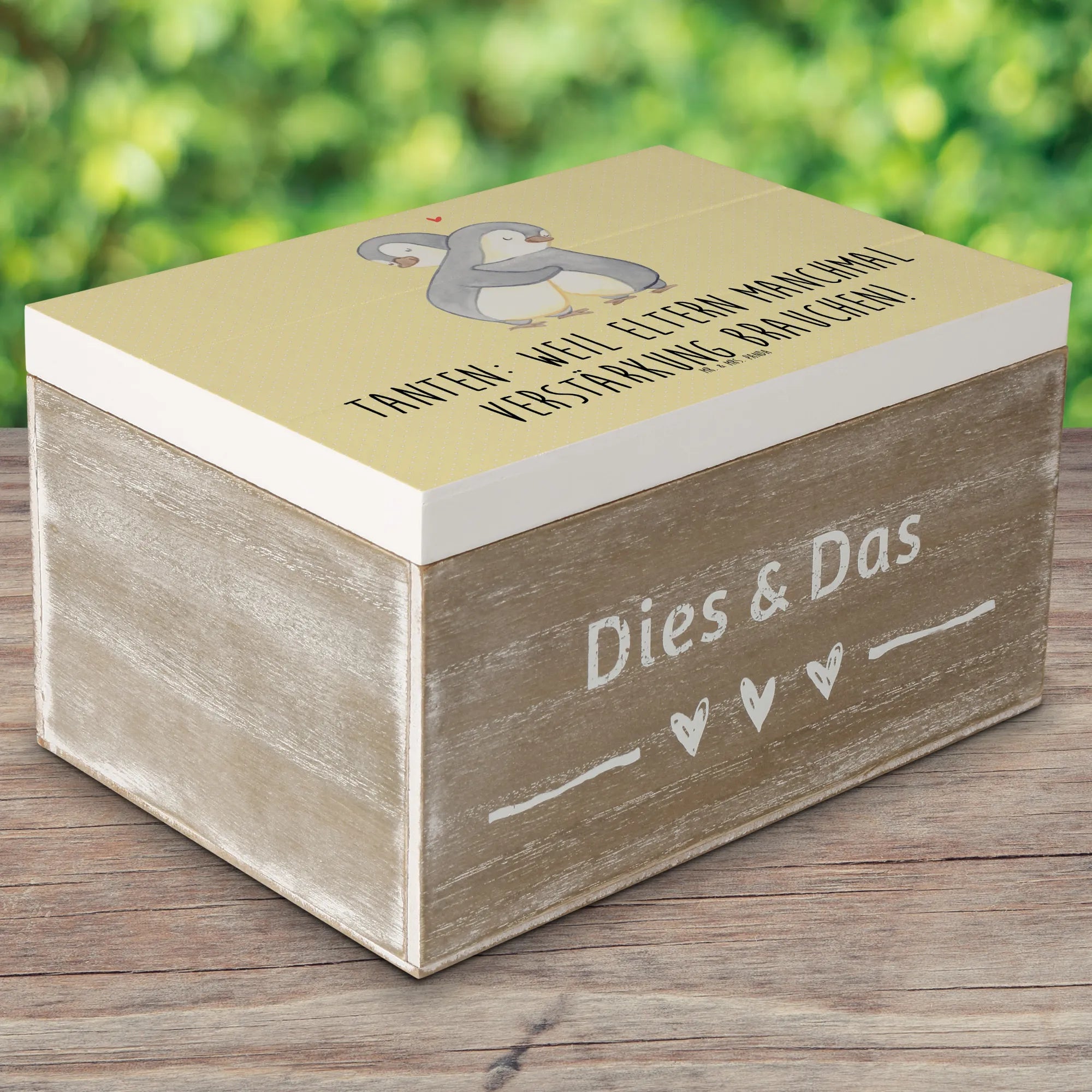 Die wunderschöne Holzkiste von Mr. & Mrs. Panda ist das perfekte Geschenk für deine Tante! Mit dem liebevollen Motiv und dem Spruch "Tanten: Weil Eltern manchmal Verstärkung brauchen!" wird diese Kiste nicht nur zum Aufbewahrungsort von besonderen Schätzen, sondern auch zu einem Symbol der Wertschätzung für all die lieben Tanten da draußen.