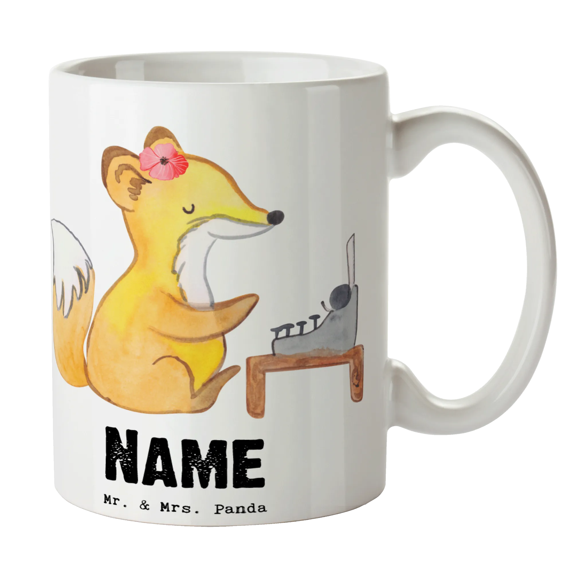 Diese wunderschöne, spülmaschinenfeste Keramiktasse von Mr. & Mrs. Panda wird mit deinem Wunschtext oder Namen brillant bedruckt und begleitet deine Arbeitskollegin jeden Tag im Büro oder zu Hause. Das süße Design zeigt einen Fuchs mit einer Blume im Haar, der fröhlich an einer Schreibmaschine arbeitet.