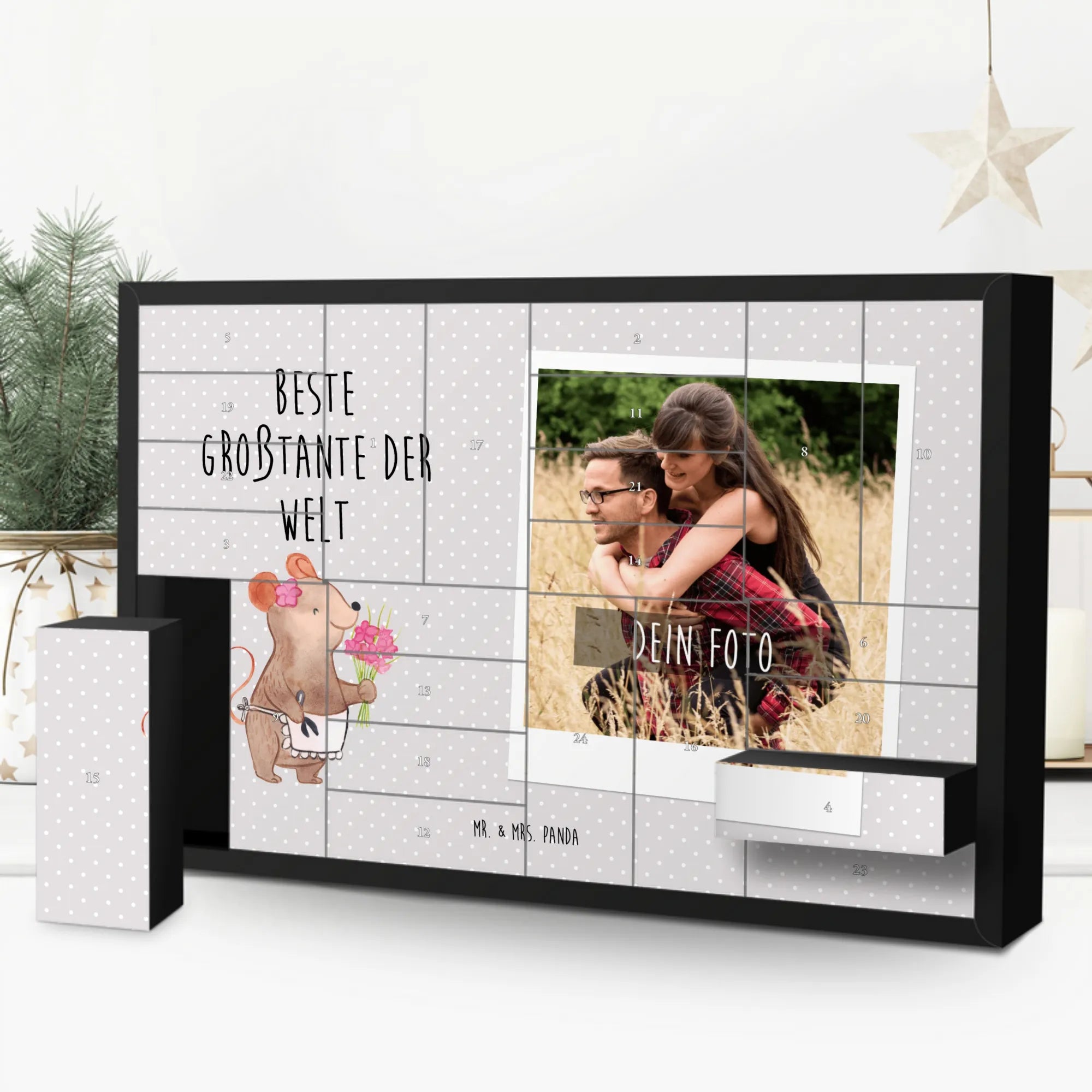 Foto Adventskalender personalisiert von Mr. & Mrs. Panda – mach Weihnachten persönlich und liebevoll! Dieser Adventskalender kombiniert die herzerwärmenden Sprüche und Motive von Mr. & Mrs. Panda mit deinem individuellen Foto auf der Vorderseite. Für ein optimales Druckergebnis lade bitte ein Foto in guter, hoher Auflösung hoch und achte auf den richtigen Bildausschnitt, damit nichts Wichtiges verloren geht. Nutze nur lizenzfreie oder von dir genehmigte Fotos. Die Front ist mit einer zauberhaften Mrs. Panda Zeichnung verziert, gedruckt auf einer seidenmatten Oberfläche in brillanter Qualität. Der Kalender besteht aus stabilem Adventskalender-Karton, bietet 24 Schachteln zum Selbstbefüllen und enthält eine Aufstellvorrichtung. Wichtig: Der Artikel wird ohne Füllung geliefert. Beachte außerdem, dass die Fotos nicht nachbearbeitet oder zugeschnitten werden – personalisierte Foto-Artikel sind vom Umtausch ausgeschlossen. Maße: 619 mm Breite • 405 mm Höhe • 50 mm Tiefe. Verschenke jeden Tag ein kleines Glück mit einem persönlichen Touch.