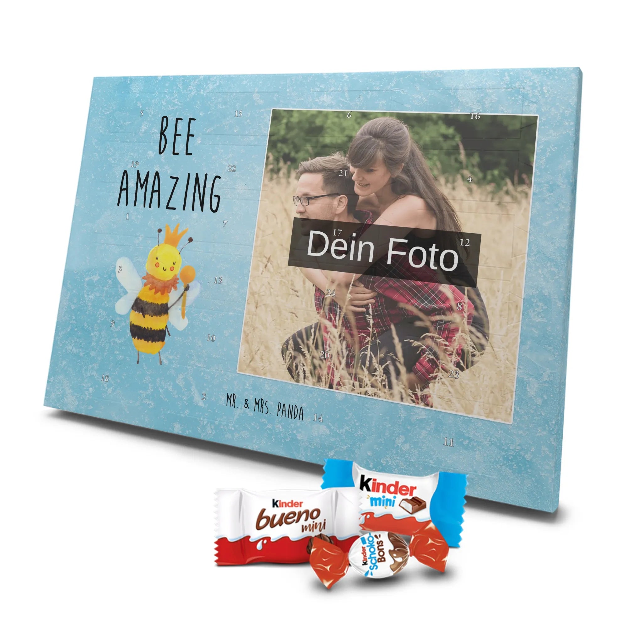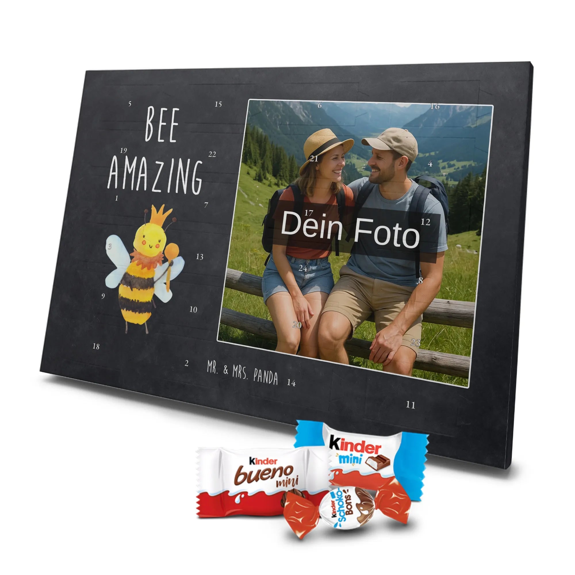 🐼 Personalisierter Schoko-Foto-Adventskalender mit deinem Bild, Mr. & Mrs. Panda Motiven und gefüllt mit kinder® Schokolade.
