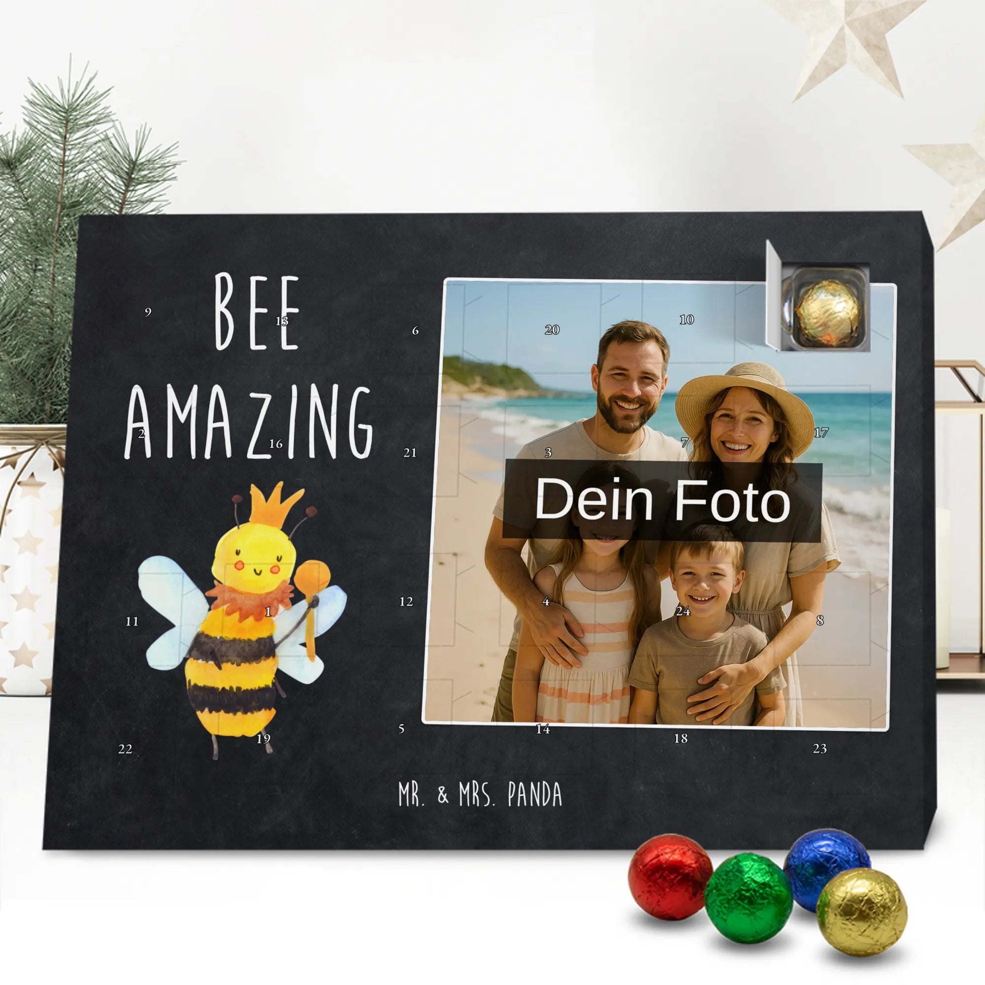 Liebevoll gestalteter Personalisierter Foto-Adventskalender von Mr. & Mrs. Panda – perfektes Geschenk für alle, die Weihnachten mit einer persönlichen Note mögen. Du erhältst einen Adventskalender, bedruckt mit unseren typischen Mr. & Mrs. Panda Motiven & Sprüchen, und kannst ein eigenes Foto einfügen. Bitte lade ein Foto in hoher Auflösung hoch und achte auf den Bildausschnitt, damit wichtige Gesichter und Details nicht verloren gehen. Verwende nur Bilder, für die du die Rechte besitzt oder eine Erlaubnis hast. Der Kalender überzeugt durch brillante Druckqualität, eine seidenmatte Oberflächenveredelung und bedruckte Seitenflächen. Maße: 233 mm x 178 mm x 24 mm. Besonderheit: Der Kalender kann aufgehängt oder aufgestellt werden. Hinweis: Die Fotos werden weder aufbereitet noch zugeschnitten; Rücknahme bei personalisierten Foto-Artikeln ist ausgeschlossen. Gefüllt mit MARKENNAMEN Schokolade und leckeren Schokoladenkugeln. Kann Spuren von Haselnüssen, Mandeln, Gluten und Soja enthalten. Kühl und trocken lagern. Ein emotionales, süßes Geschenk, das an jedem Adventstag Freude und Erinnerungen schenkt.