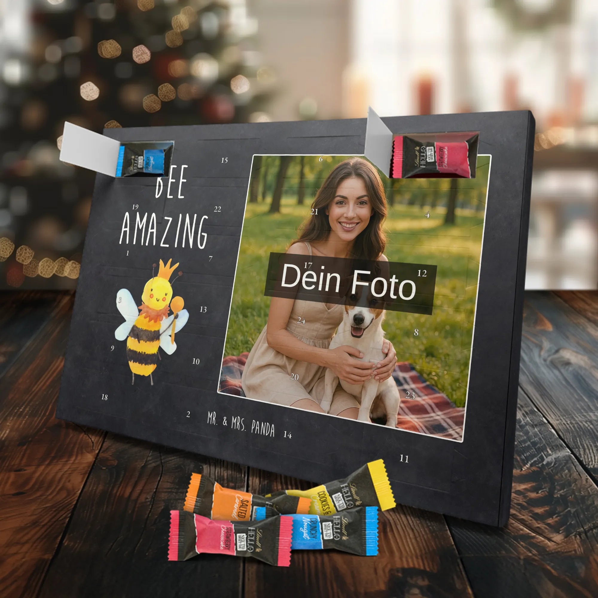 Verschenke Vorfreude: Unser individueller Foto-Adventskalender mit Schokolade von Mr. & Mrs. Panda macht jeden Dezembertag zum kleinen Fest. Der Kalender kombiniert bezaubernde Illustrationen und Sprüche von Mr. & Mrs. Panda mit deinem eigenen Foto – so entsteht ein ganz persönliches Geschenk. Achte auf Bildqualität und Bildausschnitt, damit das Foto optimal zur Geltung kommt, und nutze nur Bilder, für die du die Rechte besitzt. Die hochwertige seidenmatte Oberfläche mit bedruckten Seitenflächen veredelt das Design. Maße: 325 mm x 225 mm x 27 mm. Gefüllt mit Lindt Hello Schokolade: 24 einzeln verpackte Mini Sticks in den Sorten Karamell-Schokoladenkuchen, Kekse, Knuspriger Nougat und Erdbeer-Cheesecake. Zutaten und Allergene findest du auf der Verpackung; enthalten sind z. B. Milcheiweiß, Milchzucker, Soja, Weizen und Haselnüsse. Besonderheit: Du kannst den Kalender aufstellen oder an der Wand aufhängen. Bitte beachten: Die Fotos werden weder aufbereitet noch zugeschnitten – personalisierte Foto-Artikel sind vom Rückgaberecht ausgeschlossen. Hol dir ein Stück Adventszauber mit deinem persönlichen Foto-Adventskalender!