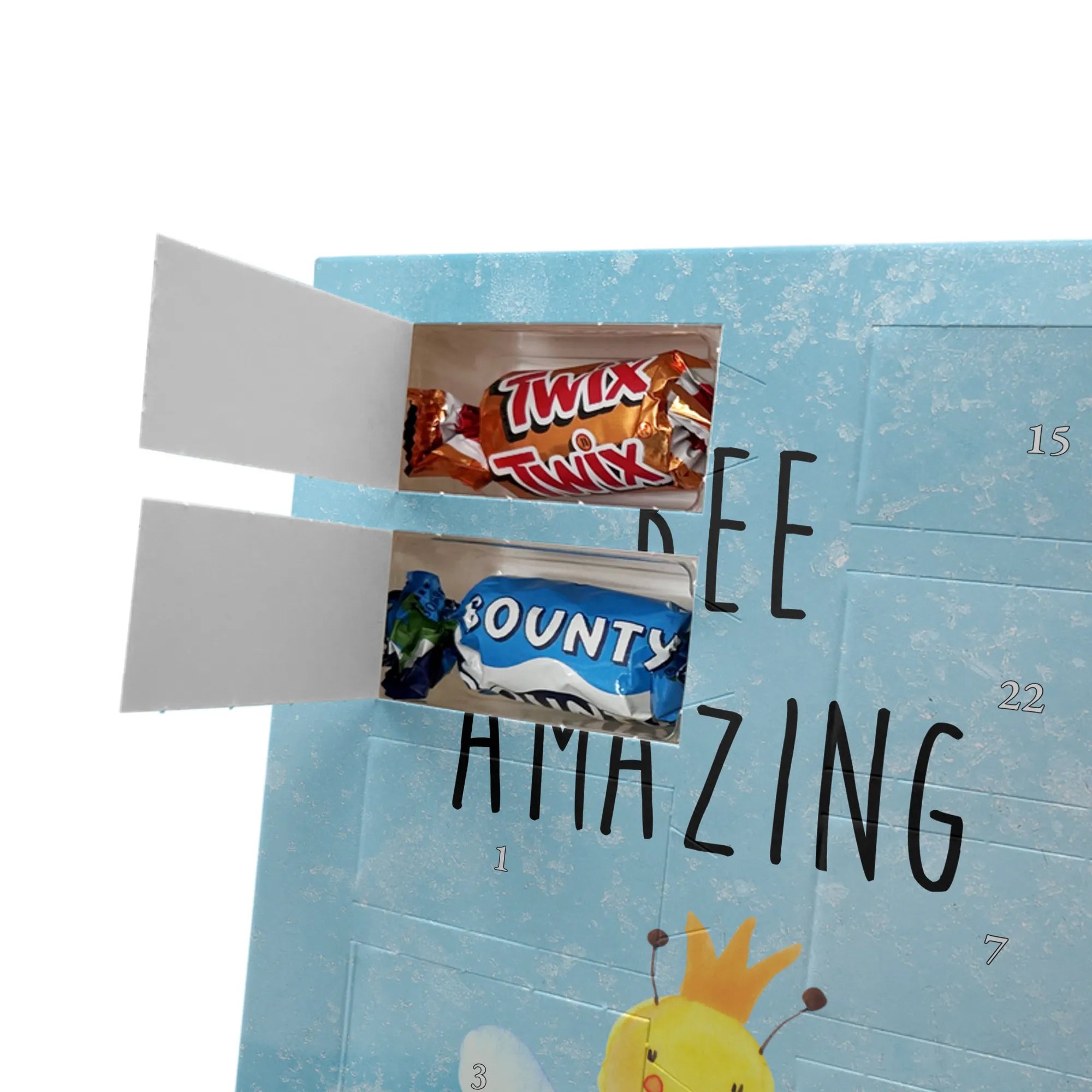 Wunderschöner Personalisierter Schoko Foto Adventskalender von Mr. & Mrs. Panda – perfekt, um die Vorweihnachtszeit mit Liebe und Süßem zu füllen! Dieser Adventskalender ist bedruckt mit liebevollen Motiven und kleinen Sprüchen von Mr. & Mrs. Panda und lässt sich ganz einfach mit deinem eigenen Foto personalisieren. Bitte achte darauf, dass dein Bild eine hohe Auflösung hat, damit das Druckergebnis klar und brillant wird. Wähle den richtigen Bildausschnitt, sodass keine wichtigen Details abgeschnitten werden – wir empfehlen, vorher den Kalender-Rahmen anzusehen, um die Platzierung zu prüfen. Lade nur Fotos hoch, bei denen du die Bildrechte besitzt oder die Erlaubnis zur Nutzung vorliegt, insbesondere wenn Personen darauf zu sehen sind. Die Druckqualität ist brillant mit seidenmatter Oberflächenveredelung, die Seitenflächen sind ebenfalls bedruckt und sorgen für einen stimmigen Look. Maße: 325 mm x 225 mm x 27 mm. Eine besondere Funktion: Du kannst den Kalender entweder aufhängen oder aufstellen – ganz wie du möchtest. Wichtiger Hinweis: Die Fotos werden weder aufbereitet noch zugeschnitten; deshalb ist eine Rücknahme bei personalisierten Foto-Artikeln ausgeschlossen. Der Adventskalender ist gefüllt mit Celebrations Schokolade – 24 hochwertige Celebrations-Füllungen in 8 verschiedenen Sorten (Maltesers, Mars, Snickers, Twix, Milky Way, Bounty, Galaxy, Galaxy Caramel). Ein liebevolles Geschenk, das persönliche Erinnerungen mit süßer Vorfreude vereint und jedem Türchen ein Lächeln schenkt.