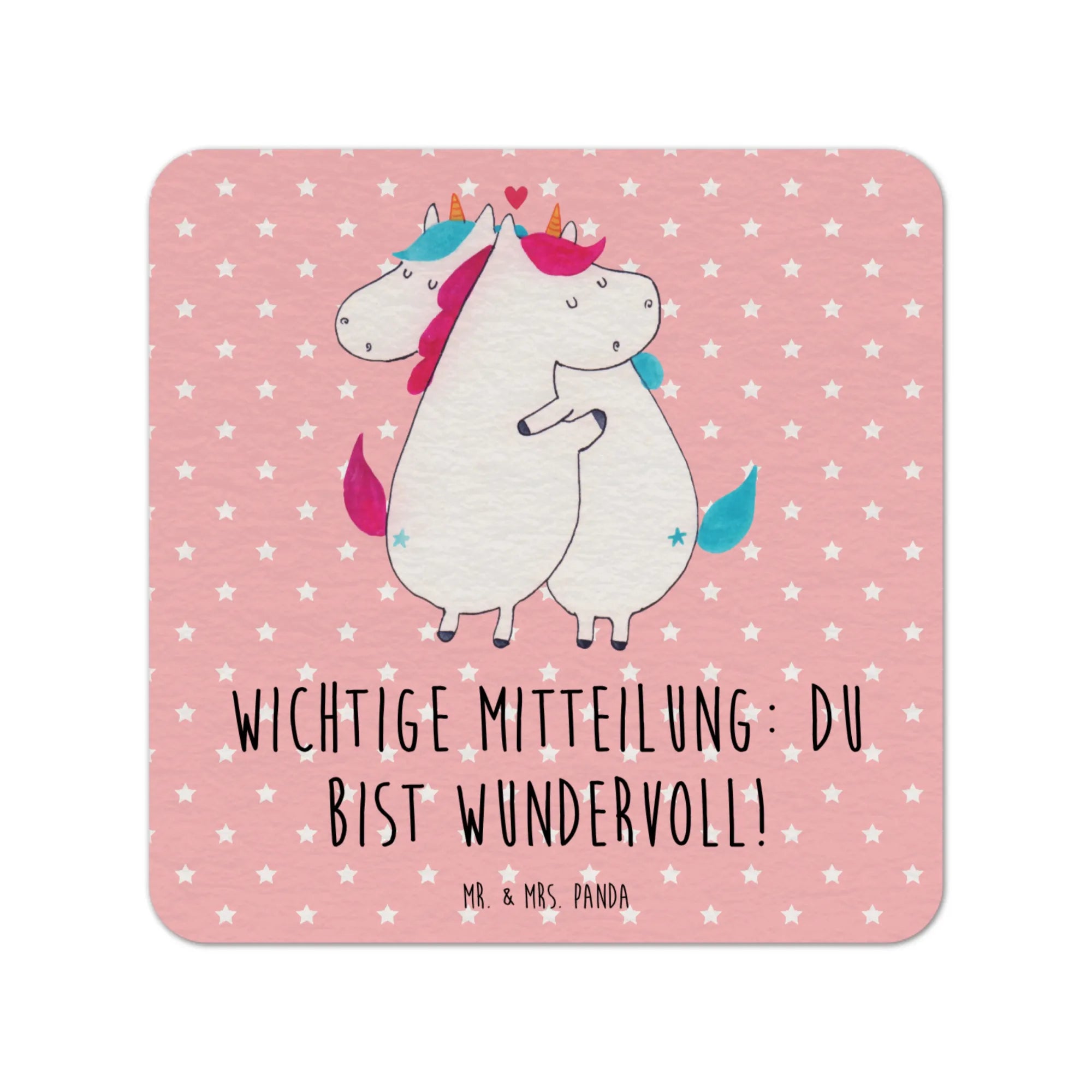 Die Bierdeckel sind aus hochwertigem Karton in Gastro-Qualität gefertigt und bieten nicht nur Schutz für deine Tische, sondern sorgen auch dafür, dass jeder Gast bei deinem Fest eine kleine Erinnerung an den schönen Abend mit nach Hause nimmt. Das zauberhafte Motiv mit zwei kuschelnden Einhörnern, die sich gegenseitig im Arm halten, bringt nicht nur Freude, sondern vermittelt auch eine wichtige Botschaft: "Wichtige Mitteilung: du bist wundervoll!" Diese süße Botschaft kann nie oft genug gesagt werden und wird die Herzen deiner Liebsten erwärmen.