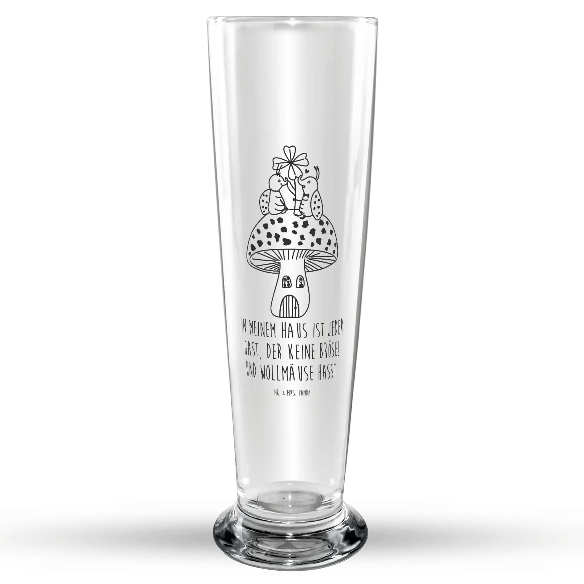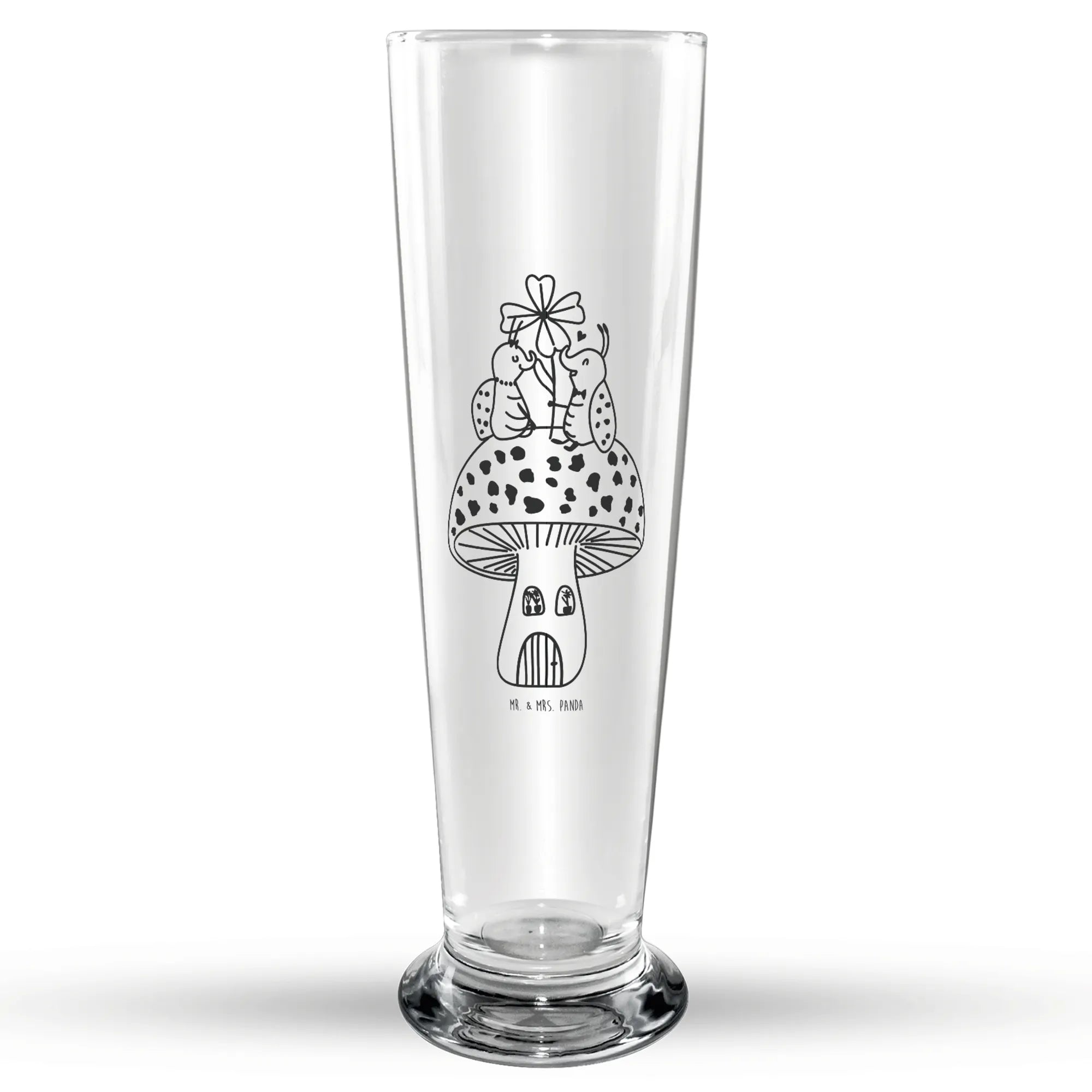Das Wunderschöne Bierglas mit dem süßen Motiv "Marienkäfer Paar Fliegenpilz" aus der Kollektion Small World von Mr. & Mrs. Panda ist das perfekte Geschenk für alle Bierliebhaber! Ob zum Vatertag, Geburtstag oder zur Feier eines besonderen Anlasses – dieses Glas bringt Freude und gute Laune ins Zuhause. Lass Dich von der wunderbaren Gravur verzaubern, die die beiden kleinen Marienkäfer auf ihrem Fliegenpilz zeigt. Sie verkörpern die Schönheit der Natur und die Fröhlichkeit des Lebens und sind somit ein ideales Geschenk für Deine Liebsten.