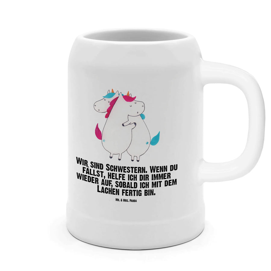 Der Bierkrug "Einhörner Umarmen" aus der zauberhaften Einhorn-Kollektion von Mr. & Mrs. Panda ist das perfekte Geschenk für deine Schwester oder beste Freundin! Mit einem spritzigen Design und dem liebevollen Spruch "Wir sind Schwestern. Wenn du fällst, helfe ich dir immer wieder auf, sobald ich mit dem Lachen fertig bin." bringt dieser Bierkrug nicht nur Farbe in jeden Biergarten, sondern auch Freude in jede Runde. Der robuste Steingutkrug fasst 500 ml, ideal für einen kühlen Schluck während sommerlicher Feiern oder gemütlicher Abende mit Freunden.