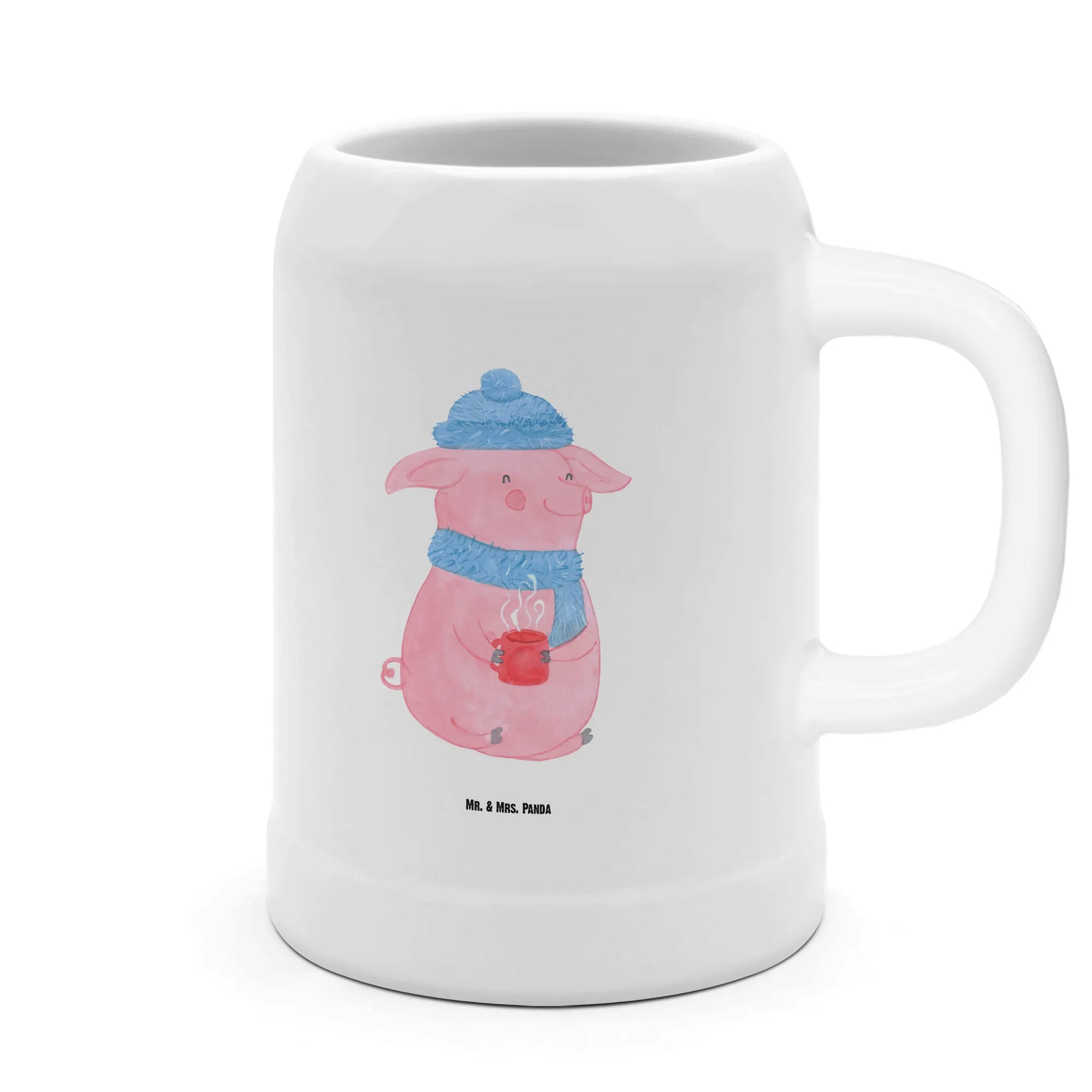 Auf dem Krug prangt unser fröhliches, rosa Glühschwein, das mit warmer Winterkleidung, einschließlich einer blauen Mütze und einem passenden Schal, versehen ist. In seinen Händen hält das Schwein eine dampfende Tasse, die das Gefühl von Gemütlichkeit und Wärme perfekt einfängt.