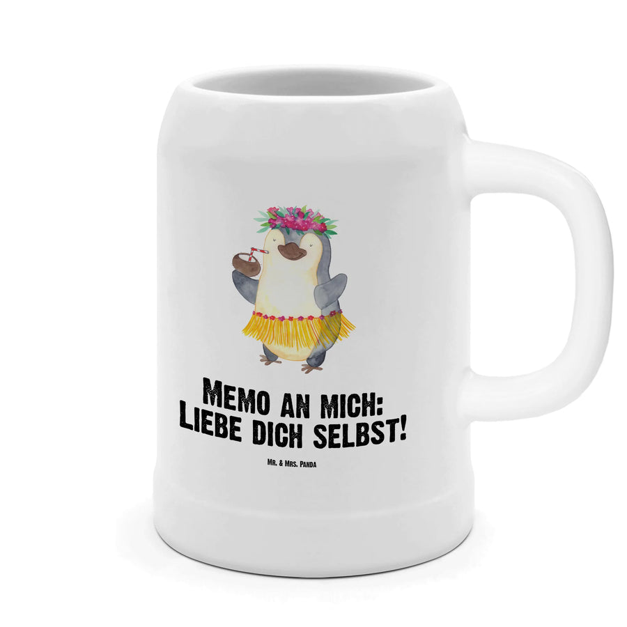 Die liebevoll gestaltete Motive zeigen einen tanzenden Pinguin mit einer Kokosnuss, der am Strand Sonne tankt. 🌴 Dieser Bierkrug strahlt gute Laune und Urlaubsfeeling aus, perfekt, um jeden Festtag oder gemütlichen Abend zu verschönern. Er erinnert daran, das Leben zu genießen und sich selbst zu lieben, was durch den Spruch "Memo an mich: Liebe dich selbst!" unterstrichen wird.